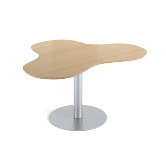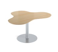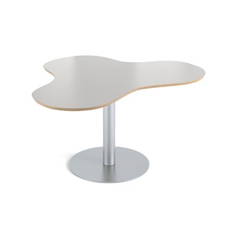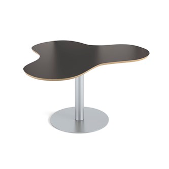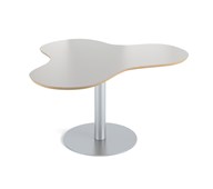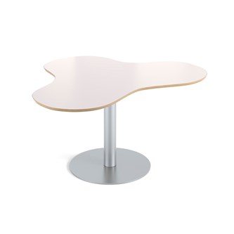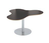 Praktiskt bord i klöverform som gör att många får plats. Passar bra t.ex. i ett makerspace. Skiva i högtryckslaminat. Höj- och sänkbart med gaspatron. Mått: L153xB120xH68-109 cm.