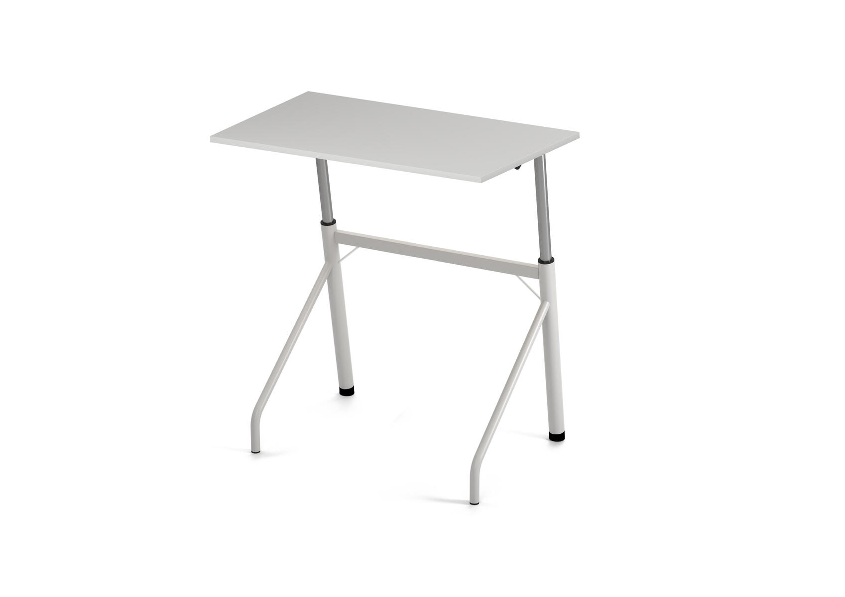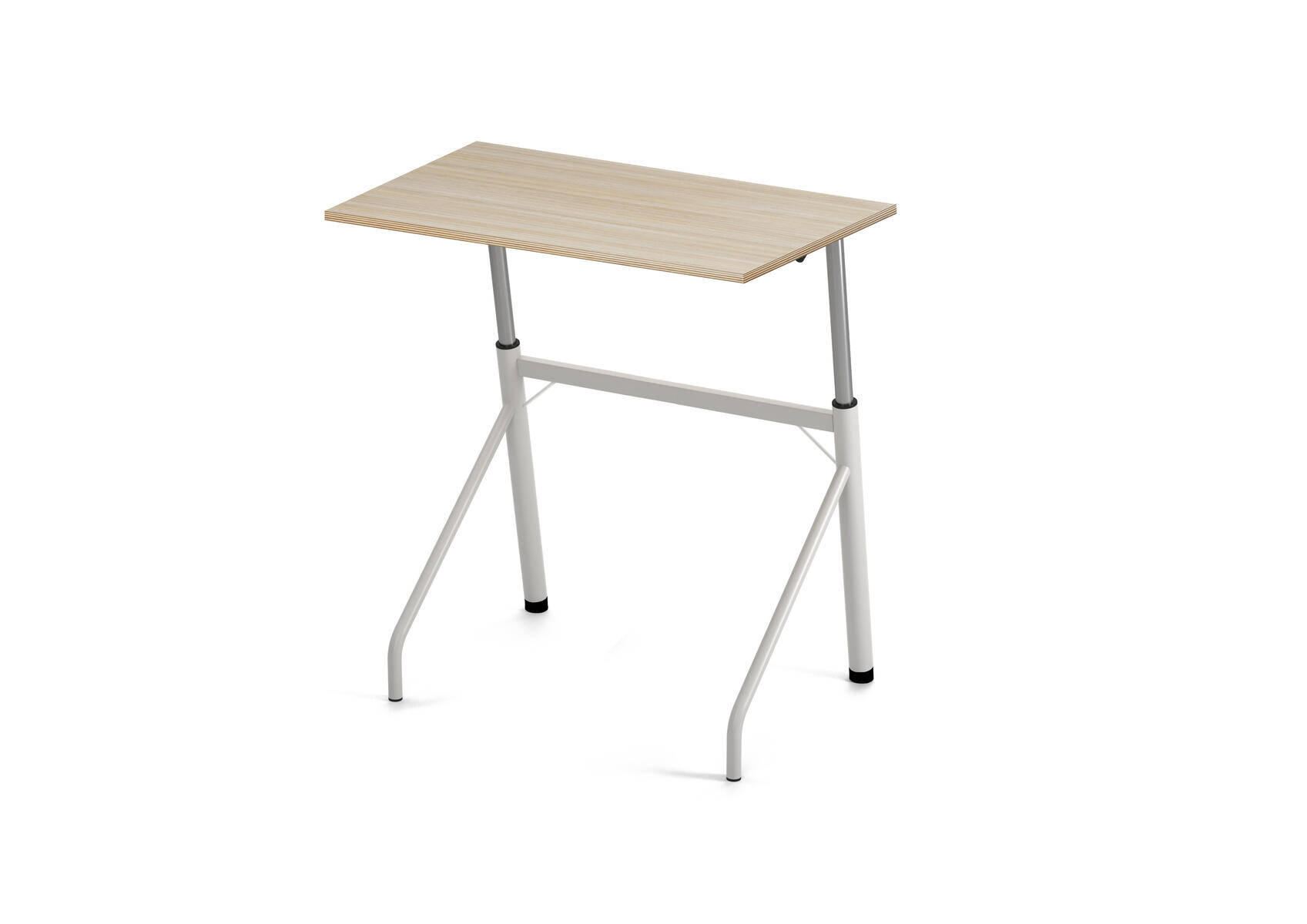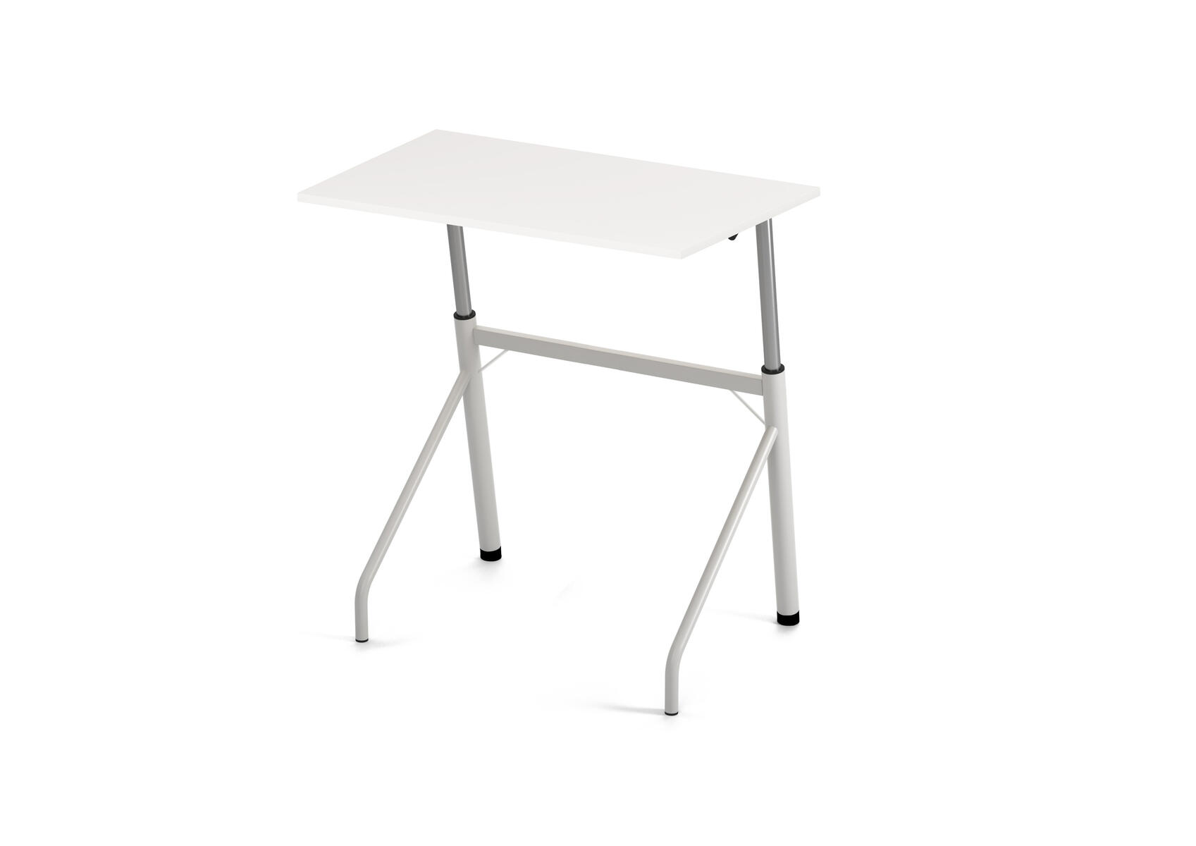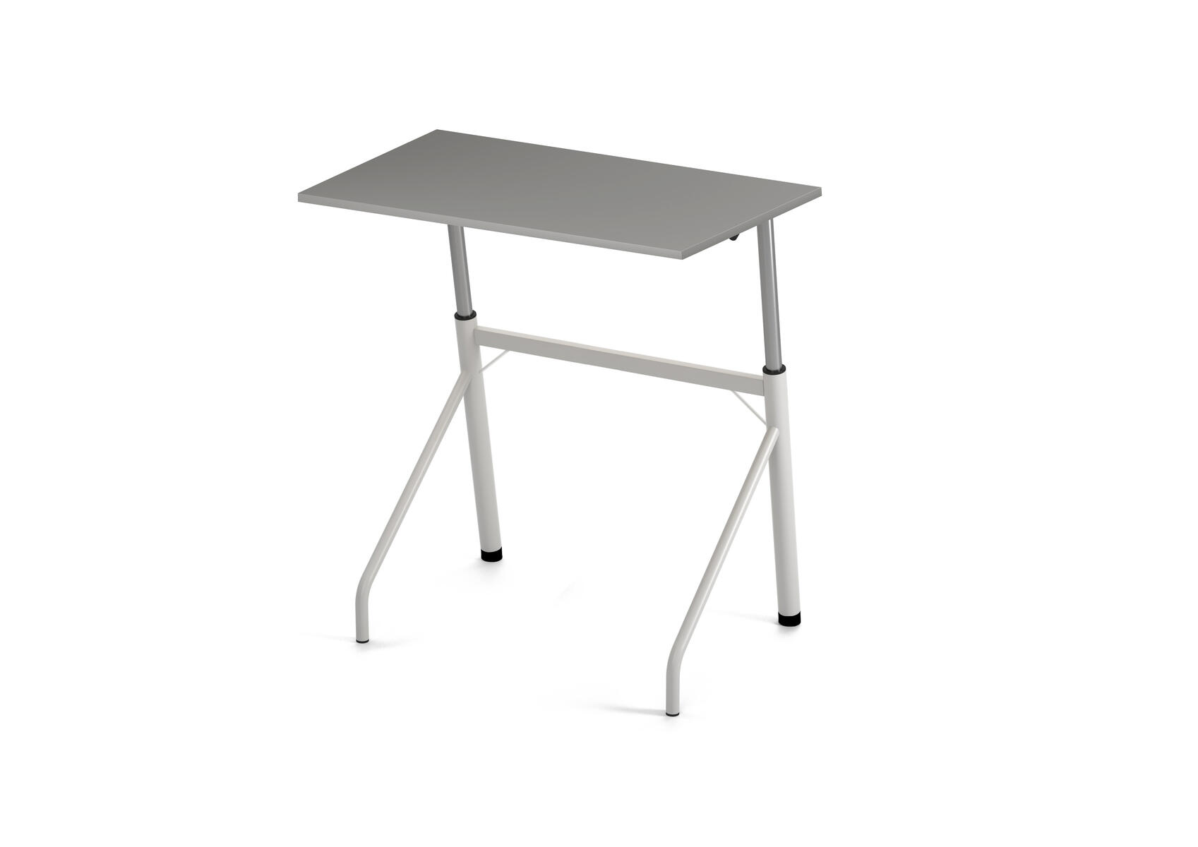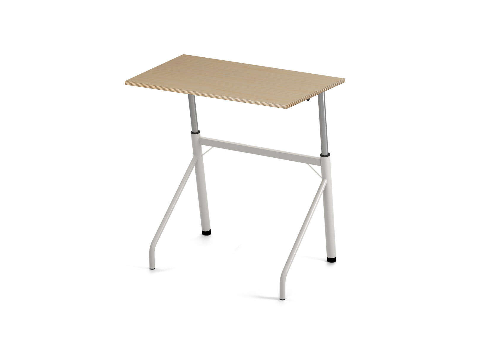 Ett höj- & sänkbart elevbord 71-111 cm. Gaskolven regleras via en spak vid sidan. Ställbara tassar på de bakre benen. Välj mellan ställbara tassar och hjul på de främre benen. Den övre delen på stativet är kromat och undre delen är pulverlackad. Väskkrok finns monterad i stativet, dold under bordsskivan. Bordsskiva i akustiklaminat.