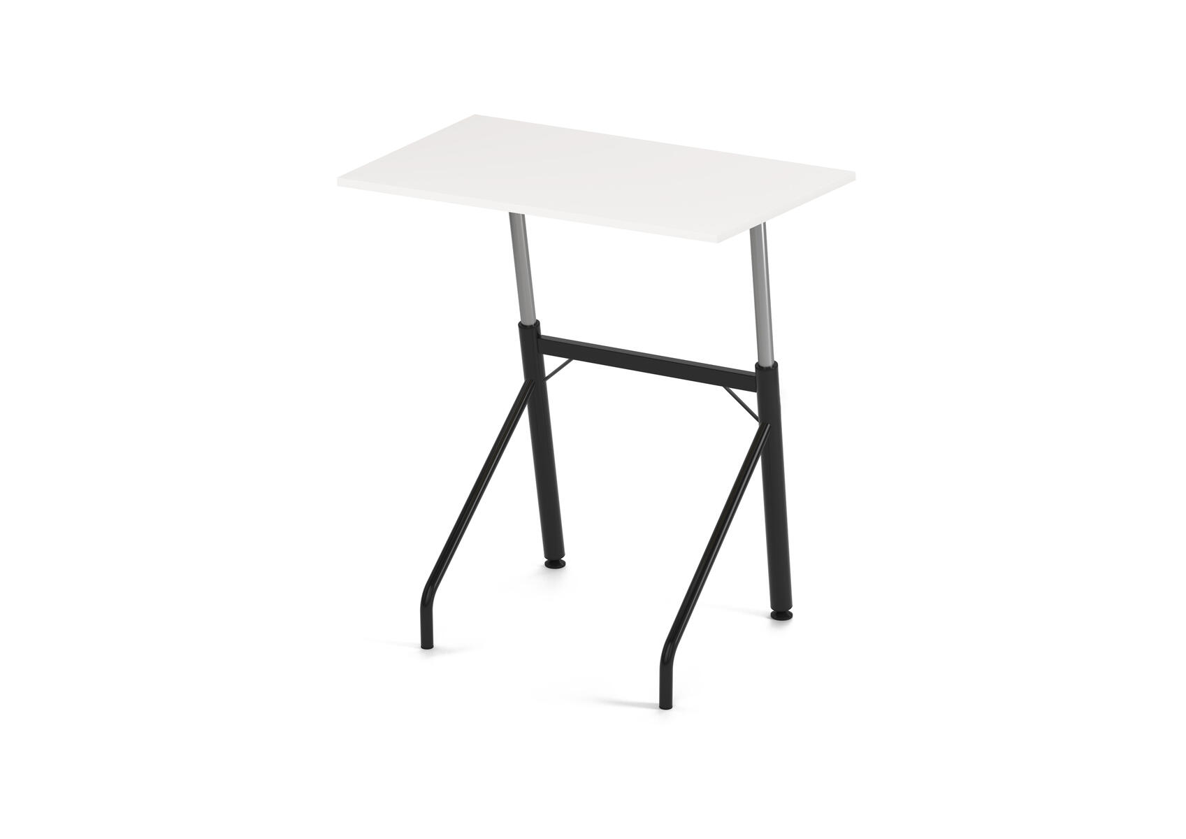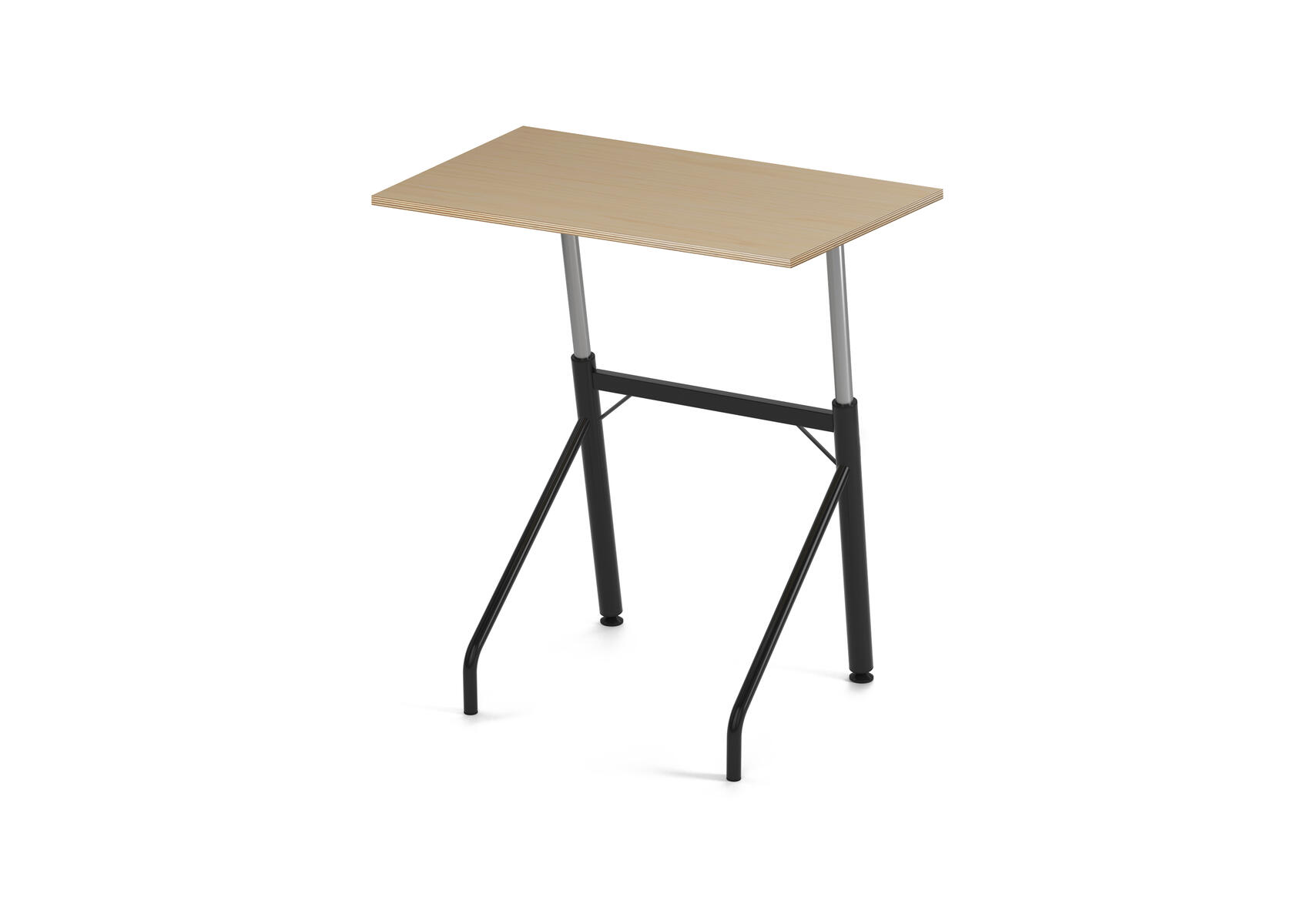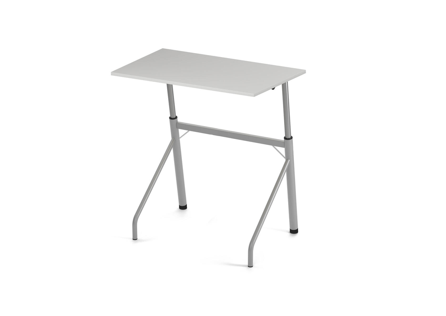 Ett höj- & sänkbart elevbord 71-111 cm. Gaskolven regleras via en spak vid sidan. Ställbara tassar på de bakre benen. Välj mellan ställbara tassar och hjul på de främre benen. Den övre delen på stativet är kromat och undre delen är pulverlackad. Väskkrok finns monterad i stativet, dold under bordsskivan. Bordsskiva i akustiklaminat.
