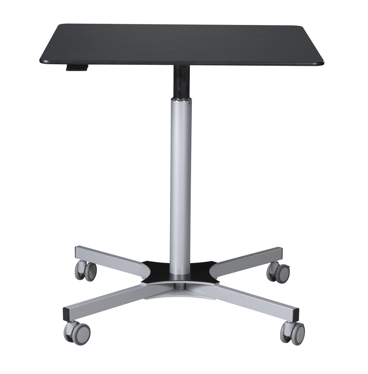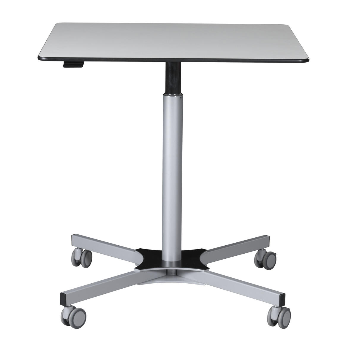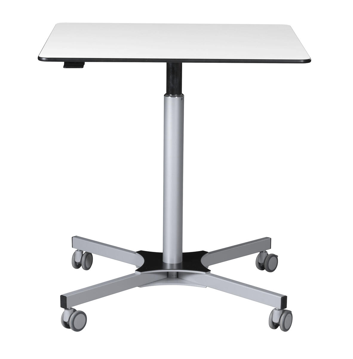 Ett höj- och sänkbart bord med fällbar skiva. Fäll skivan och rulla undan när plats behövs till annat. Höjd justeras smidigt med gasfjäder 73–118 cm. Vitlackerat stålrör i RAL 9016. 2 låsbara hjul. Skivan har måttet 65x65 cm och är i högtryckslaminat.
