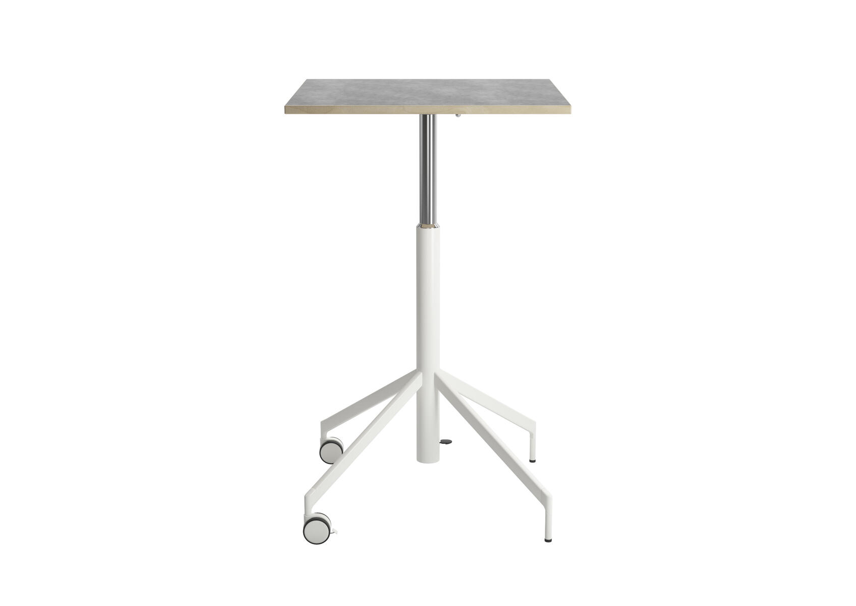 Ett höj- och sänkbart bord med fällbar skiva. Fäll skivan och rulla undan när plats behövs till annat. Höjd justeras smidigt med gasfjäder 73–118 cm. Vitlackerat stålrör i RAL 9016. 2 låsbara hjul. Skivan har måttet 65x65 cm och är i akustik linoleum.
