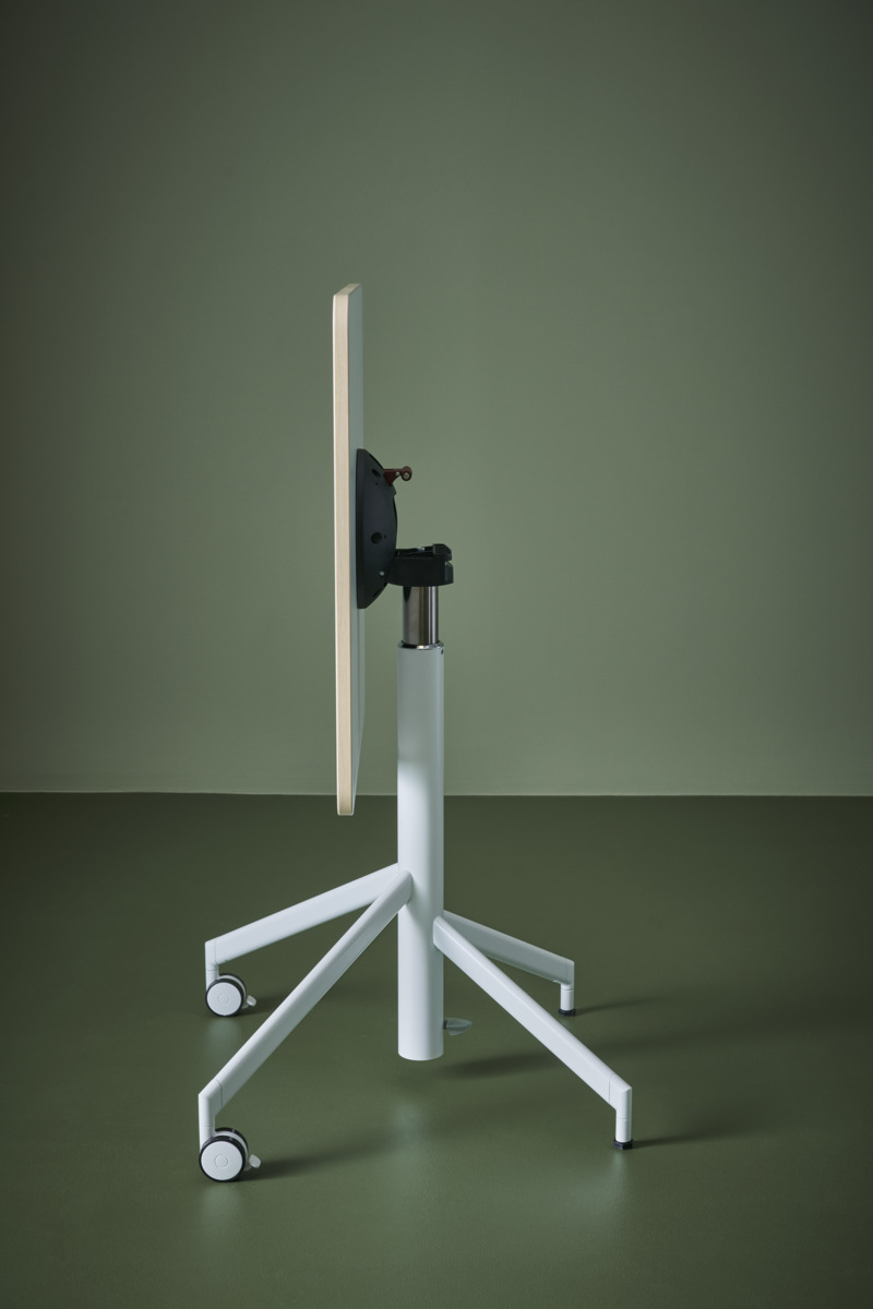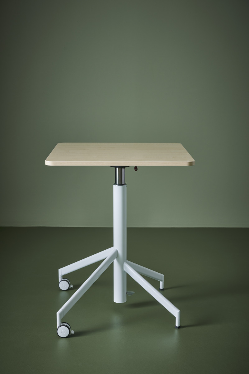 Ett höj- och sänkbart bord med fällbar skiva. Fäll skivan och rulla undan när plats behövs till annat. Höjd justeras smidigt med gasfjäder 73–118 cm. Vitlackerat stålrör i RAL 9016. 2 låsbara hjul. Skivan har måttet 65x65 cm och är i akustik linoleum.