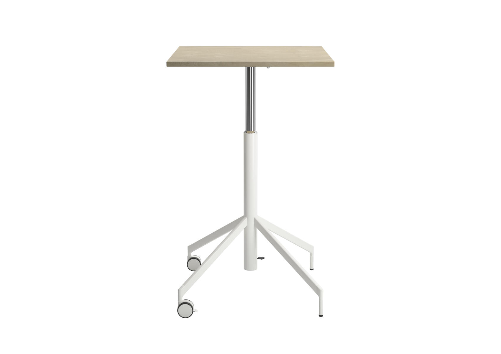 Ett höj- och sänkbart bord med fällbar skiva. Fäll skivan och rulla undan när plats behövs till annat. Höjd justeras smidigt med gasfjäder 73–118 cm. Vitlackerat stålrör i RAL 9016. 2 låsbara hjul. Skivan har måttet 65x65 cm och är i högtryckslaminat.