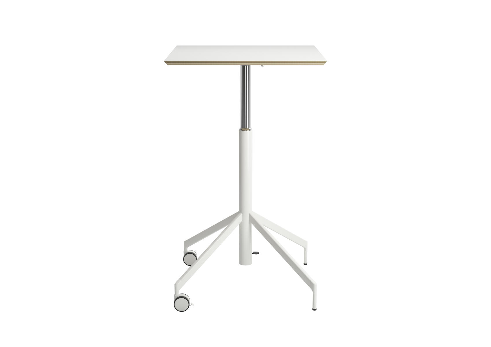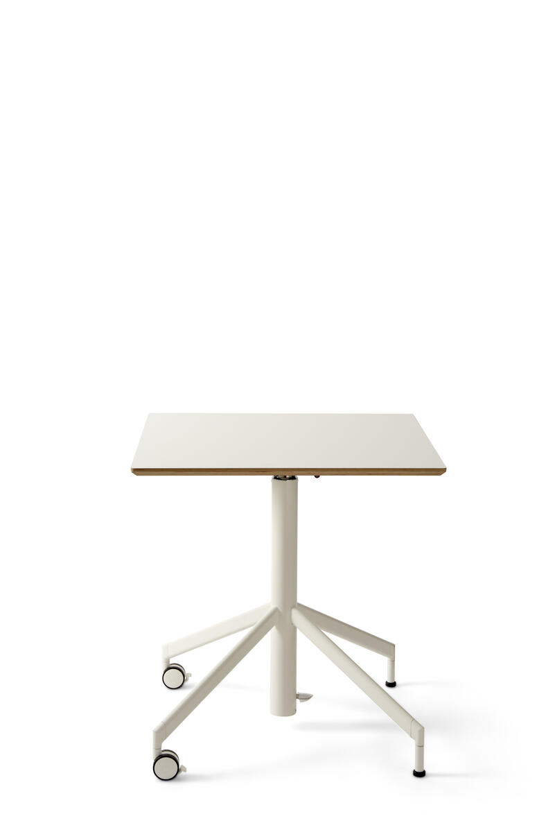 Ett höj- och sänkbart bord med fällbar skiva. Fäll skivan och rulla undan när plats behövs till annat. Höjd justeras smidigt med gasfjäder 73–118 cm. Vitlackerat stålrör i RAL 9016. 2 låsbara hjul. Skivan har måttet 65x65 cm och är i högtryckslaminat.