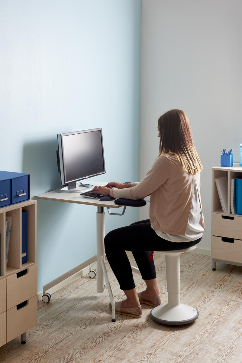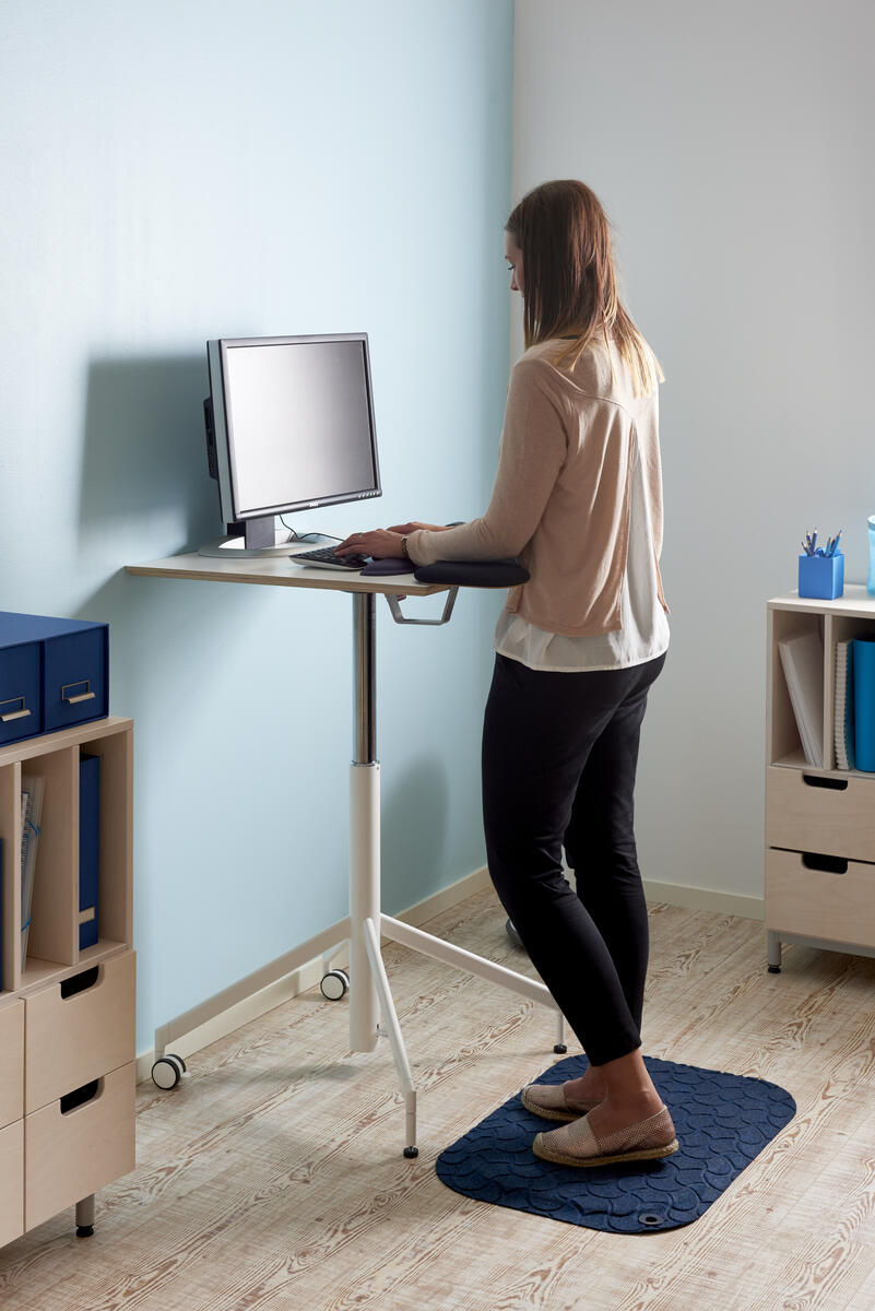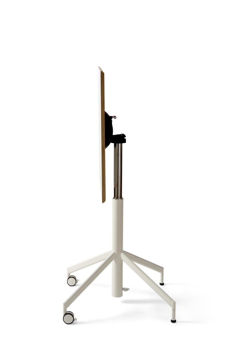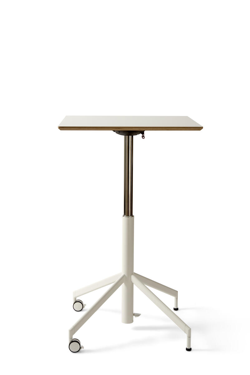 Ett höj- och sänkbart bord med fällbar skiva. Fäll skivan och rulla undan när plats behövs till annat. Höjd justeras smidigt med gasfjäder 73–118 cm. Vitlackerat stålrör i RAL 9016. 2 låsbara hjul. Skivan har måttet 65x65 cm och är i akustik linoleum.