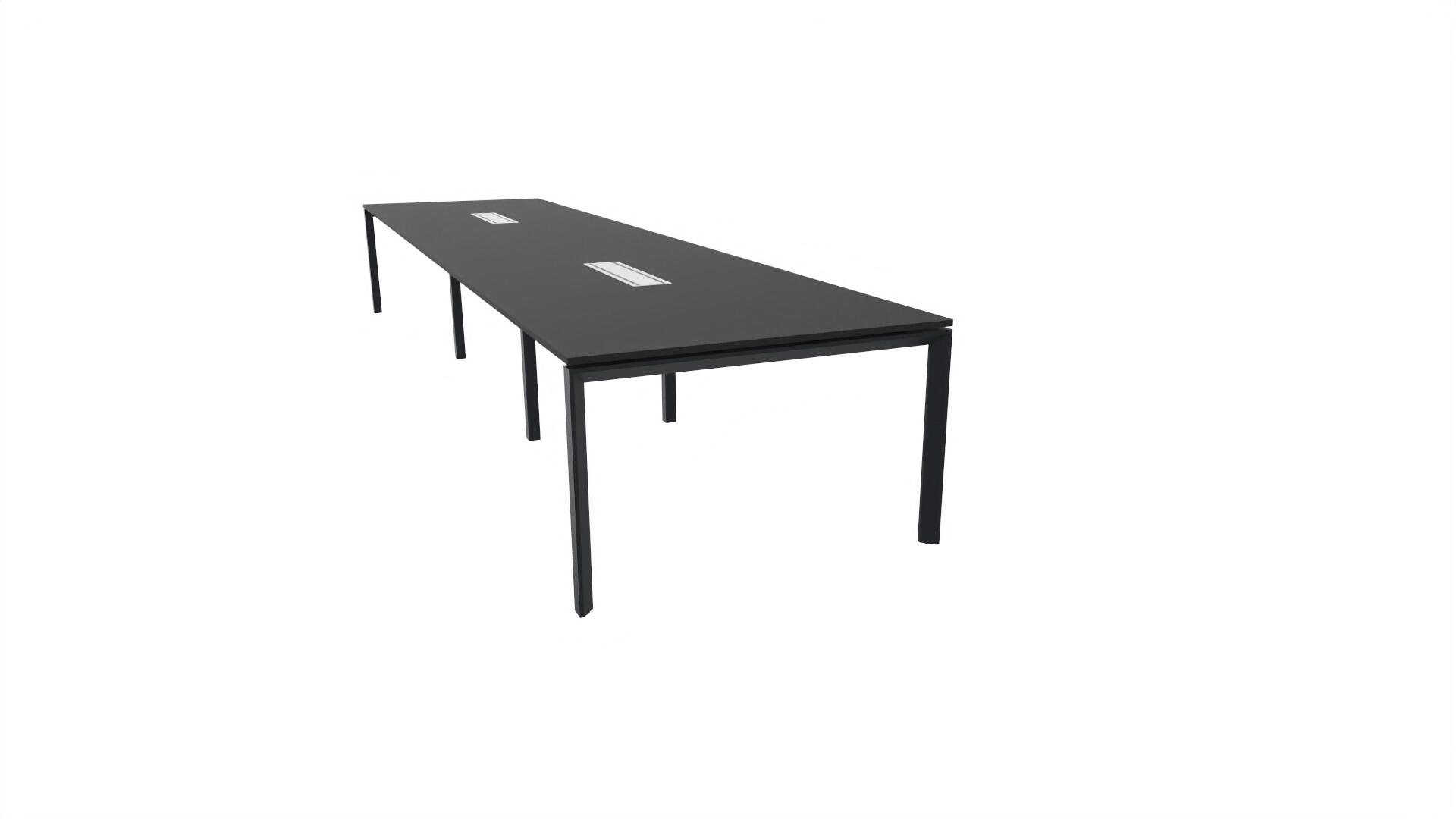 Ett konferensbord med rektangulär skiva, rak kant. Kärna av spånskiva klädd med laminat och ABS-kantband. Underrede SQB. Förutom vanligt standardlaminat, finns bordet även med ett svart nanolaminat som har en yta som är matt och resistent mot fingeravtryck. Som tillval kan du även välja att få två st mediaboxar (32x15 cm) infällda i bordet. Varje mediabox består av 2x 230V eluttag, 1x USB och 1x HDMI.