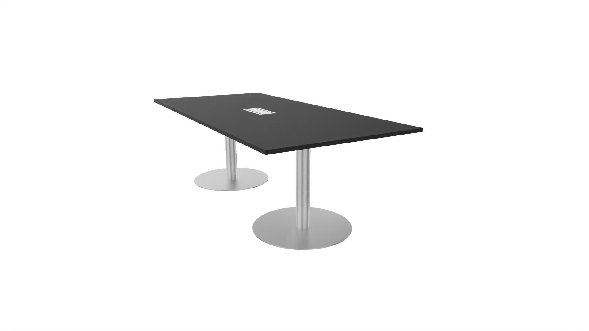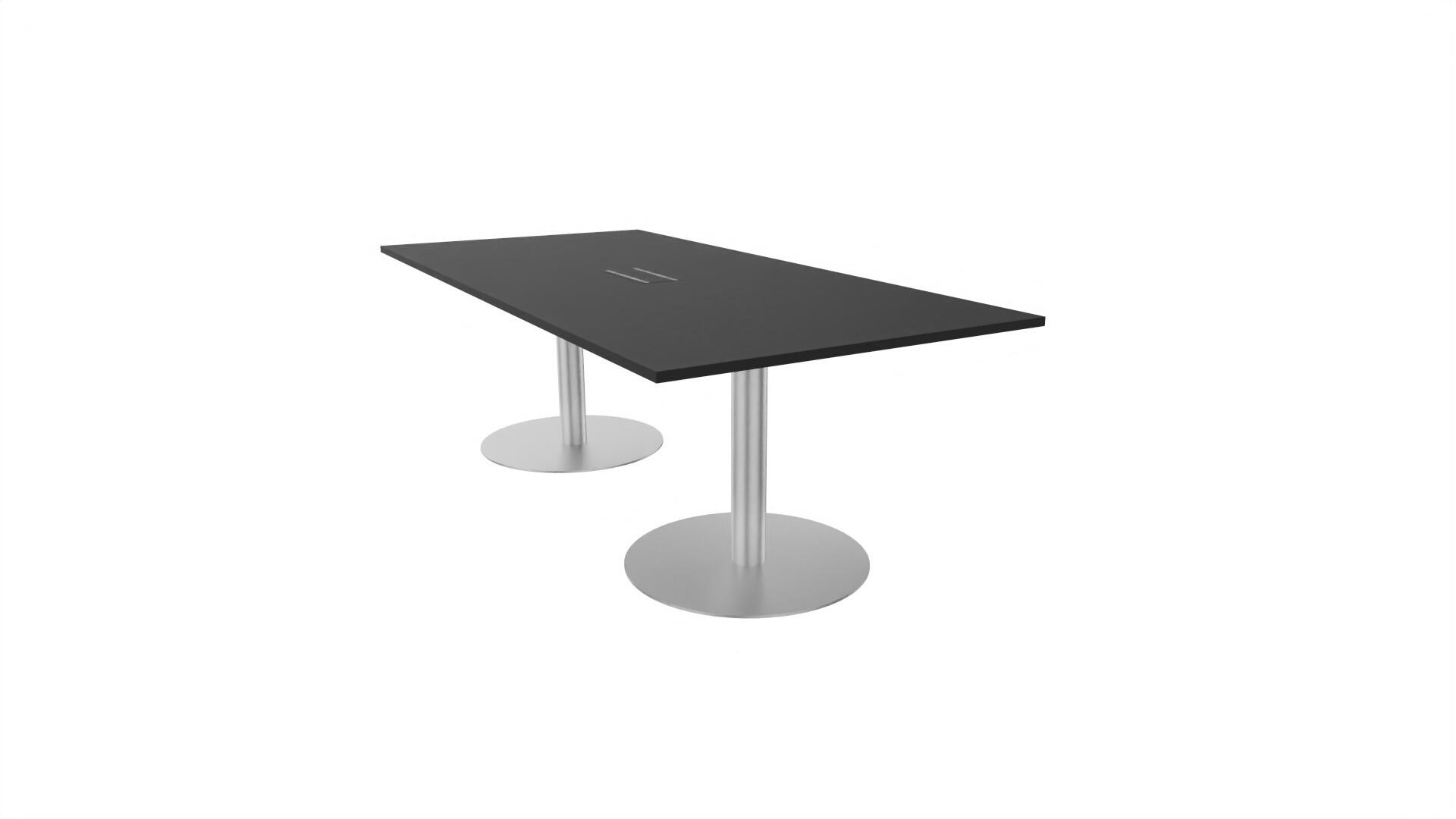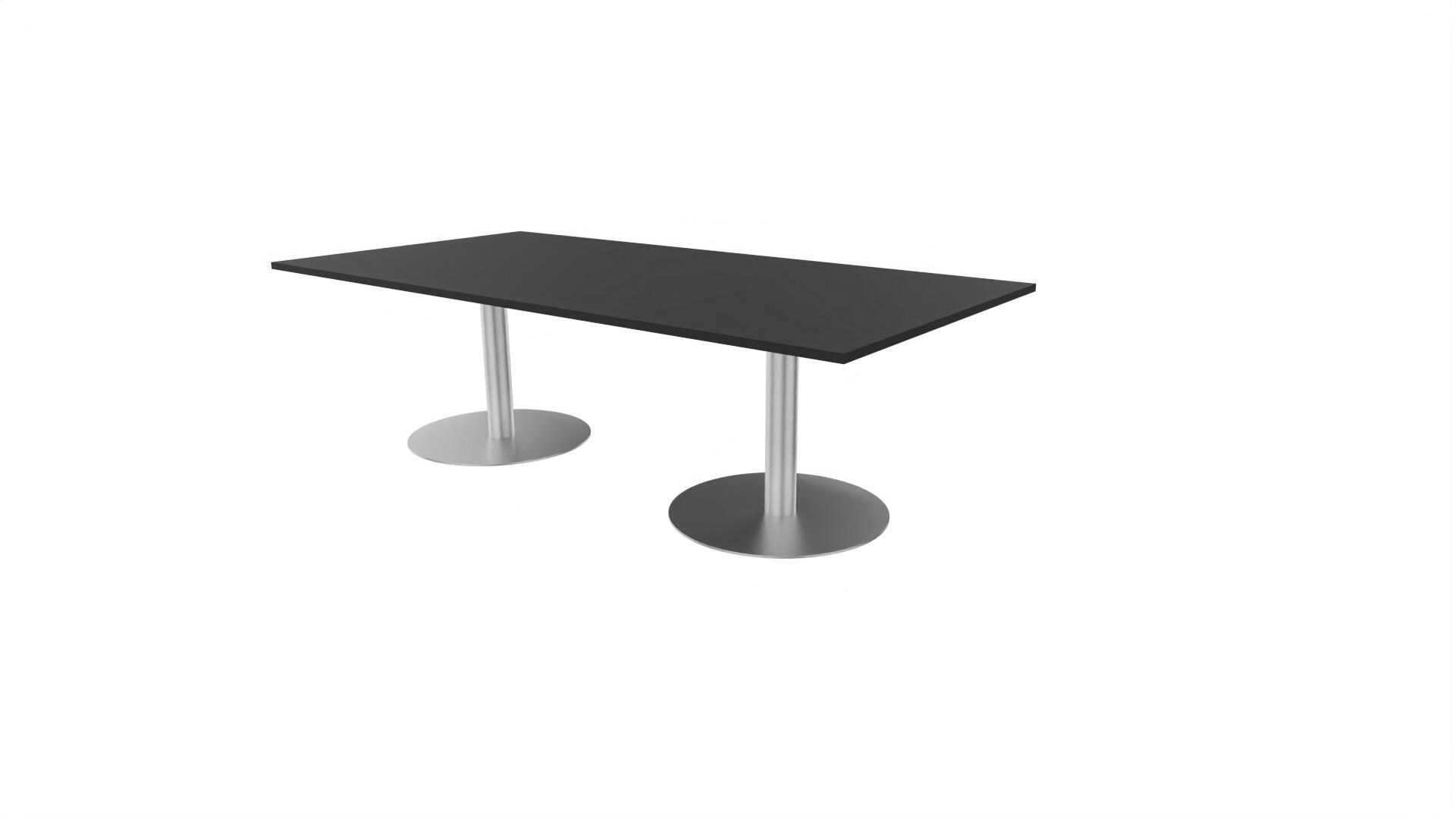 Ett konferensbord med rektangulär skiva, rak kant. Kärna av spånskiva klädd med laminat och ABS-kantband. Underrede pelarstativ med 2 ben, pelardiameter: ø 10,2 cm, fotdiamenter: ø 72 cm. Förutom vanligt standardlaminat, finns bordet även med ett svart nanolaminat som har en yta som är matt och resistent mot fingeravtryck. Som tillval kan du även välja att få två st mediaboxar (32x15 cm) infällda i bordet. Varje mediabox består av 2x 230V eluttag, 1x USB och 1x HDMI.