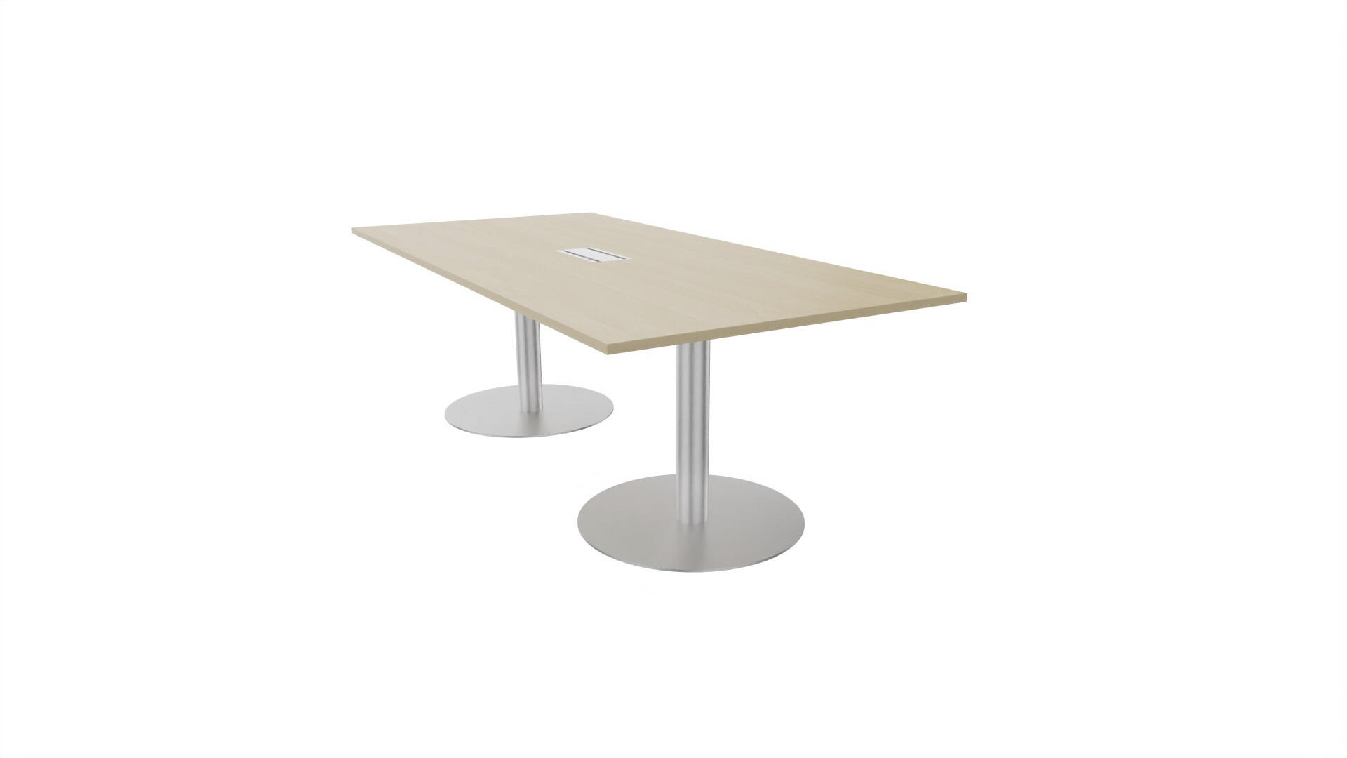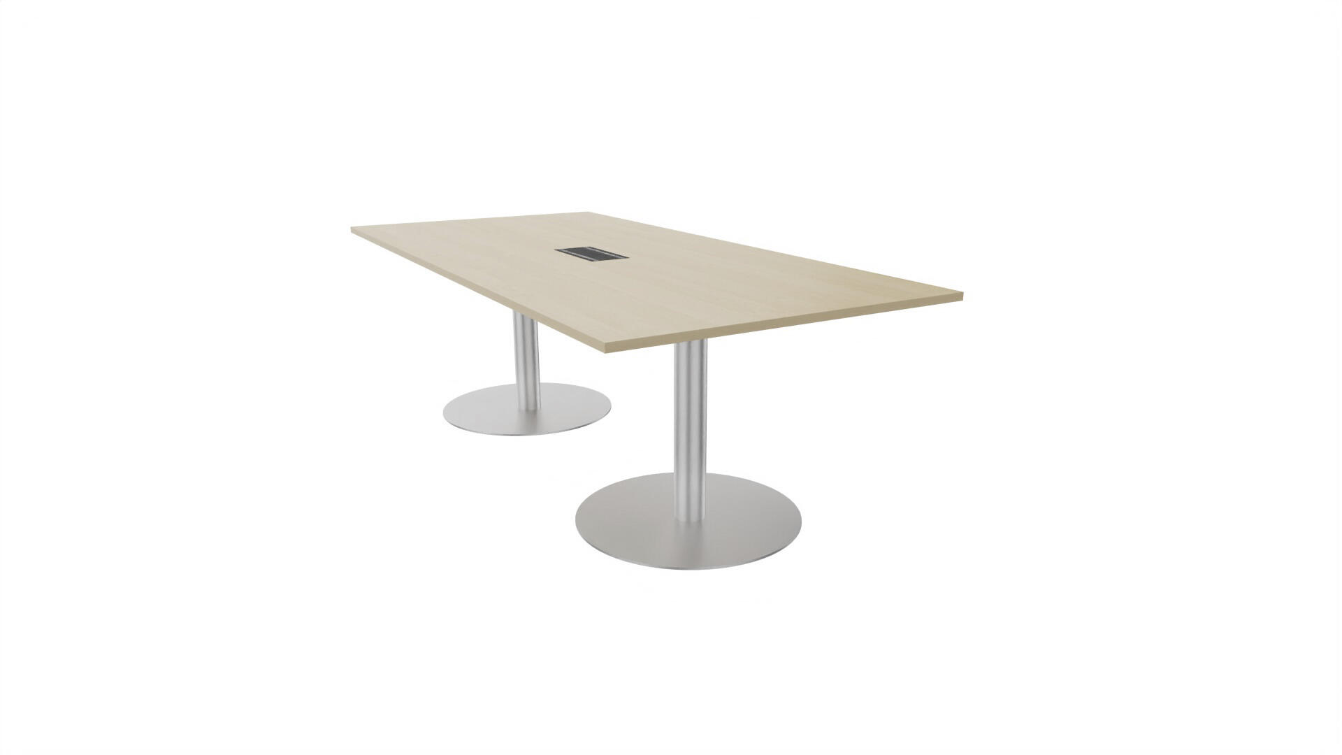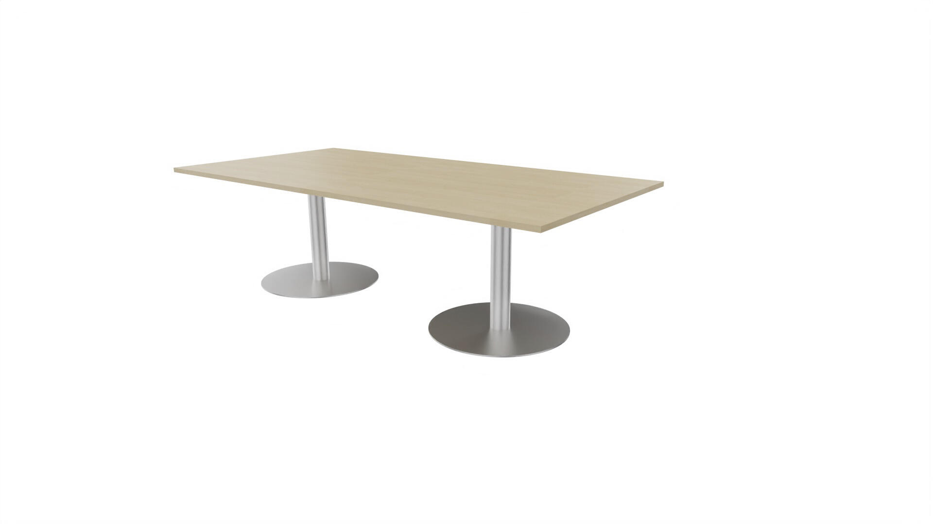 Ett konferensbord med rektangulär skiva, rak kant. Kärna av spånskiva klädd med laminat och ABS-kantband. Underrede pelarstativ med 2 ben, pelardiameter: ø 10,2 cm, fotdiamenter: ø 72 cm. Förutom vanligt standardlaminat, finns bordet även med ett svart nanolaminat som har en yta som är matt och resistent mot fingeravtryck. Som tillval kan du även välja att få två st mediaboxar (32x15 cm) infällda i bordet. Varje mediabox består av 2x 230V eluttag, 1x USB och 1x HDMI.