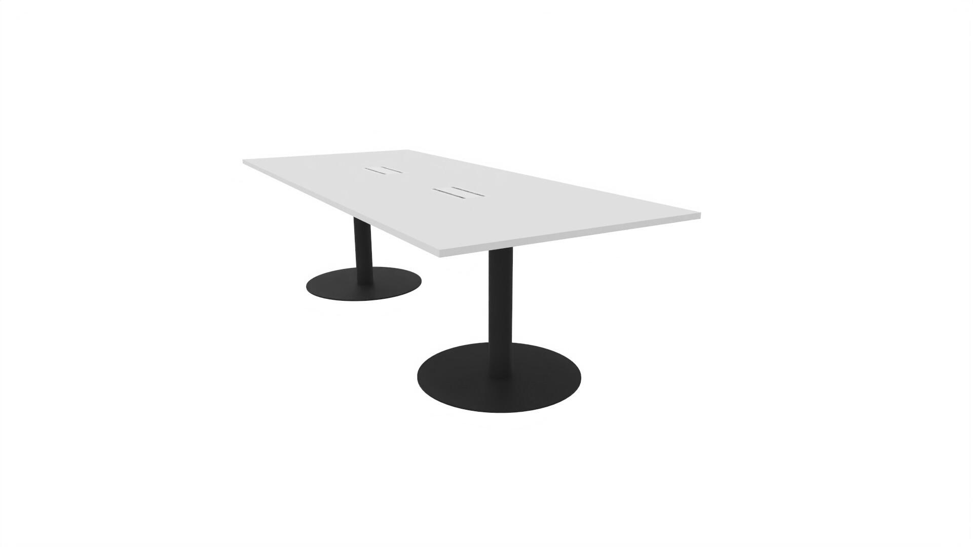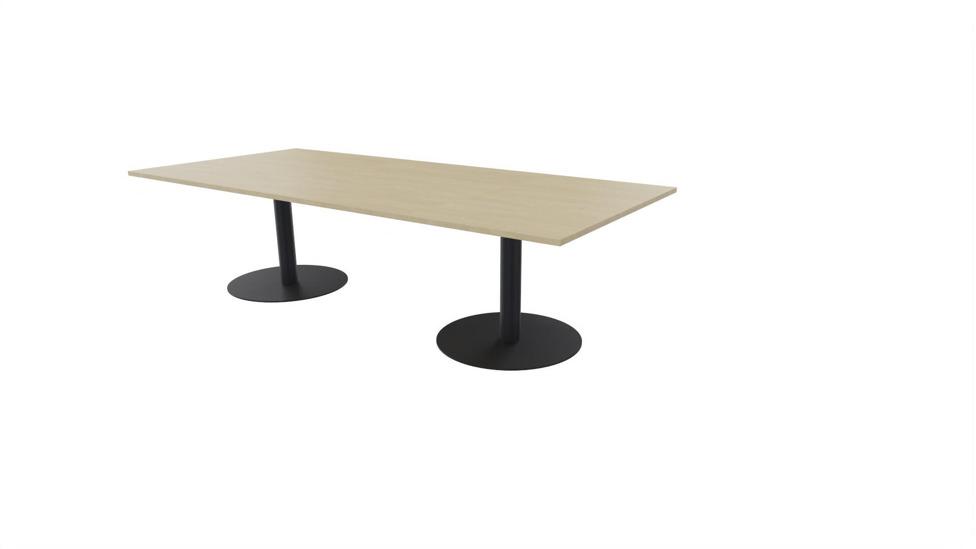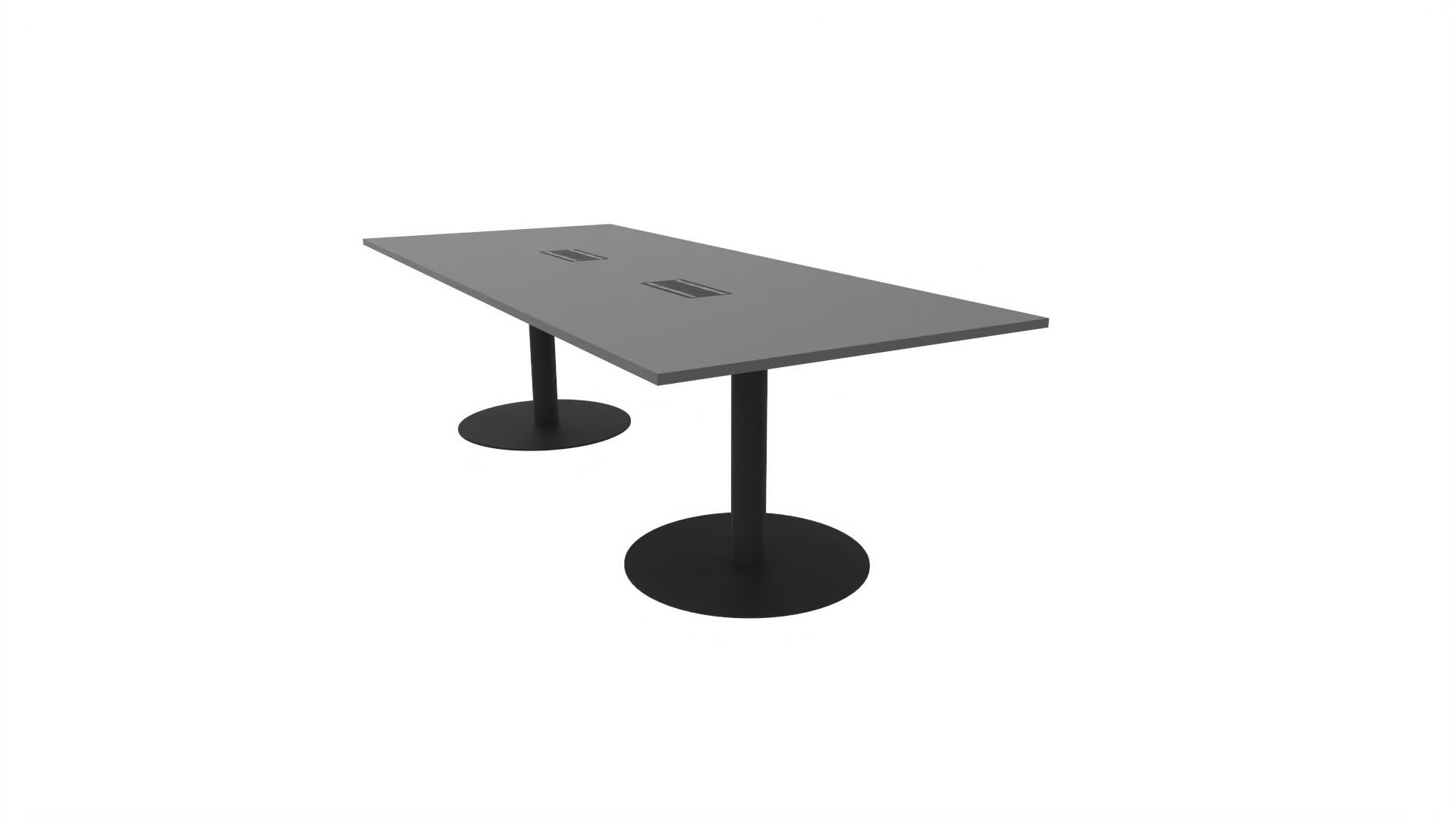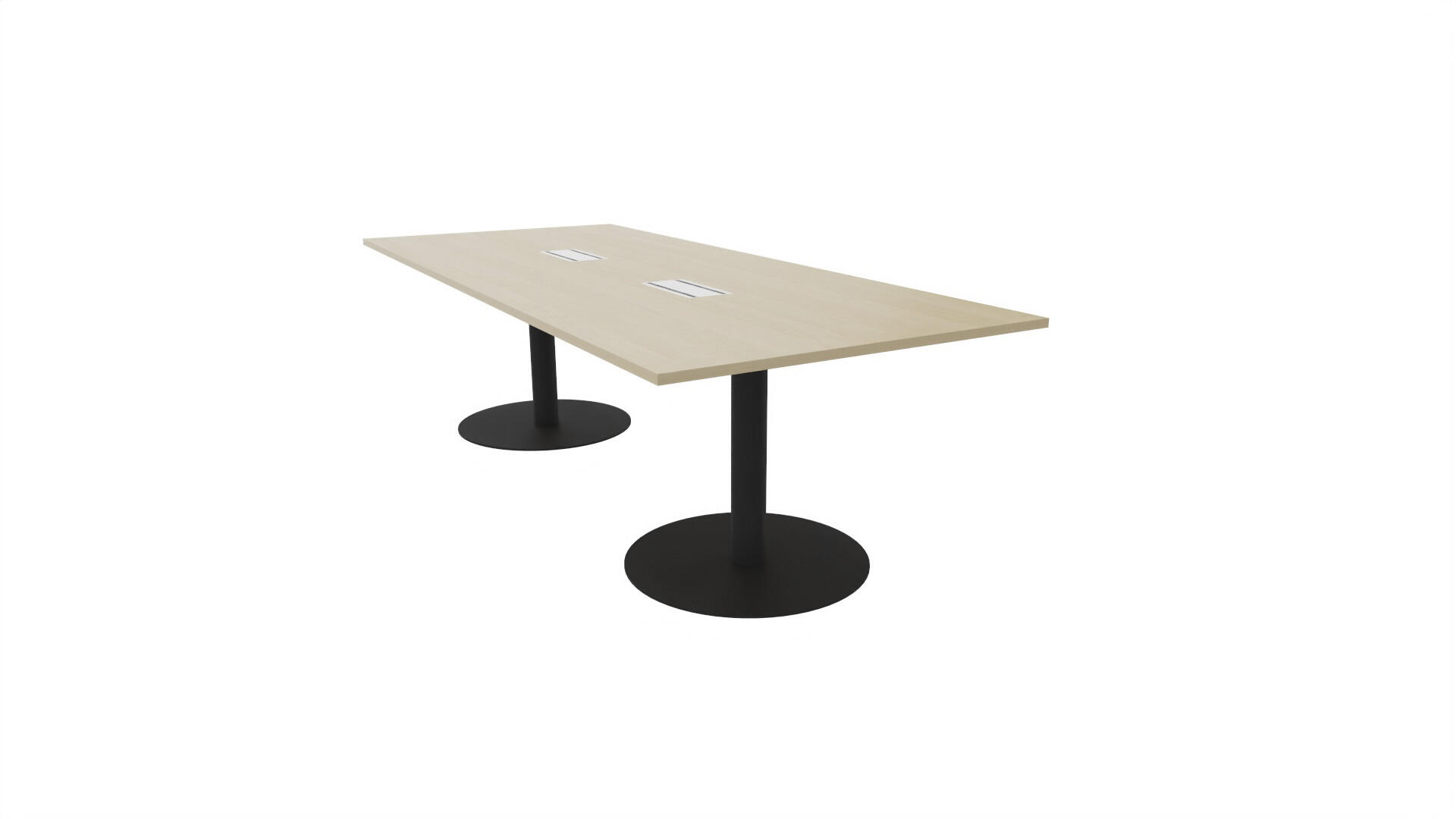 Ett konferensbord med rektangulär skiva, rak kant. Kärna av spånskiva klädd med laminat och ABS-kantband. Underrede pelarstativ med 2 ben, pelardiameter: ø 10,2 cm, fotdiamenter: ø 72 cm. Förutom vanligt standardlaminat, finns bordet även med ett svart nanolaminat som har en yta som är matt och resistent mot fingeravtryck. Som tillval kan du även välja att få två st mediaboxar (32x15 cm) infällda i bordet. Varje mediabox består av 2x 230V eluttag, 1x USB och 1x HDMI.