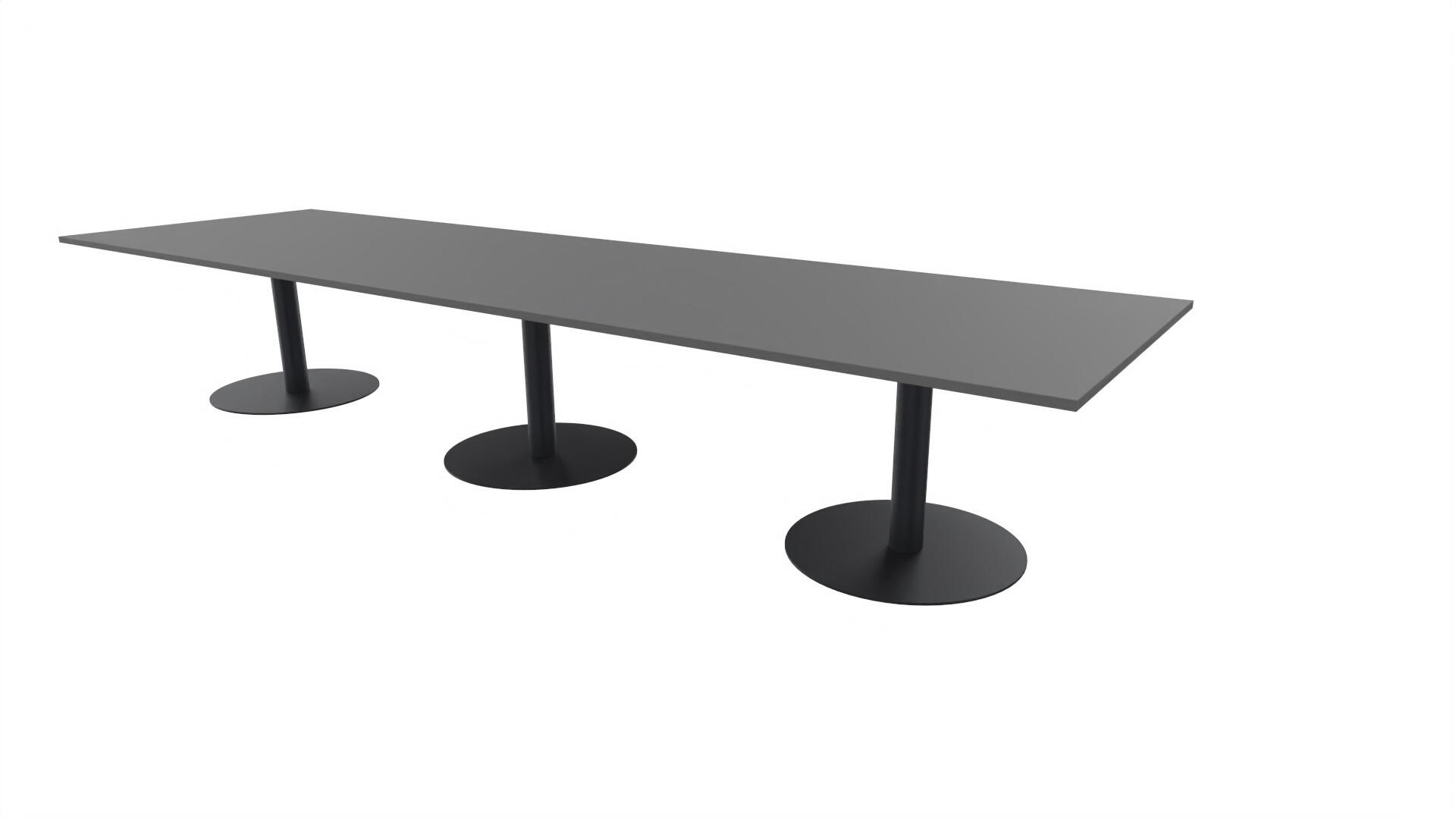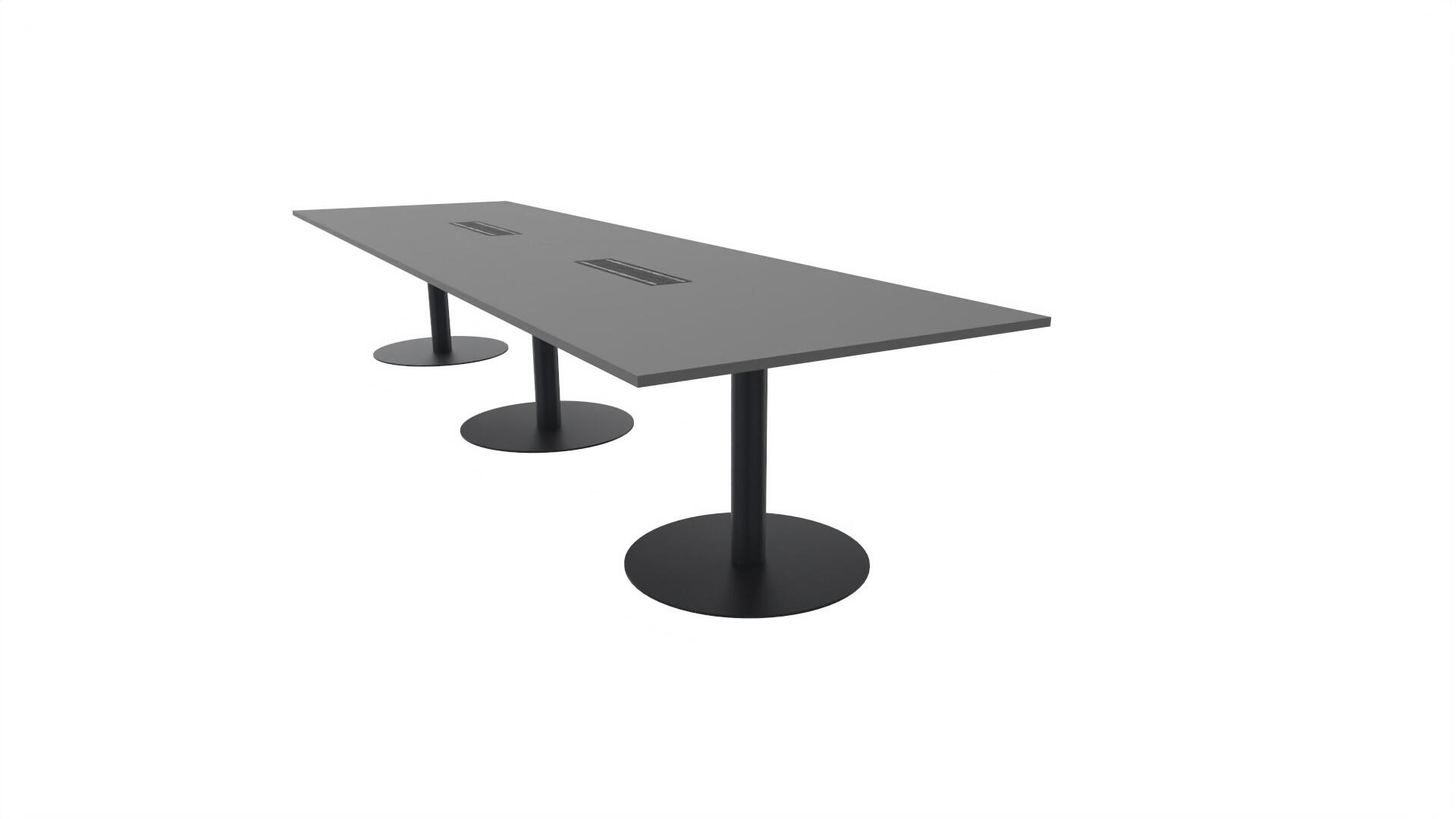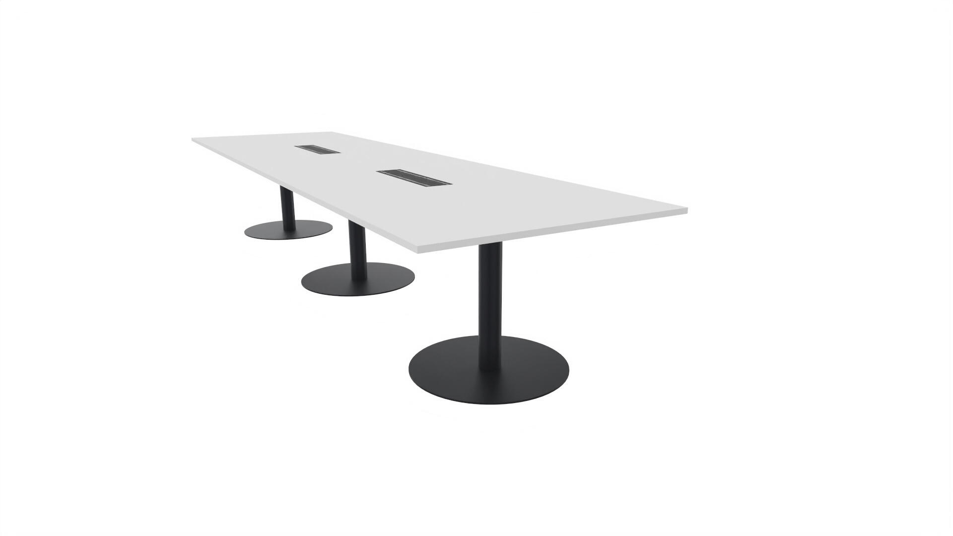 Ett konferensbord med rektangulär skiva, rak kant. Kärna av spånskiva klädd med laminat och ABS-kantband. Underrede pelarstativ med 3 ben, pelardiameter: ø 10,2 cm, fotdiamenter: ø 72 cm. Förutom vanligt standardlaminat, finns bordet även med ett svart nanolaminat som har en yta som är matt och resistent mot fingeravtryck. Som tillval kan du även välja att få två st mediaboxar (61x15 cm) infällda i bordet. Varje mediabox består av 5x 230V eluttag, 2x USB och 1x HDMI.