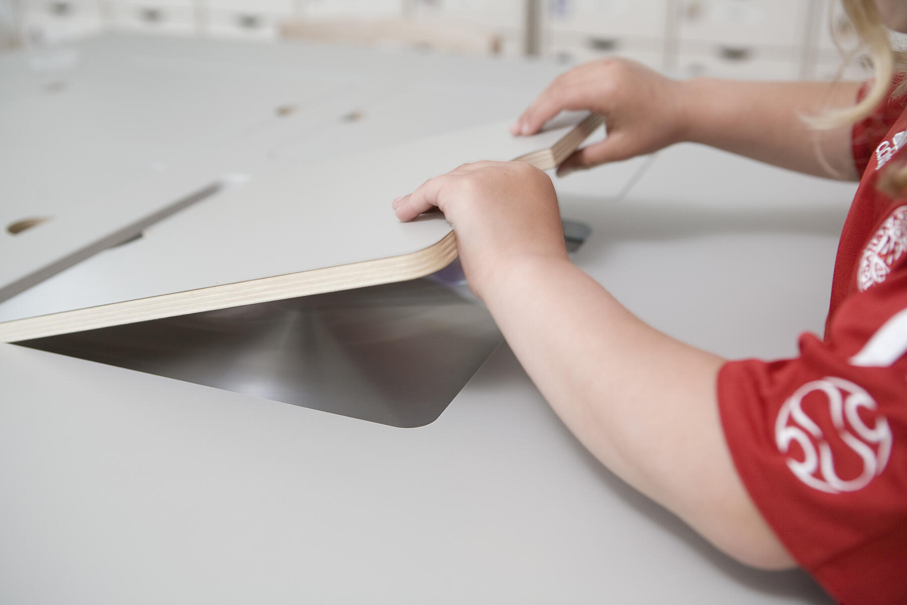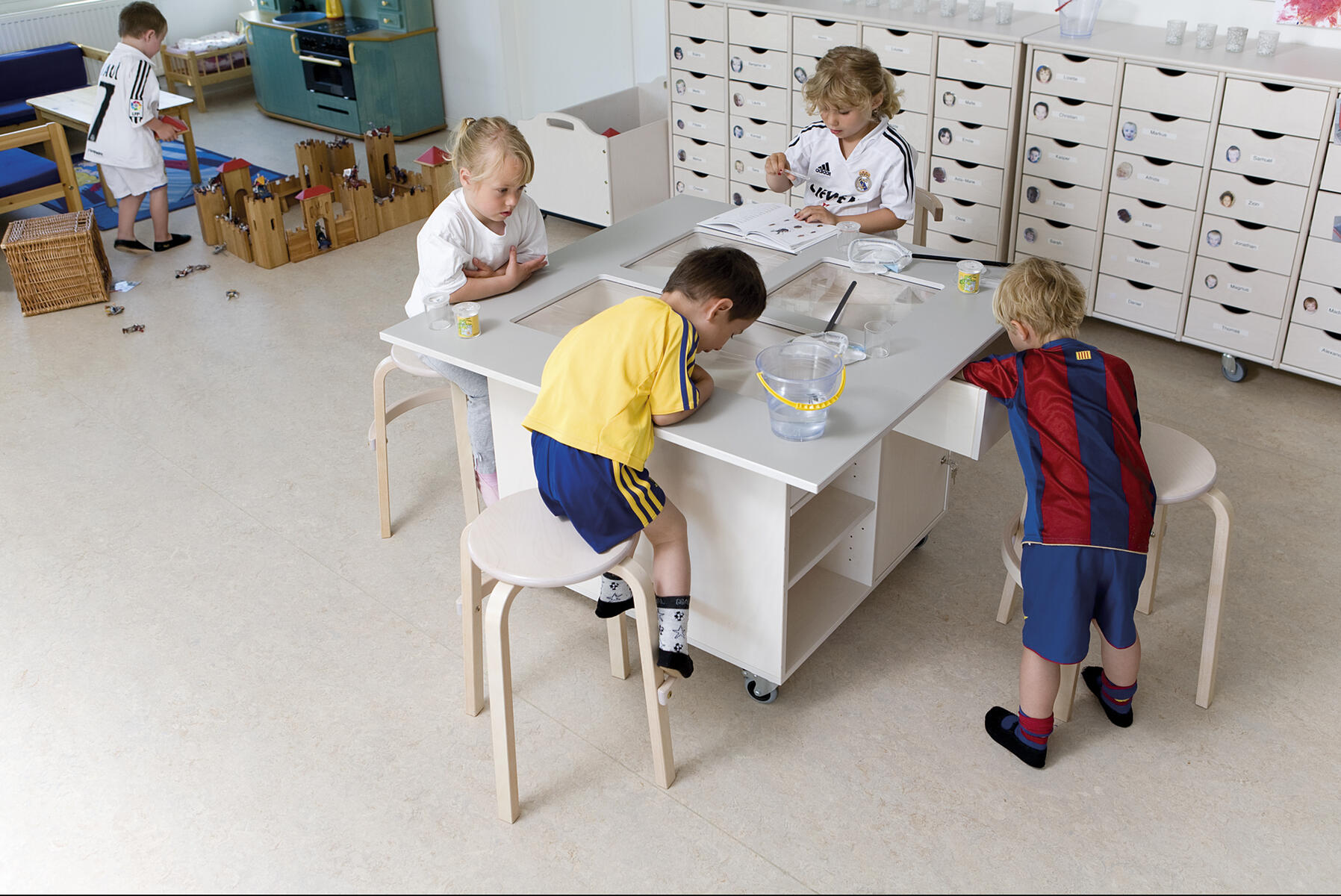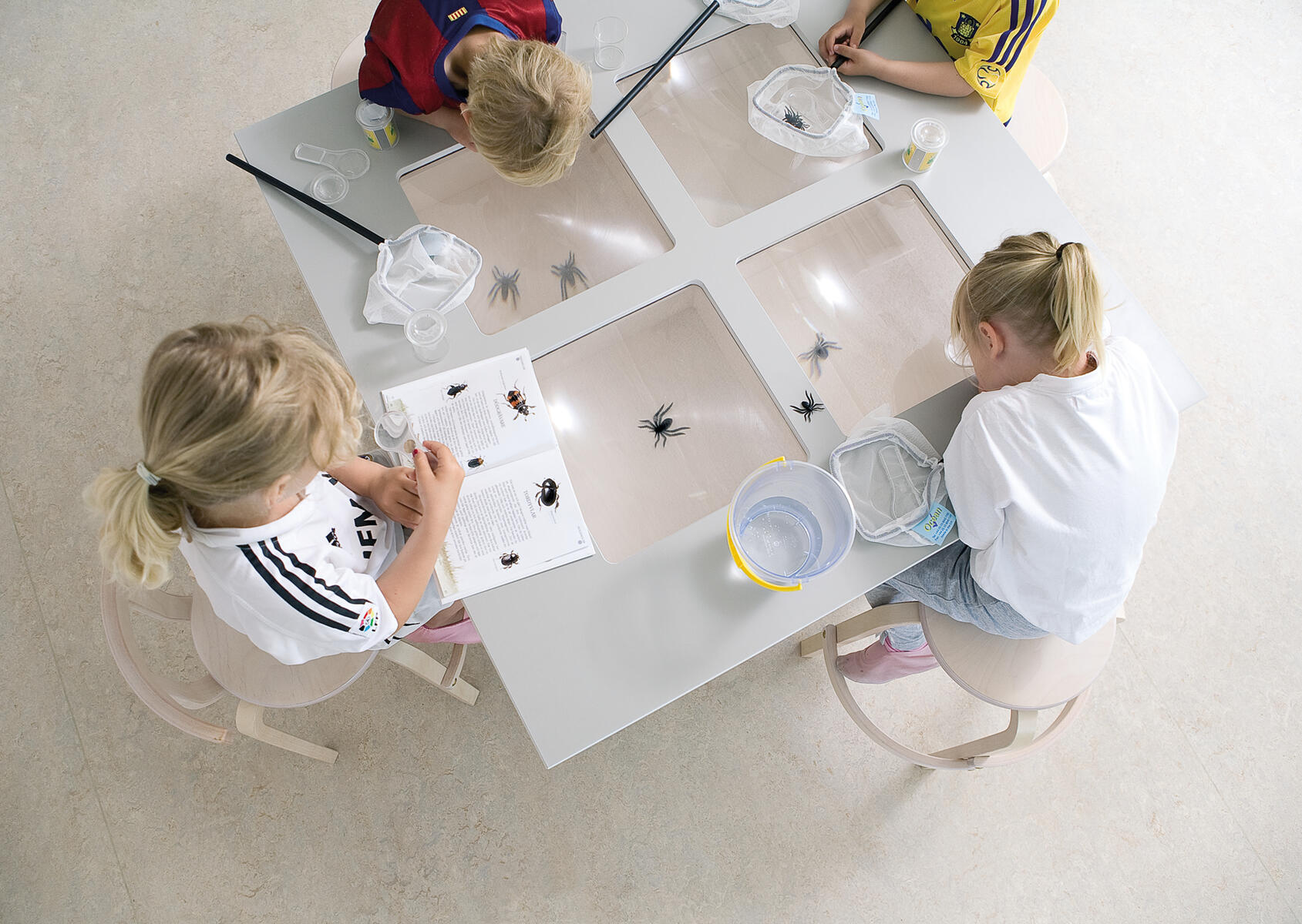 En produkt som främjar inlärningen hos barnen. Bordet har 4 stora optiska linser med hyllor under där man kan lägga djur, blad m.m. och sedan förstora upp till 25 gånger. Med hjälp av de olika linsstyrkorna kan man få riktigt små saker att bli jättestora och se spännande detaljer. Fyra topplattor medföljer för att göra om bordet till en hel skiva. Under bordsskivan finns förvaring i form av hyllor och låsbara skåp. Levereras på hjul med broms. Mått: 105x105x72 cm. Tillverkat i vitpigmenterat björkkryssfaner med bordsskiva i grått laminat.