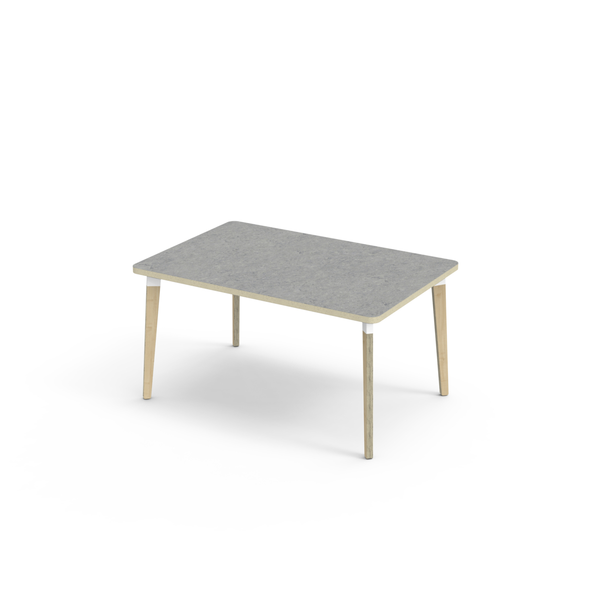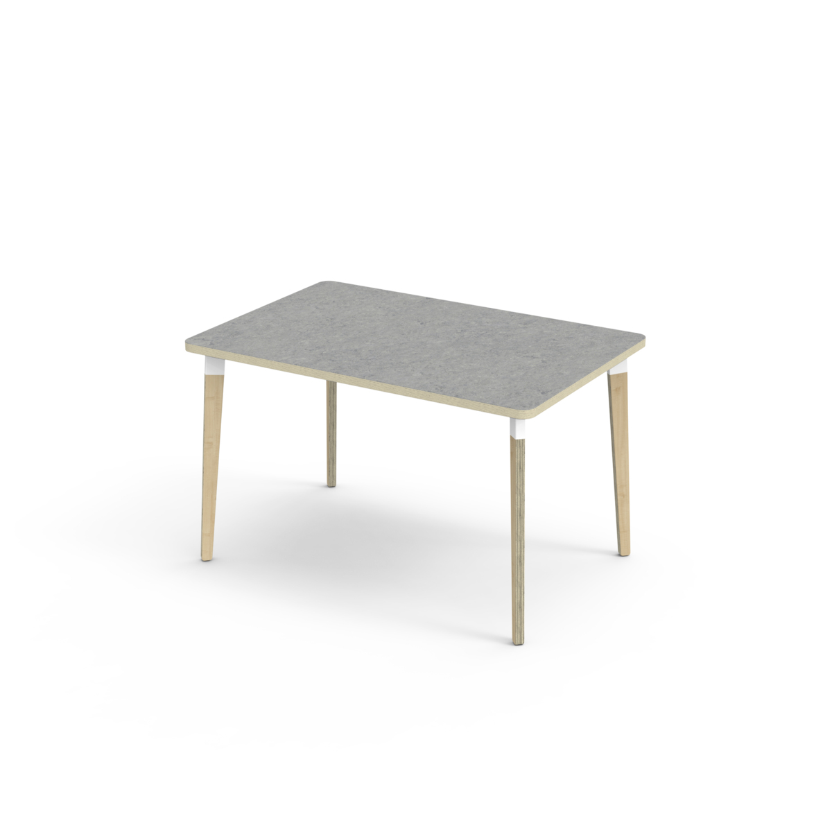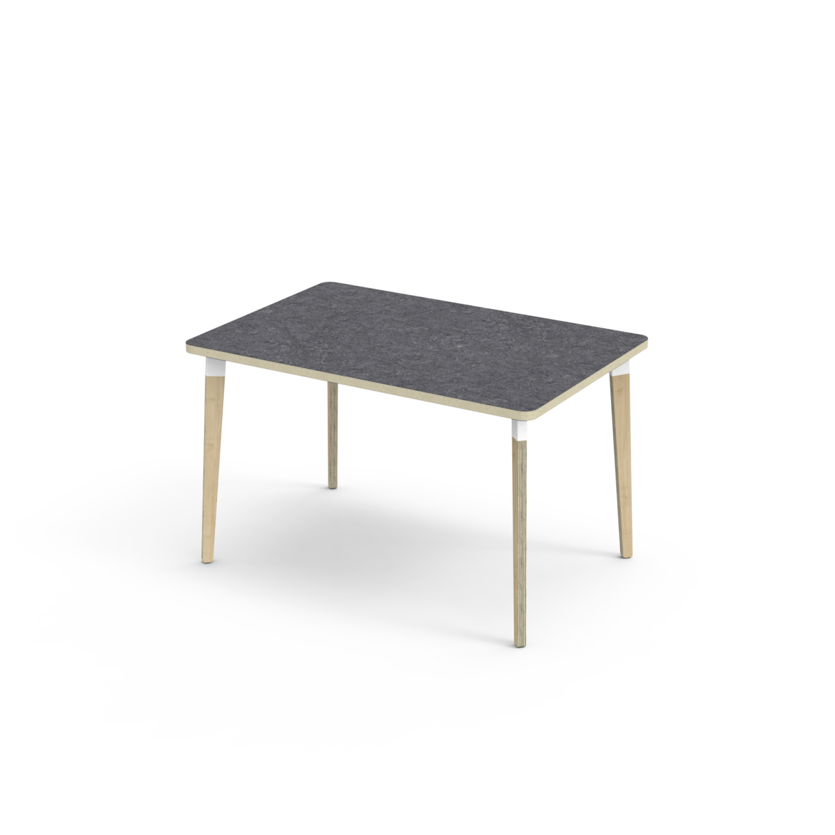 Bordsskiva belagd med akustik linoleum, vilket ger en mjuk och behaglig yta samtidigt som det bidrar till en bättre ljudmiljö. Med en hörnradie på 40 mm får bordet en modern och stilren design. Benen har en rektangulär form och är tillverkade av klarlackad björkplywood som är monterade i en robust vit metallhylsa. Denna konstruktion garanterar både stabilitet och hållbarhet. Benen är något snett vinklade ut mot bordsskivans hörn. Monteringen är enkel och smidig – du behöver bara fästa metallhylsorna i de förberedda fästpunkterna i bordsskivan.