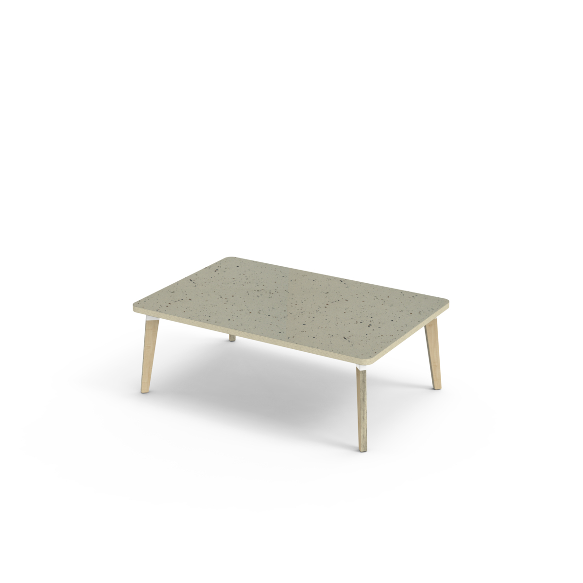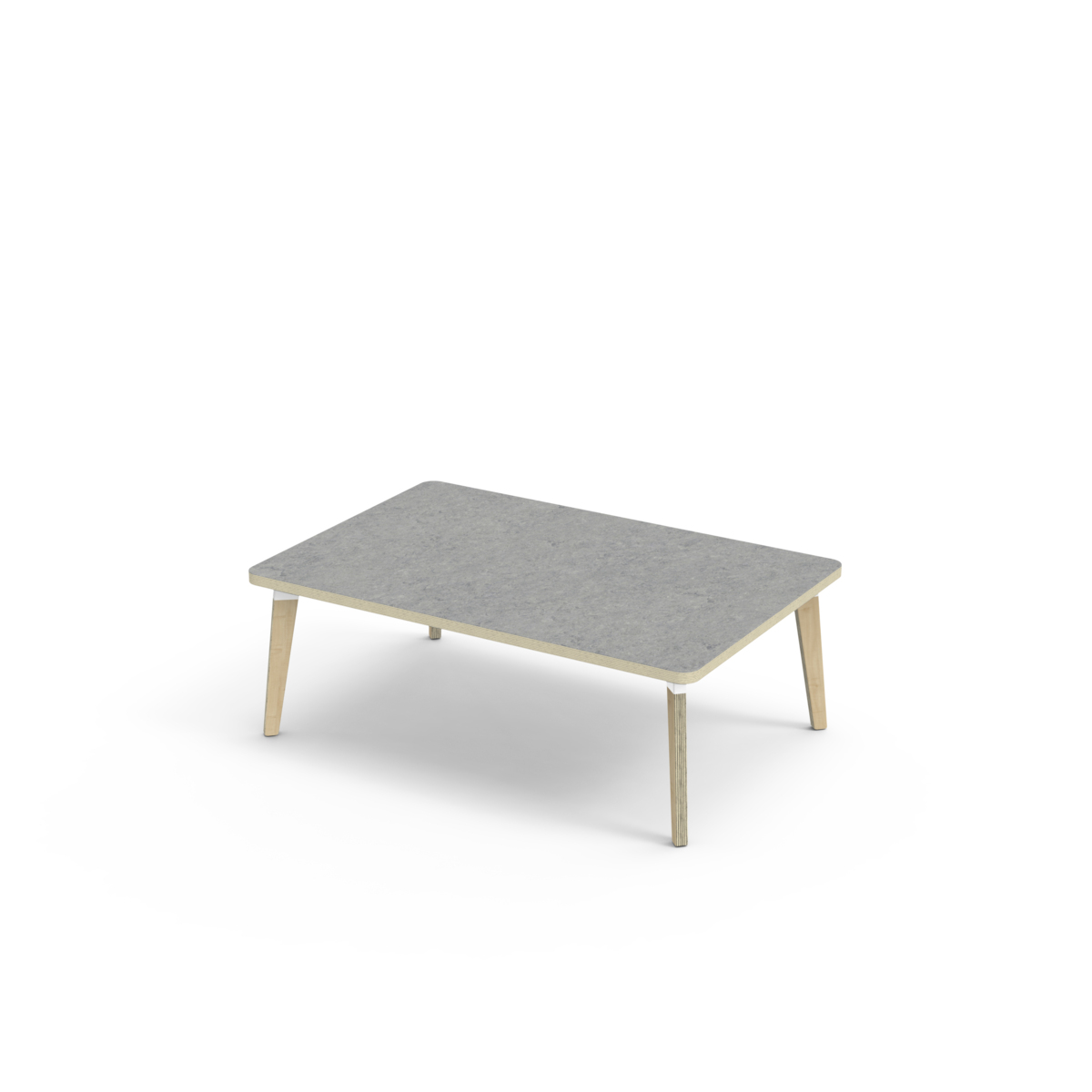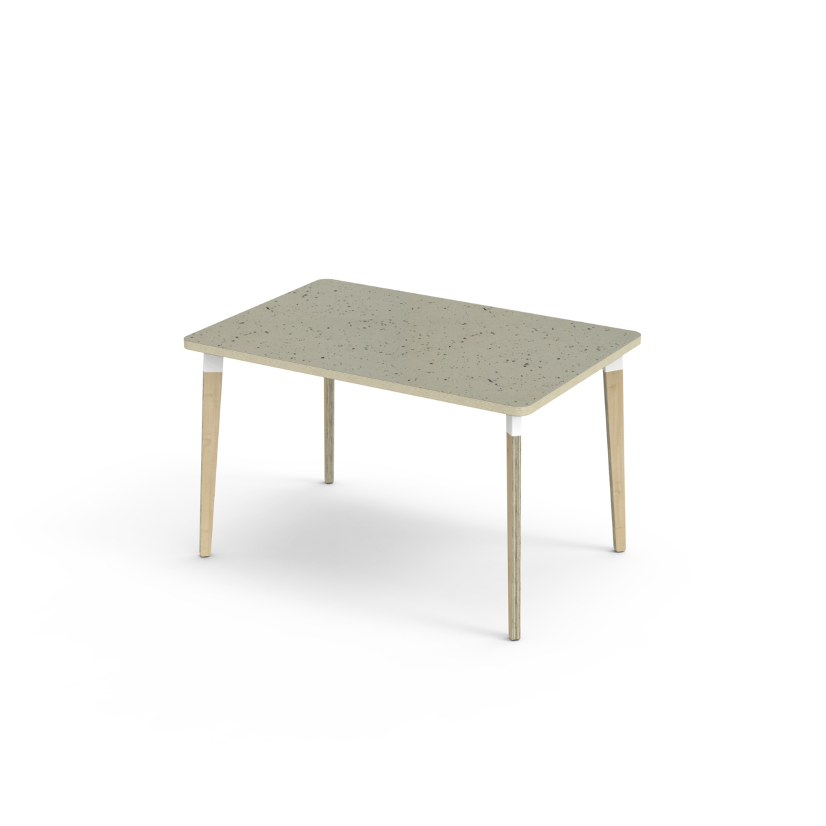 Bordsskiva belagd med akustik linoleum, vilket ger en mjuk och behaglig yta samtidigt som det bidrar till en bättre ljudmiljö. Med en hörnradie på 40 mm får bordet en modern och stilren design. Benen har en rektangulär form och är tillverkade av klarlackad björkplywood som är monterade i en robust vit metallhylsa. Denna konstruktion garanterar både stabilitet och hållbarhet. Benen är något snett vinklade ut mot bordsskivans hörn. Monteringen är enkel och smidig – du behöver bara fästa metallhylsorna i de förberedda fästpunkterna i bordsskivan.