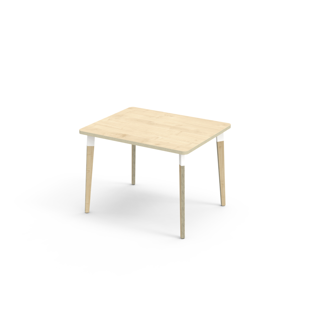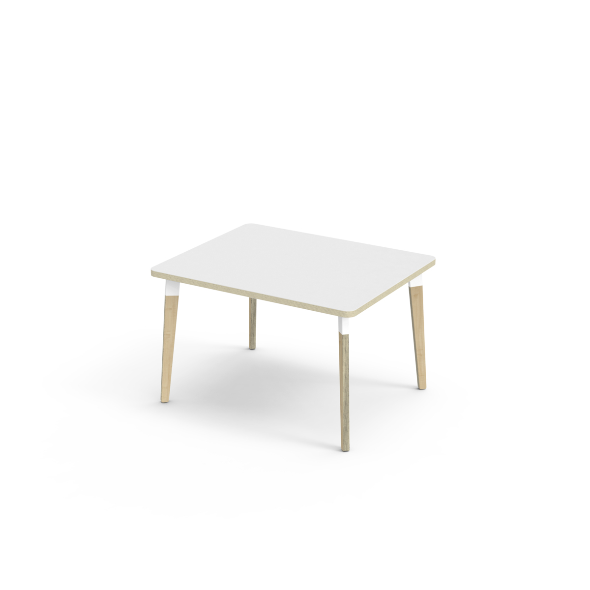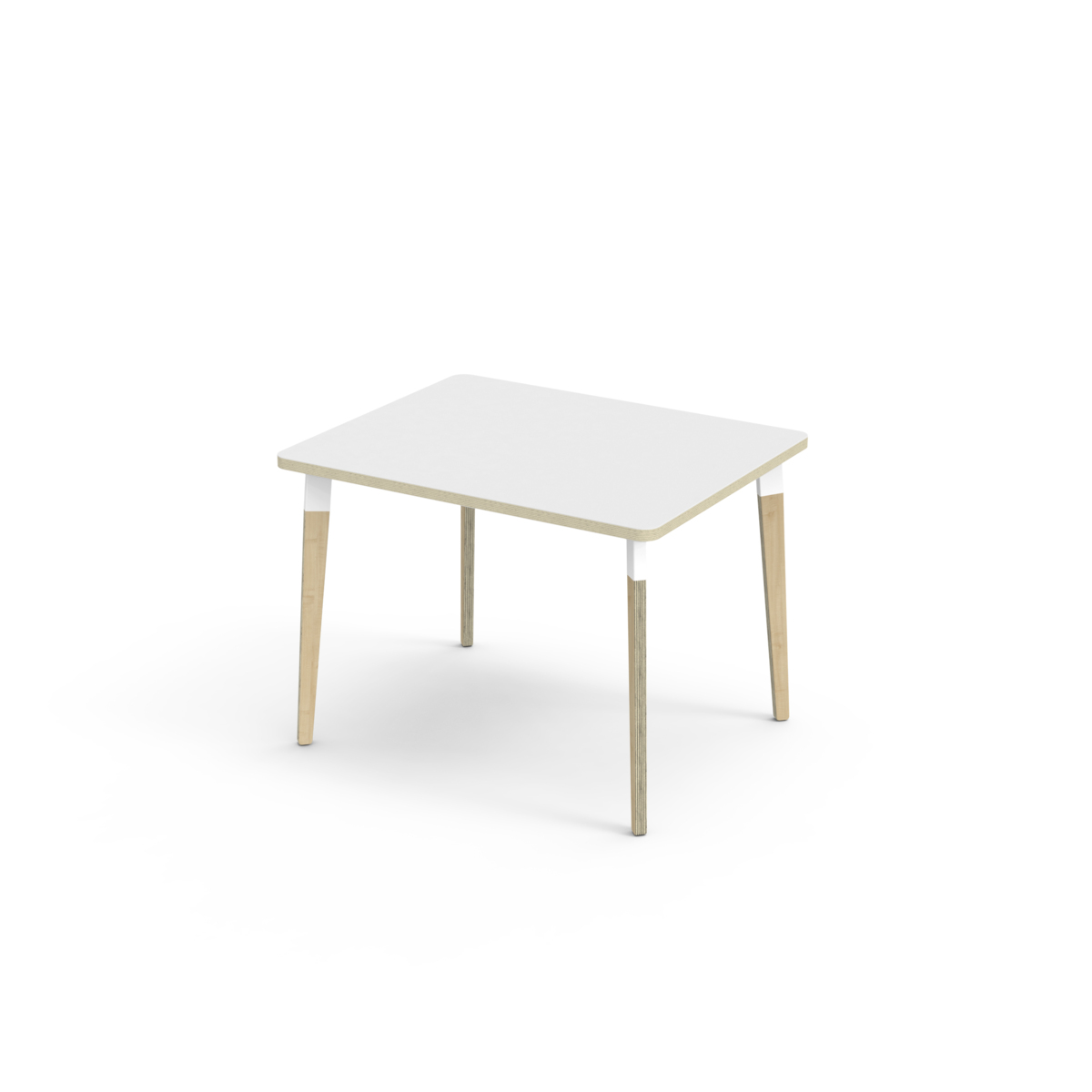Bordsskiva belagd med laminat. Med en hörnradie på 40 mm får bordet en modern och stilren design. Benen har en rektangulär form och är tillverkade av klarlackad björkplywood som är monterade i en robust vit metallhylsa. Denna konstruktion garanterar både stabilitet och hållbarhet. Benen är något snett vinklade ut mot bordsskivans hörn. Monteringen är enkel och smidig – du behöver bara fästa metallhylsorna i de förberedda fästpunkterna i bordsskivan.