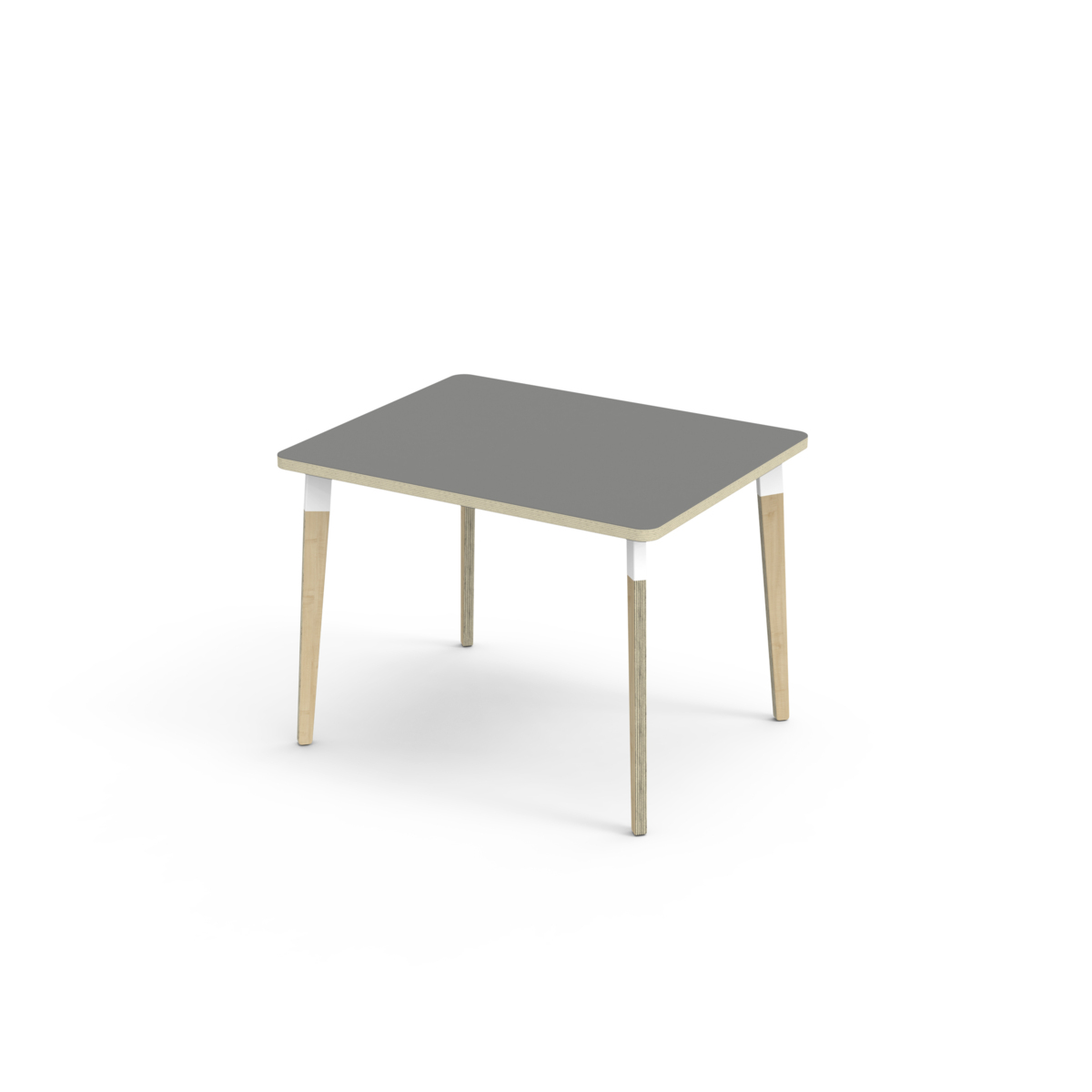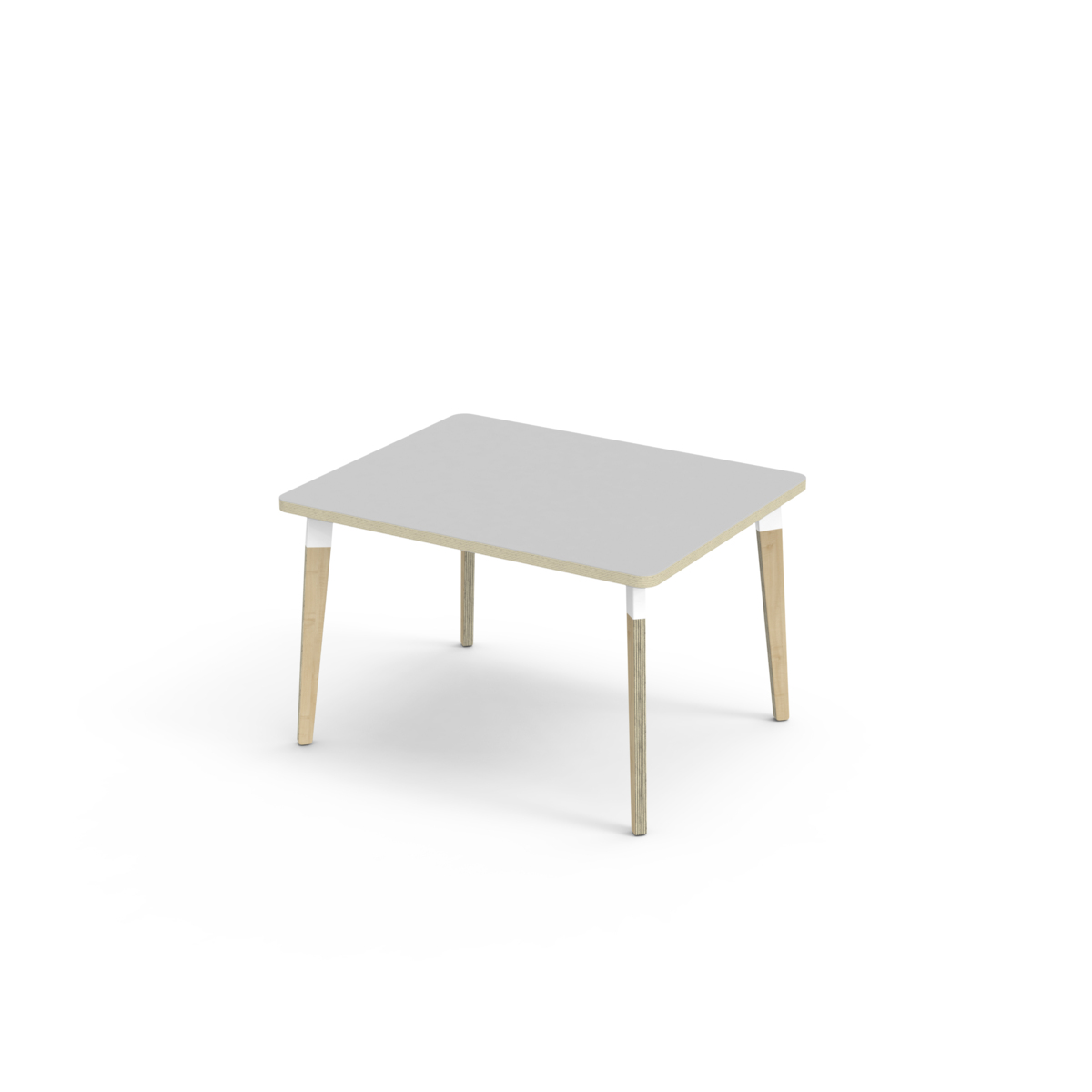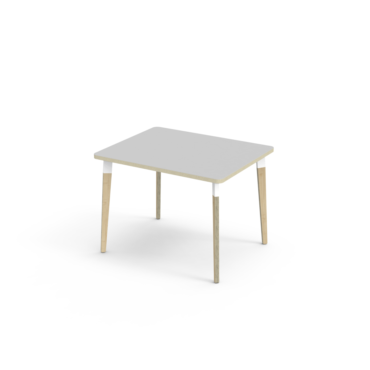 Bordsskiva belagd med akustik linoleum, vilket ger en mjuk och behaglig yta samtidigt som det bidrar till en bättre ljudmiljö. Med en hörnradie på 40 mm får bordet en modern och stilren design. Benen har en rektangulär form och är tillverkade av klarlackad björkplywood som är monterade i en robust vit metallhylsa. Denna konstruktion garanterar både stabilitet och hållbarhet. Benen är något snett vinklade ut mot bordsskivans hörn. Monteringen är enkel och smidig – du behöver bara fästa metallhylsorna i de förberedda fästpunkterna i bordsskivan.