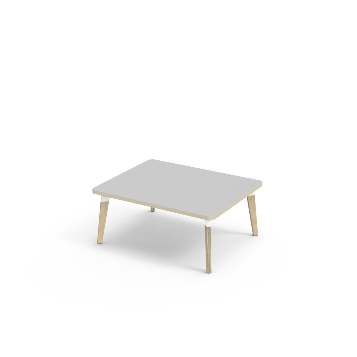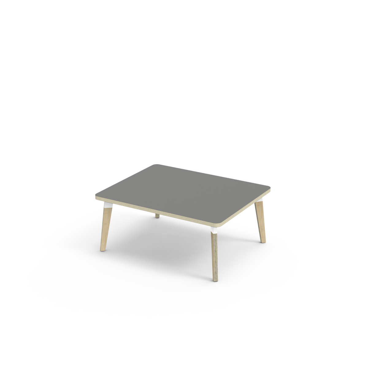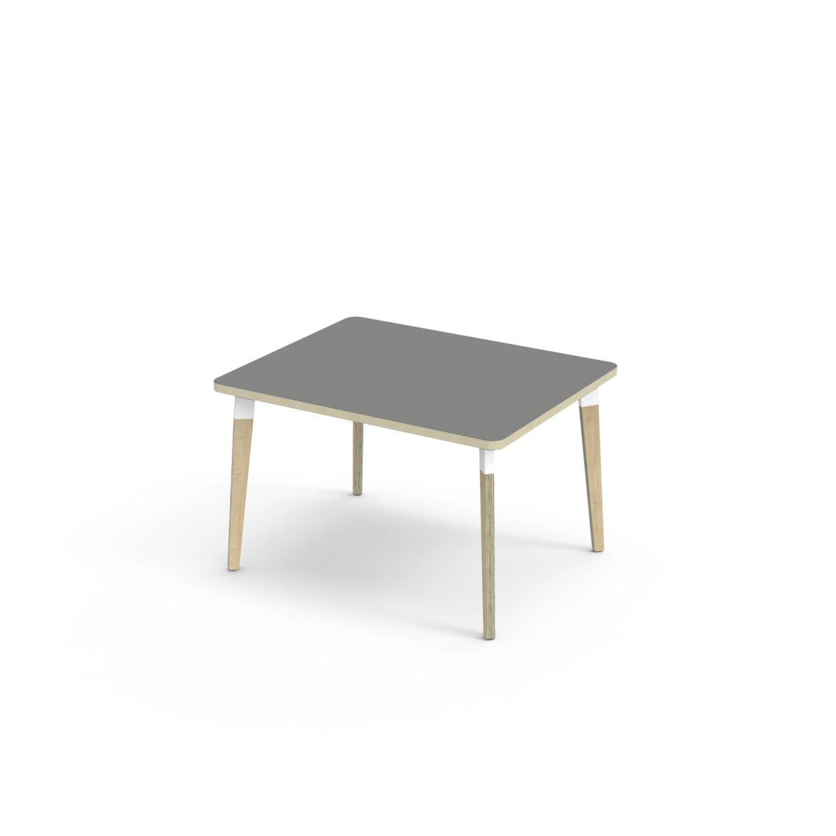 Bordsskiva belagd med akustik linoleum, vilket ger en mjuk och behaglig yta samtidigt som det bidrar till en bättre ljudmiljö. Med en hörnradie på 40 mm får bordet en modern och stilren design. Benen har en rektangulär form och är tillverkade av klarlackad björkplywood som är monterade i en robust vit metallhylsa. Denna konstruktion garanterar både stabilitet och hållbarhet. Benen är något snett vinklade ut mot bordsskivans hörn. Monteringen är enkel och smidig – du behöver bara fästa metallhylsorna i de förberedda fästpunkterna i bordsskivan.