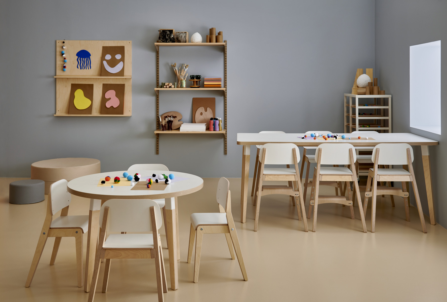 Bordsskiva belagd med akustik linoleum, vilket ger en mjuk och behaglig yta samtidigt som det bidrar till en bättre ljudmiljö. Med en hörnradie på 40 mm får bordet en modern och stilren design. Benen har en rektangulär form och är tillverkade av klarlackad björkplywood som är monterade i en robust vit metallhylsa. Denna konstruktion garanterar både stabilitet och hållbarhet. Benen är något snett vinklade ut mot bordsskivans hörn. Monteringen är enkel och smidig – du behöver bara fästa metallhylsorna i de förberedda fästpunkterna i bordsskivan.