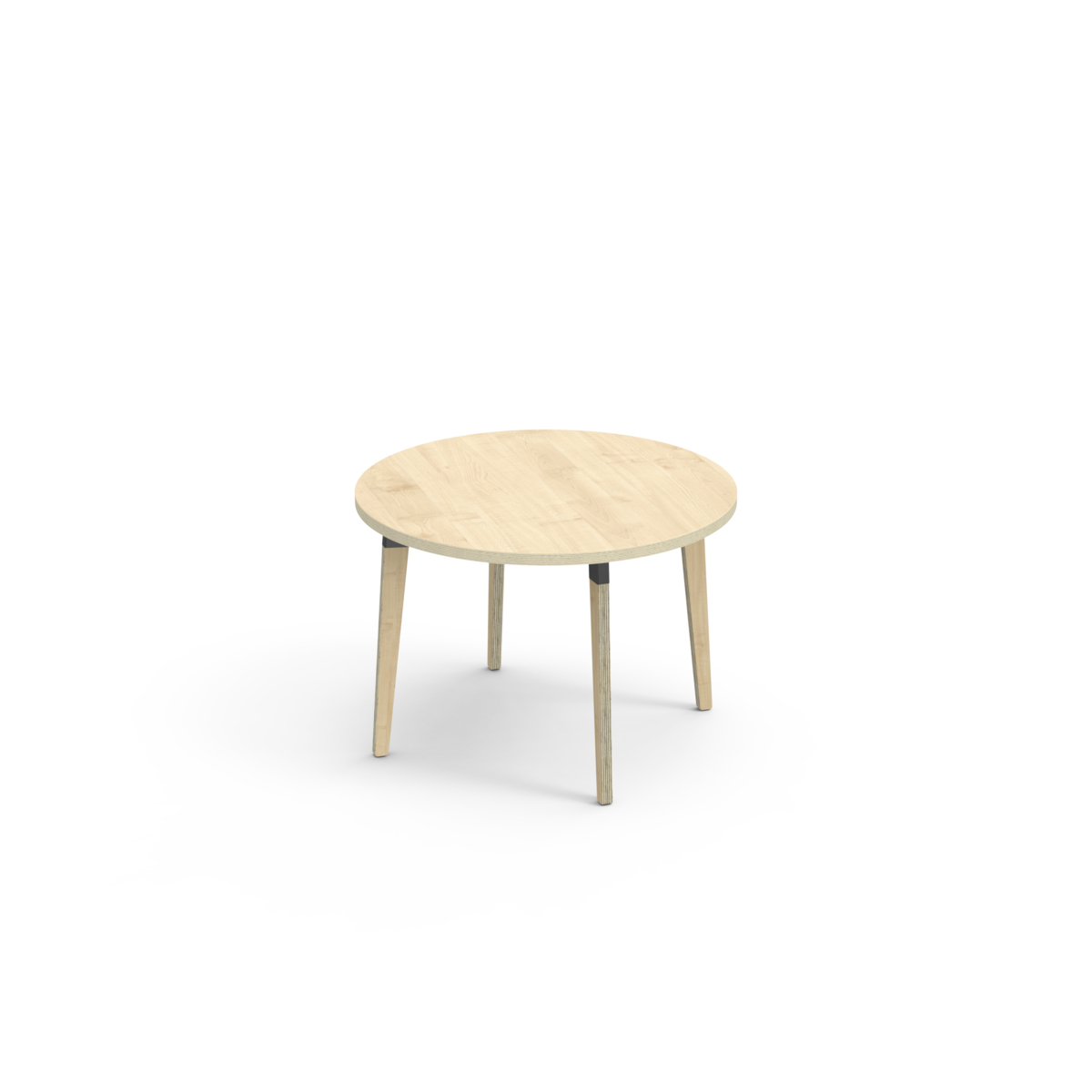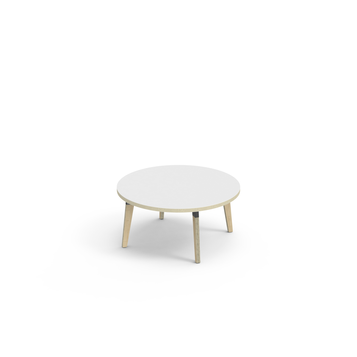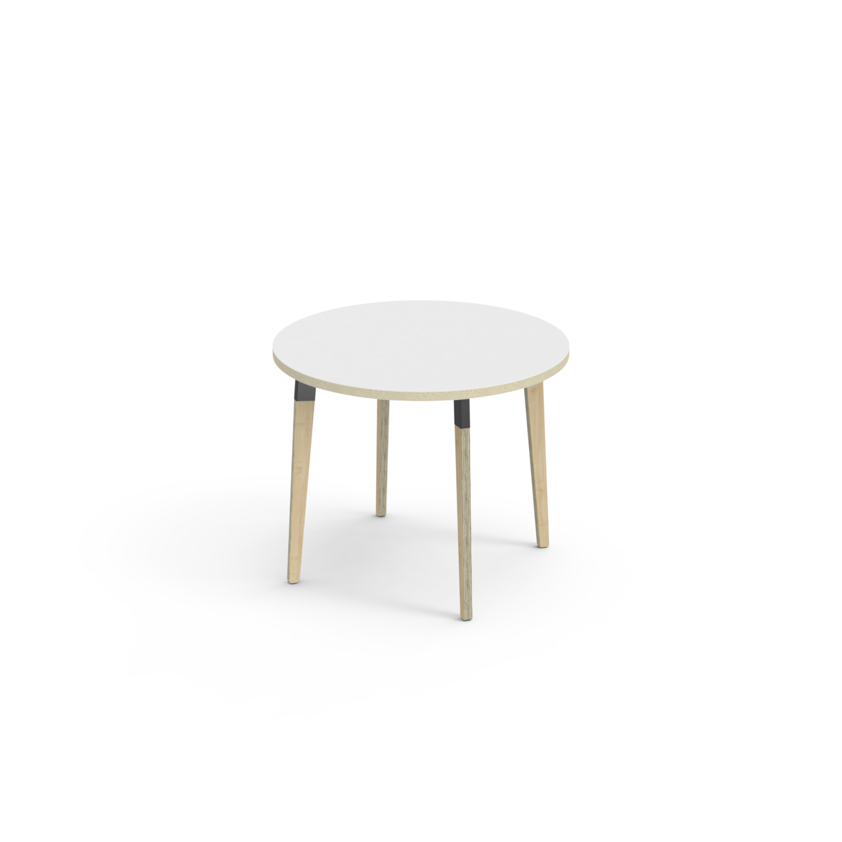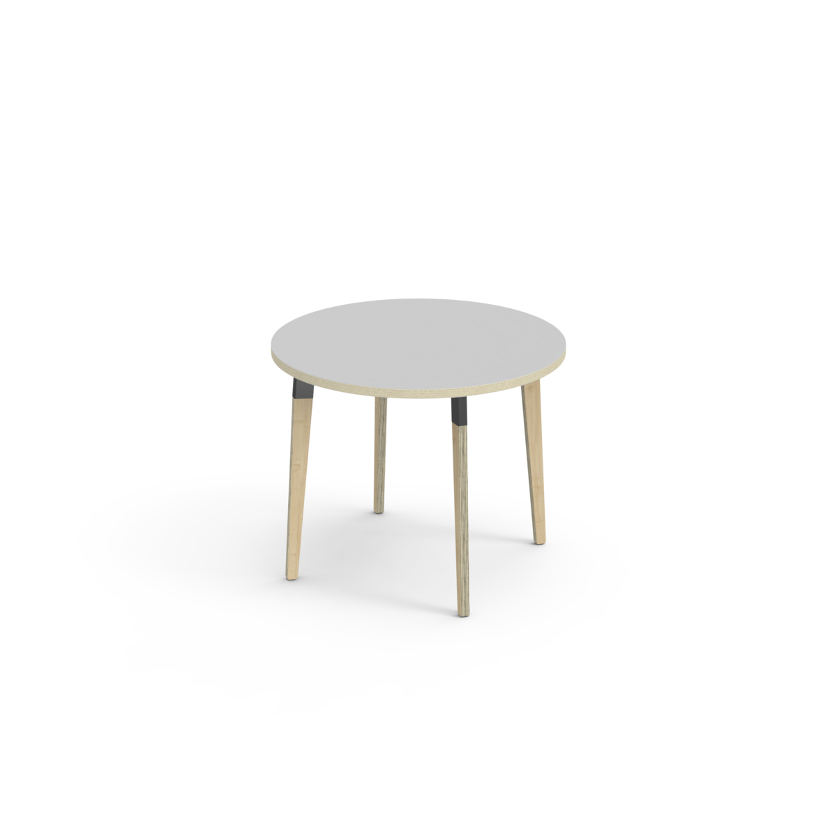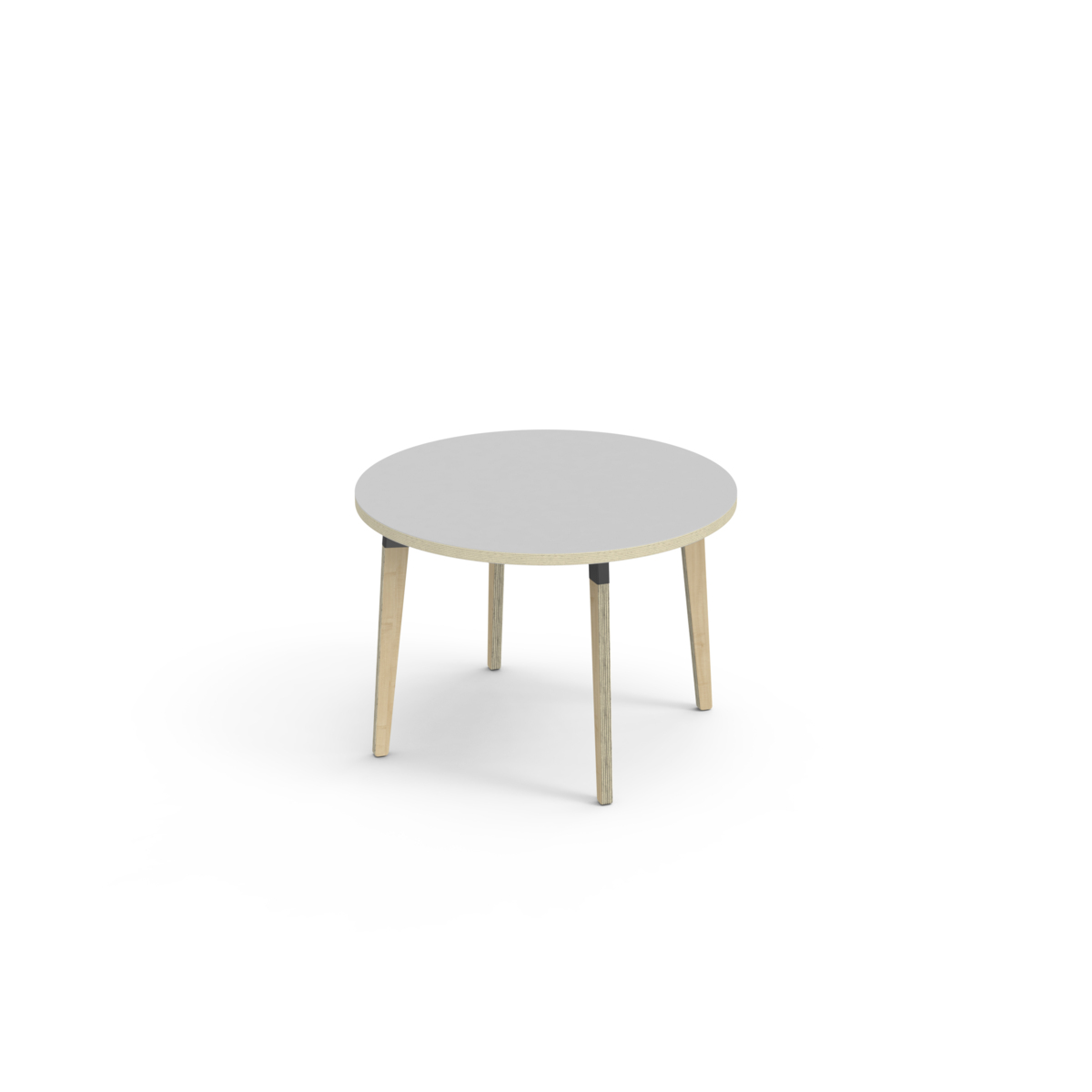 Bordsskiva belagd med akustik linoleum, vilket ger en mjuk och behaglig yta samtidigt som det bidrar till en bättre ljudmiljö. Med en hörnradie på 40 mm får bordet en modern och stilren design. Benen har en rektangulär form och är tillverkade av klarlackad björkplywood som är monterade i en robust vit metallhylsa. Denna konstruktion garanterar både stabilitet och hållbarhet. Benen är något snett vinklade ut mot bordsskivans hörn. Monteringen är enkel och smidig – du behöver bara fästa metallhylsorna i de förberedda fästpunkterna i bordsskivan.