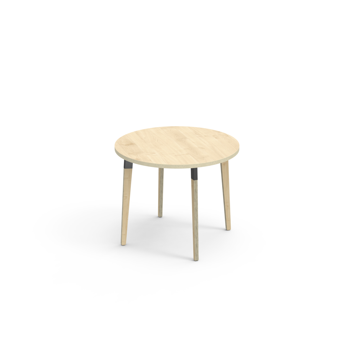 Bordsskiva belagd med laminat. Med en hörnradie på 40 mm får bordet en modern och stilren design. Benen har en rektangulär form och är tillverkade av klarlackad björkplywood som är monterade i en robust svart metallhylsa. Denna konstruktion garanterar både stabilitet och hållbarhet. Benen är något snett vinklade ut mot bordsskivans hörn. Monteringen är enkel och smidig – du behöver bara fästa metallhylsorna i de förberedda fästpunkterna i bordsskivan.