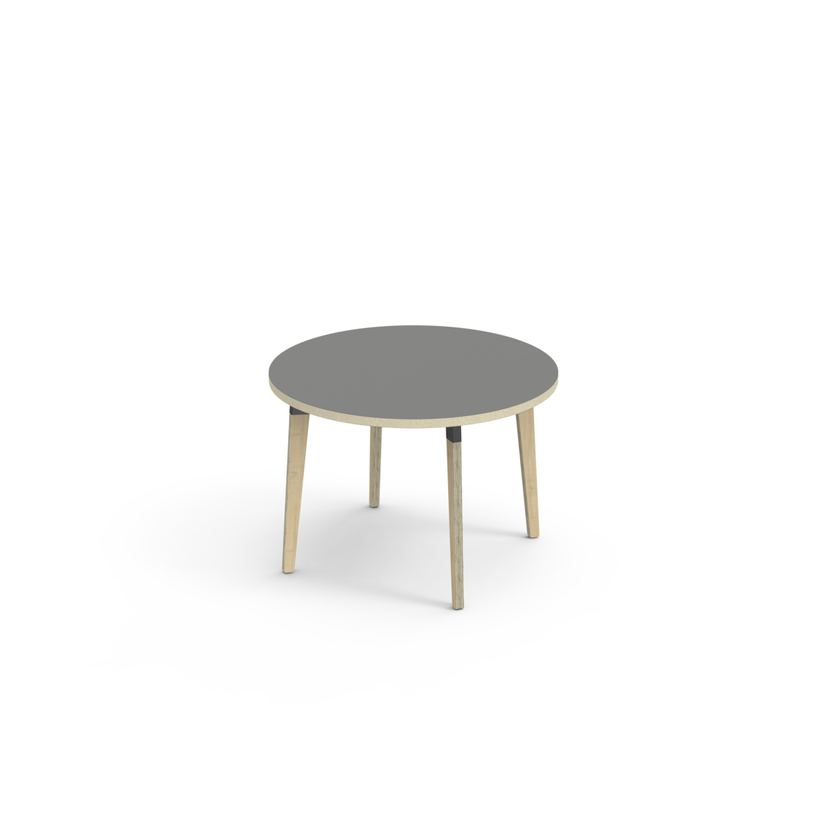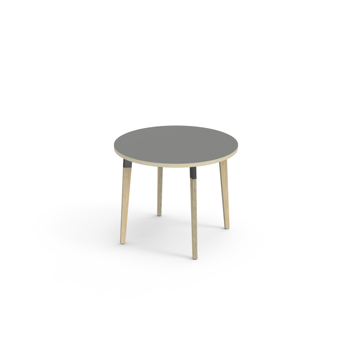 Bordsskiva belagd med akustik linoleum, vilket ger en mjuk och behaglig yta samtidigt som det bidrar till en bättre ljudmiljö. Med en hörnradie på 40 mm får bordet en modern och stilren design. Benen har en rektangulär form och är tillverkade av klarlackad björkplywood som är monterade i en robust svart metallhylsa. Denna konstruktion garanterar både stabilitet och hållbarhet. Benen är något snett vinklade ut mot bordsskivans hörn. Monteringen är enkel och smidig – du behöver bara fästa metallhylsorna i de förberedda fästpunkterna i bordsskivan.