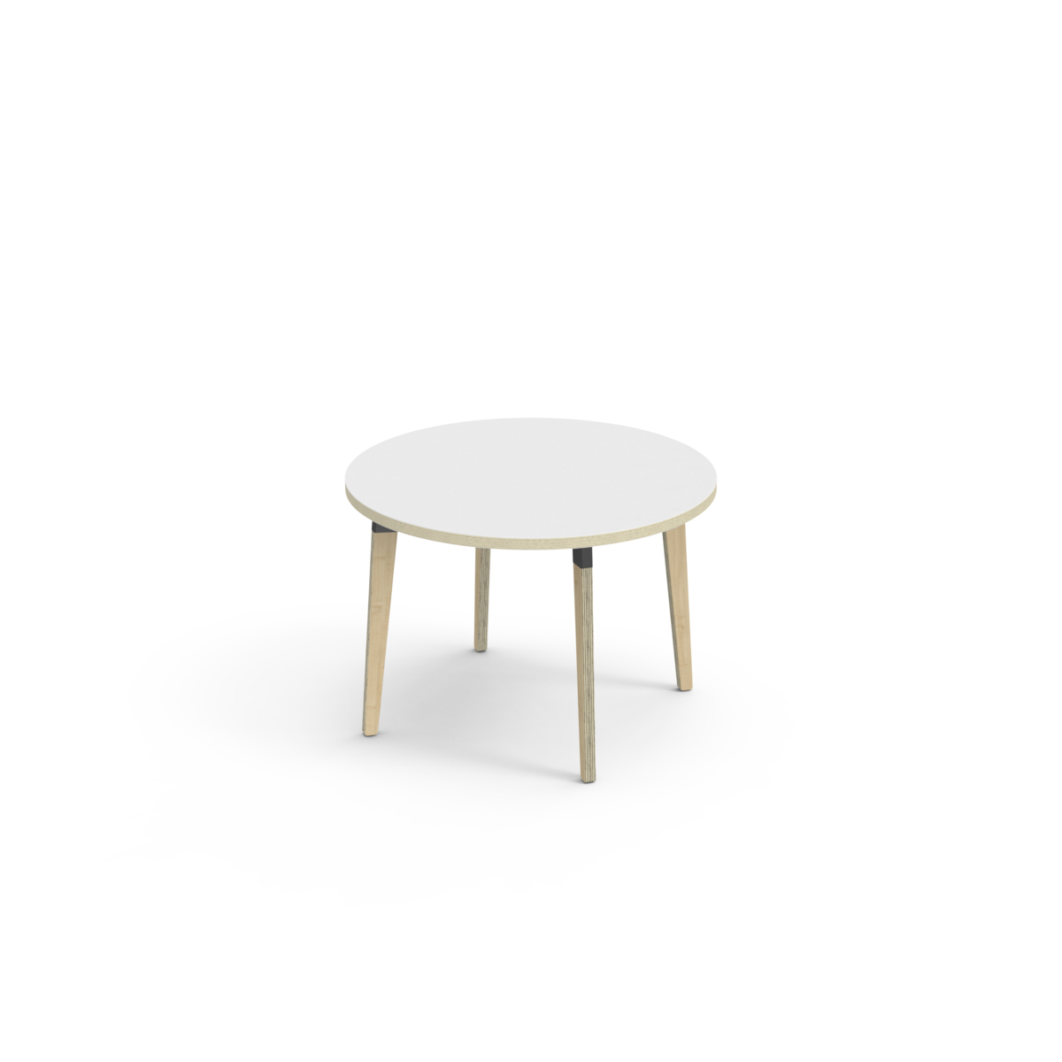 Bordsskiva belagd med laminat. Med en hörnradie på 40 mm får bordet en modern och stilren design. Benen har en rektangulär form och är tillverkade av klarlackad björkplywood som är monterade i en robust vit metallhylsa. Denna konstruktion garanterar både stabilitet och hållbarhet. Benen är något snett vinklade ut mot bordsskivans hörn. Monteringen är enkel och smidig – du behöver bara fästa metallhylsorna i de förberedda fästpunkterna i bordsskivan.