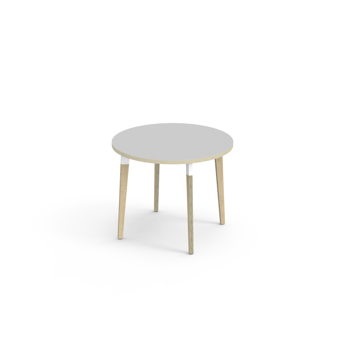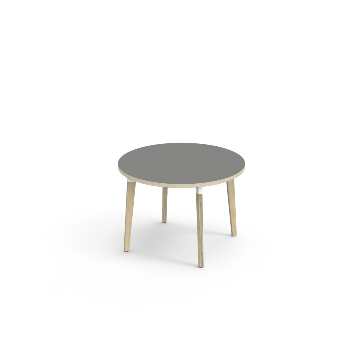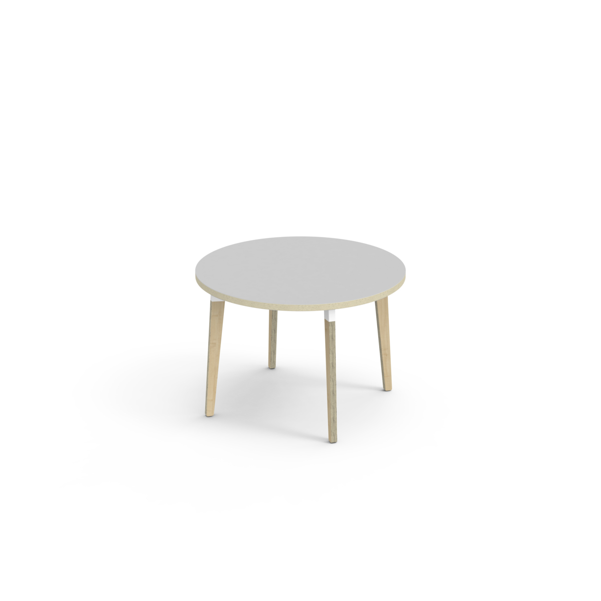 Bordsskiva belagd med akustik linoleum, vilket ger en mjuk och behaglig yta samtidigt som det bidrar till en bättre ljudmiljö. Med en hörnradie på 40 mm får bordet en modern och stilren design. Benen har en rektangulär form och är tillverkade av klarlackad björkplywood som är monterade i en robust vit metallhylsa. Denna konstruktion garanterar både stabilitet och hållbarhet. Benen är något snett vinklade ut mot bordsskivans hörn. Monteringen är enkel och smidig – du behöver bara fästa metallhylsorna i de förberedda fästpunkterna i bordsskivan.