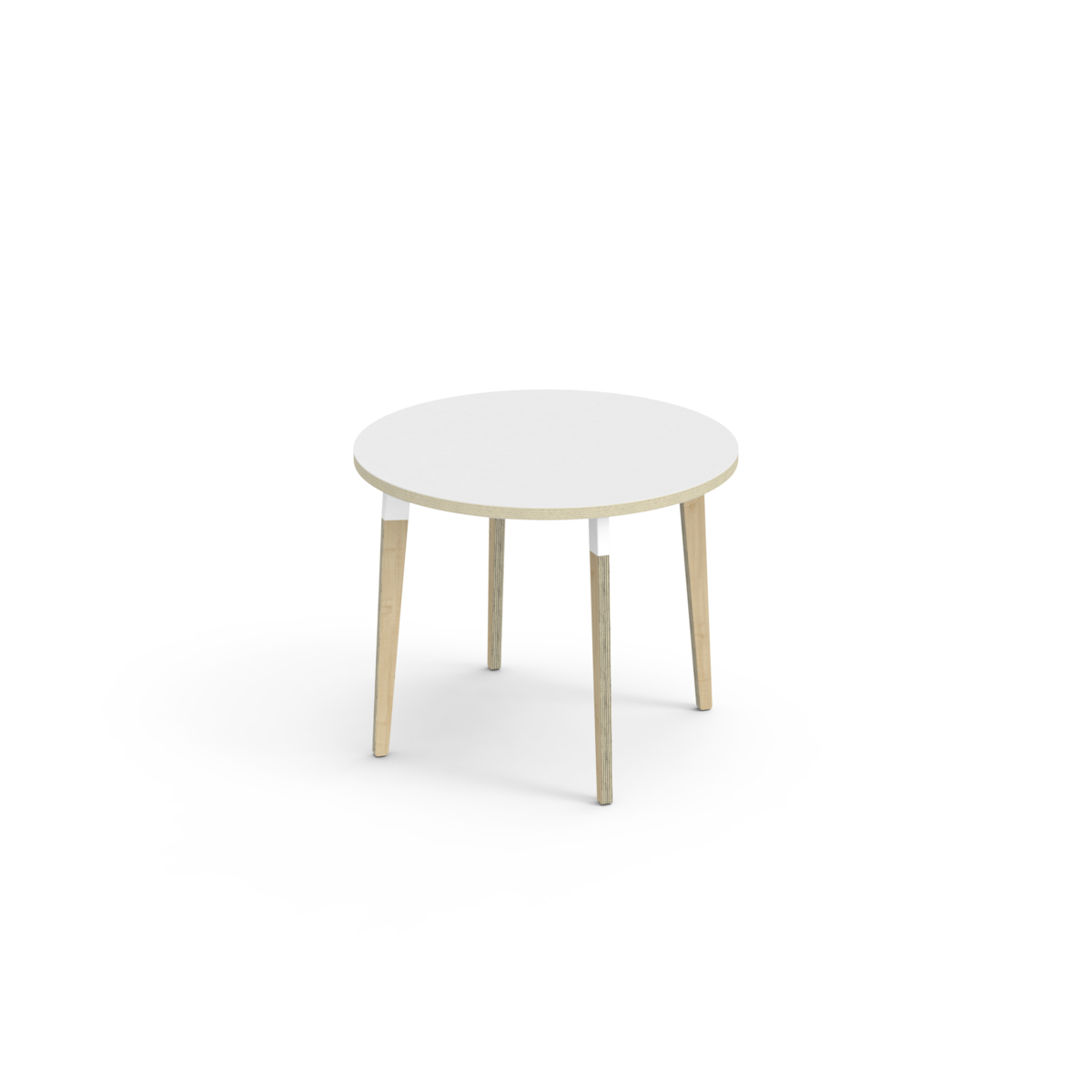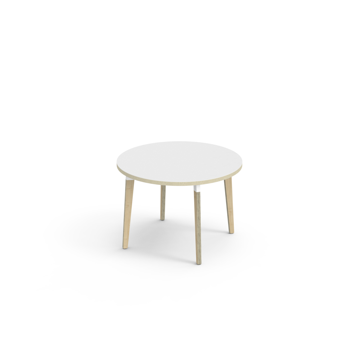 Bordsskiva belagd med laminat. Med en hörnradie på 40 mm får bordet en modern och stilren design. Benen har en rektangulär form och är tillverkade av klarlackad björkplywood som är monterade i en robust vit metallhylsa. Denna konstruktion garanterar både stabilitet och hållbarhet. Benen är något snett vinklade ut mot bordsskivans hörn. Monteringen är enkel och smidig – du behöver bara fästa metallhylsorna i de förberedda fästpunkterna i bordsskivan.