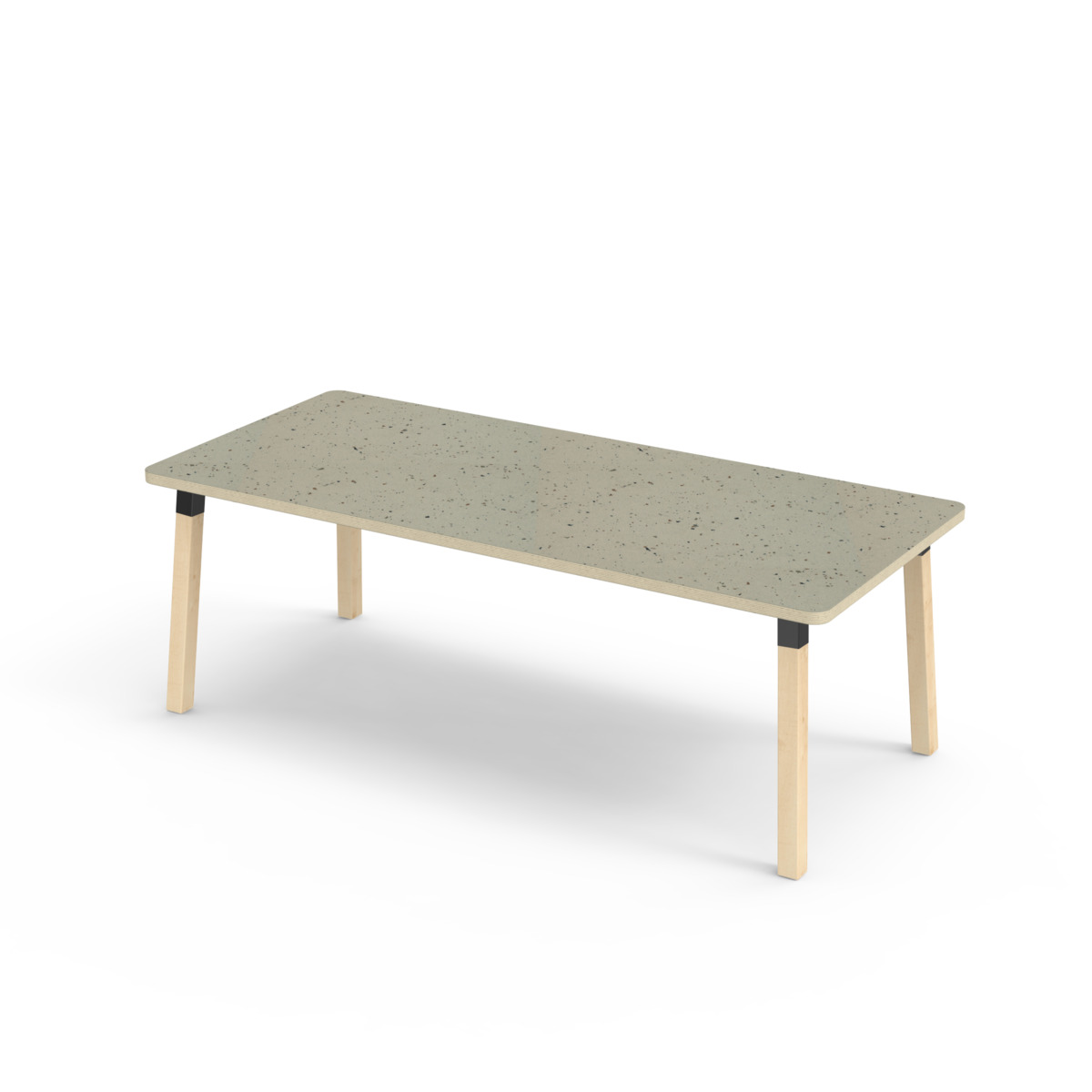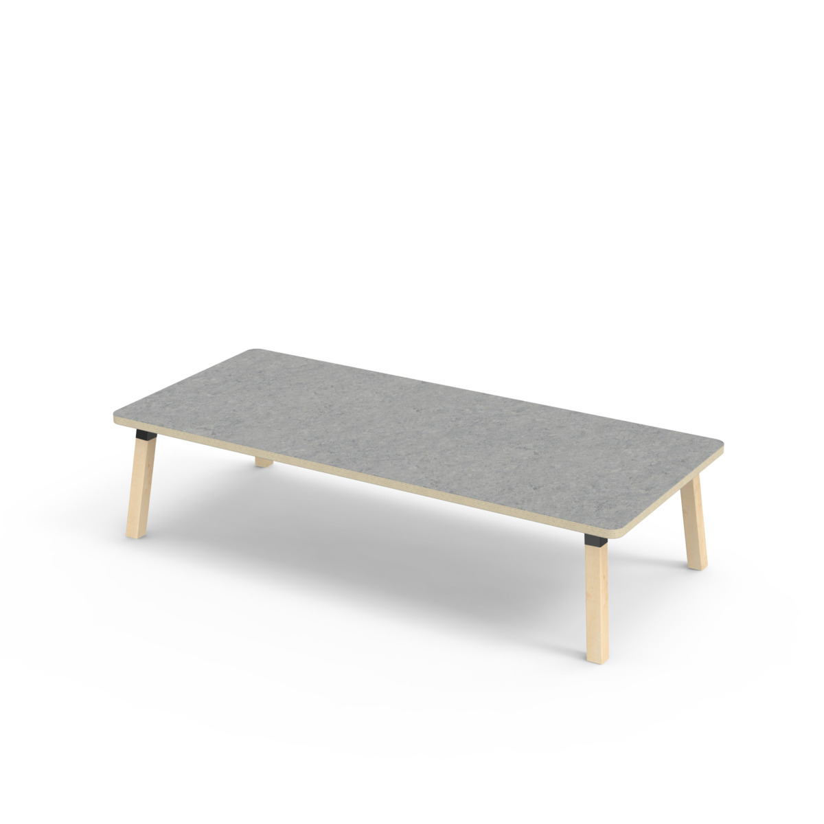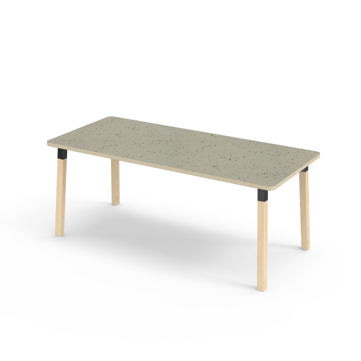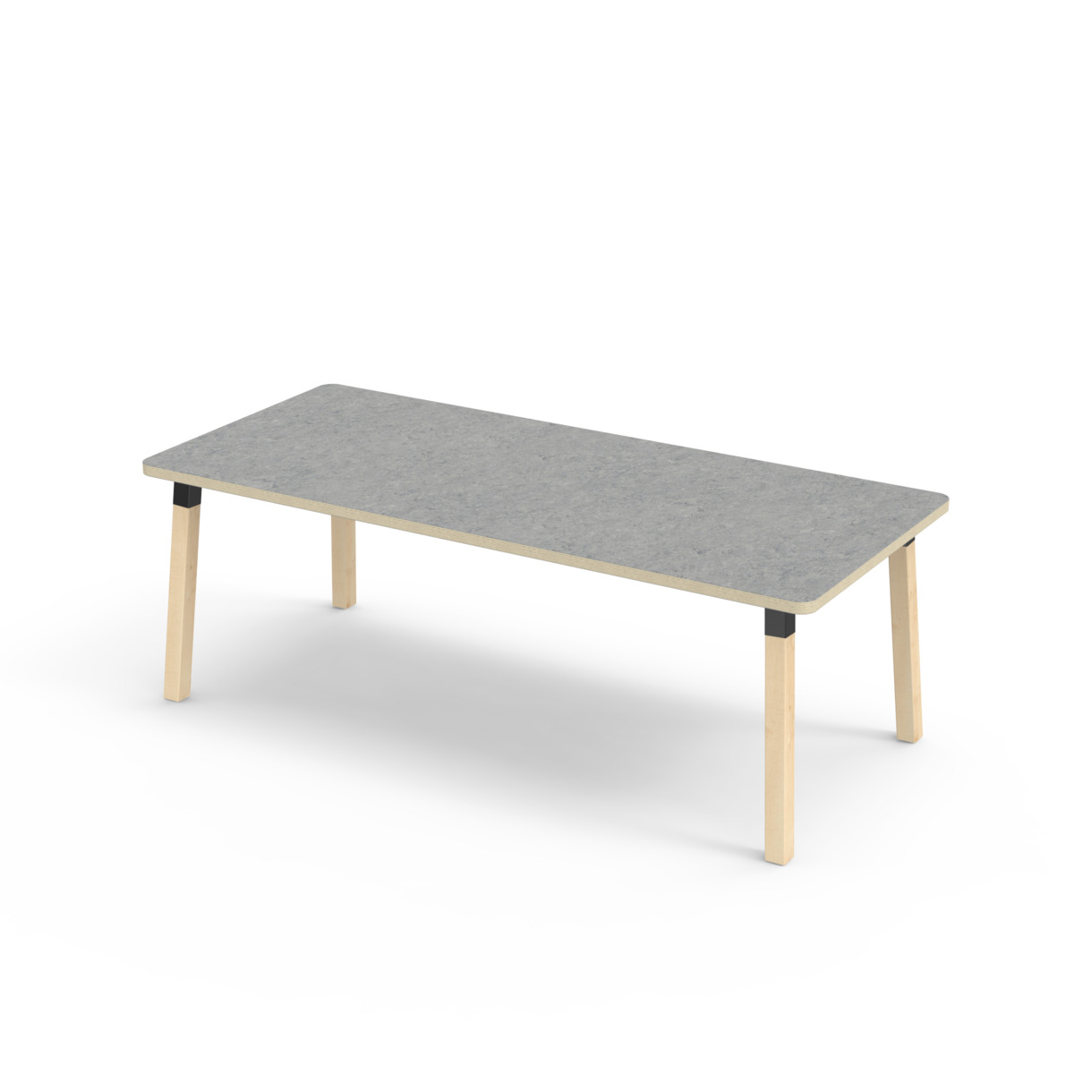 Bordsskiva belagd med akustik linoleum, vilket ger en mjuk och behaglig yta samtidigt som det bidrar till en bättre ljudmiljö. Med en hörnradie på 40 mm får bordet en modern och stilren design. Benen är tillverkade av klarlackad massiv björk och monterade i en robust vit metallhylsa. Denna konstruktion garanterar både stabilitet och hållbarhet. Benen är något snett vinklade ut mot bordsskivans hörn. Monteringen är enkel och smidig – du behöver bara fästa metallhylsorna i de förberedda fästpunkterna i bordsskivan.