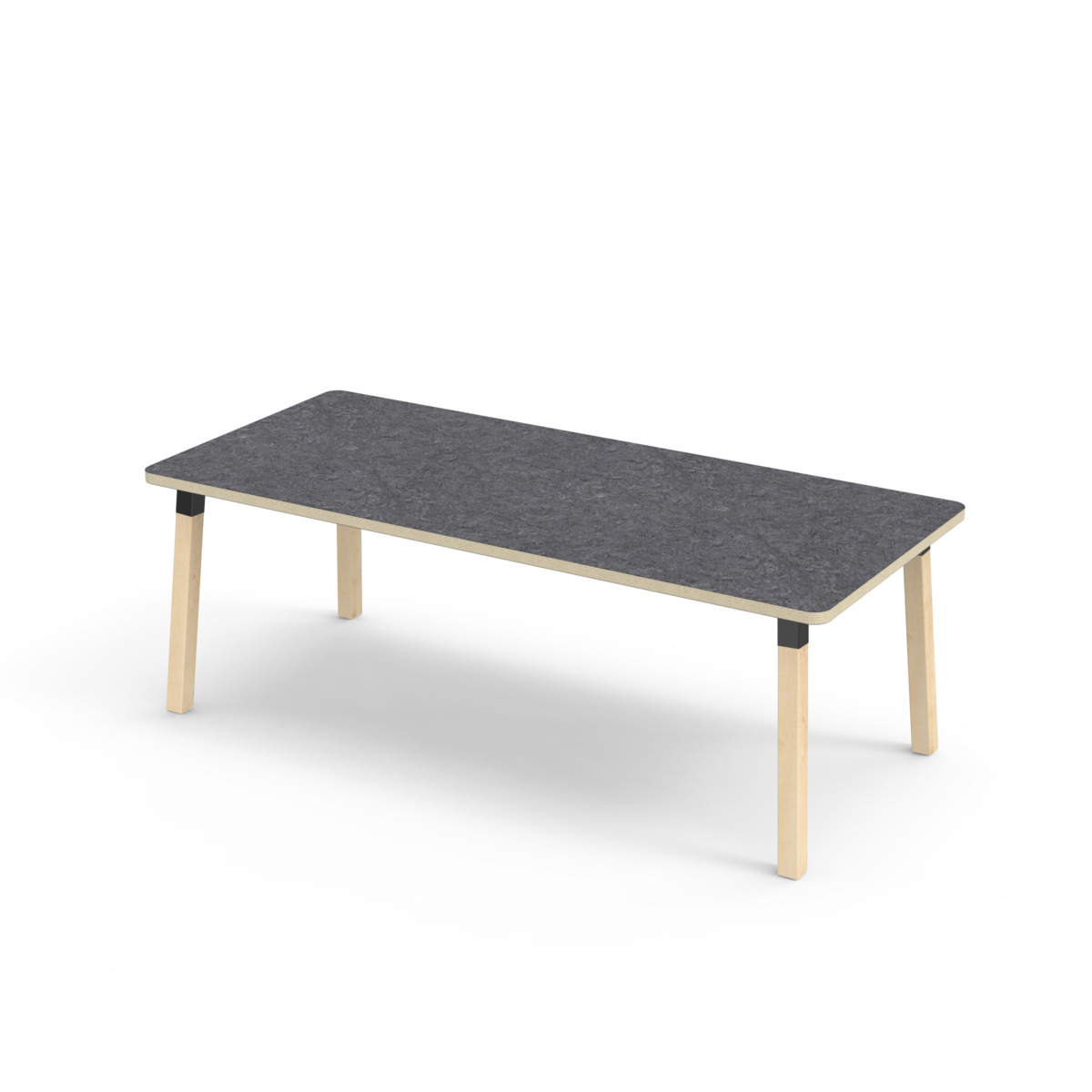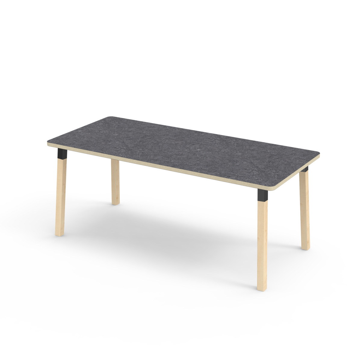 Bordsskiva belagd med akustik linoleum, vilket ger en mjuk och behaglig yta samtidigt som det bidrar till en bättre ljudmiljö. Med en hörnradie på 40 mm får bordet en modern och stilren design. Benen är tillverkade av klarlackad massiv björk och monterade i en robust svart metallhylsa. Denna konstruktion garanterar både stabilitet och hållbarhet. Benen är något snett vinklade ut mot bordsskivans hörn. Monteringen är enkel och smidig – du behöver bara fästa metallhylsorna i de förberedda fästpunkterna i bordsskivan.