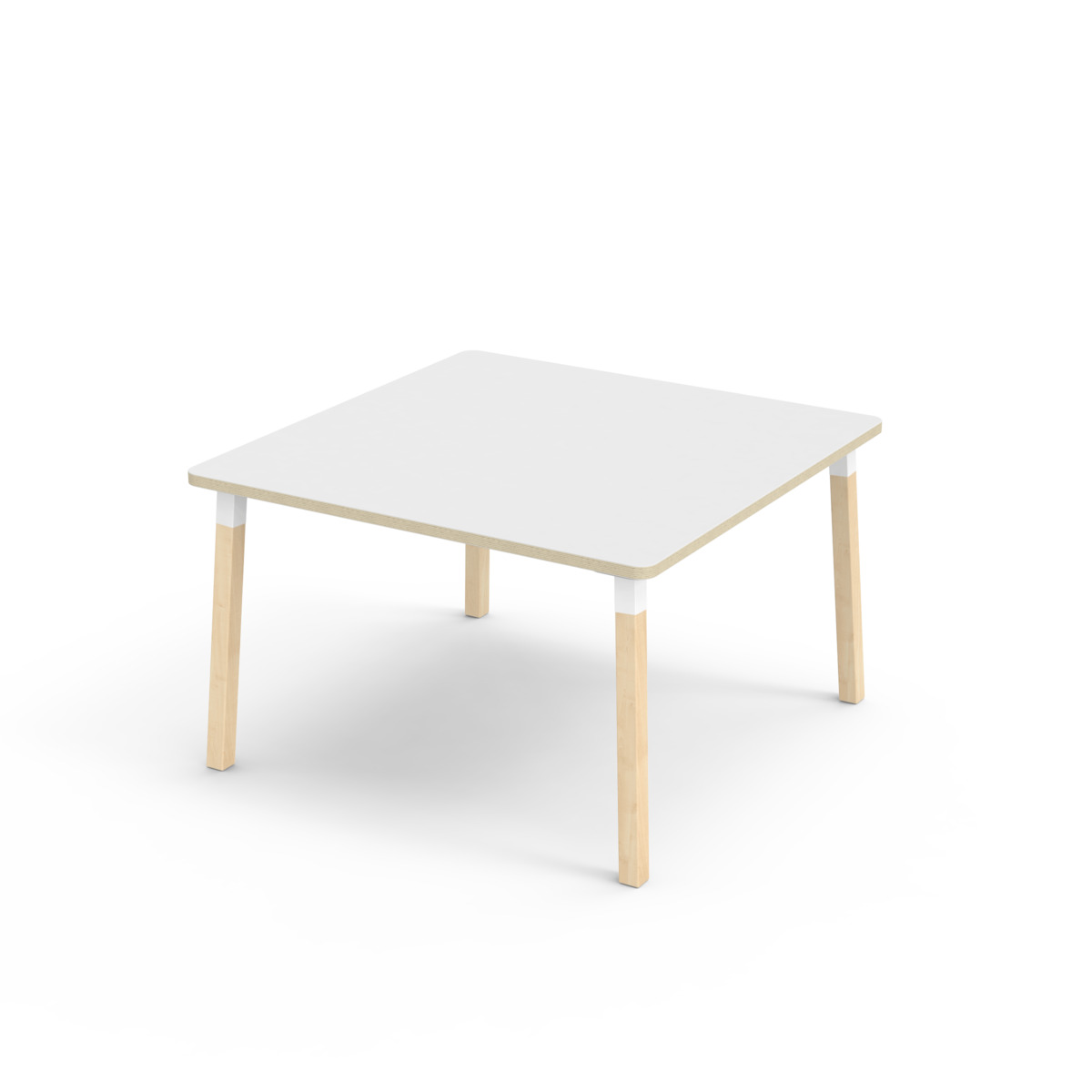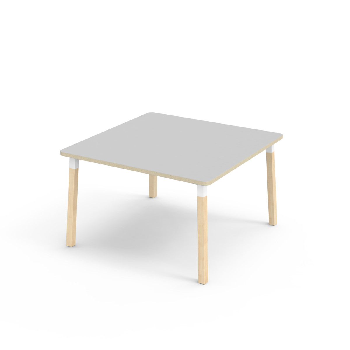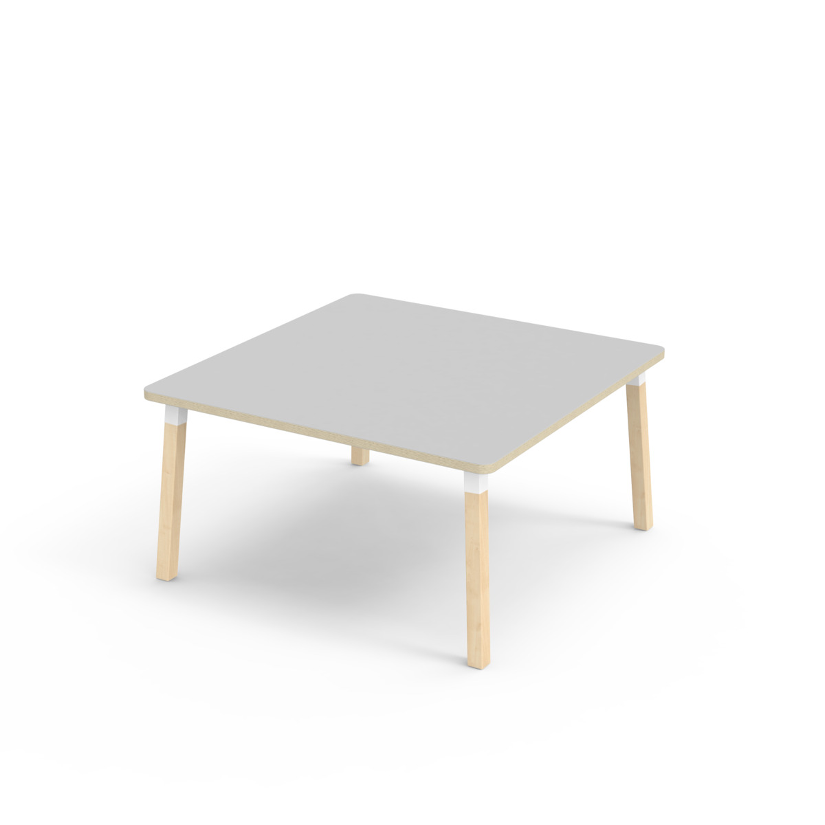 Ljuddämpande bordsskiva belagd med högtryckslaminat, vilket ger en tålig yta. Med en hörnradie på 40 mm får bordet en modern och stilren design. Benen är tillverkade av klarlackad massiv björk och monterade i en robust vit metallhylsa. Denna konstruktion garanterar både stabilitet och hållbarhet. Benen är något snett vinklade ut mot bordsskivans hörn. Monteringen är enkel och smidig – du behöver bara fästa metallhylsorna i de förberedda fästpunkterna i bordsskivan.