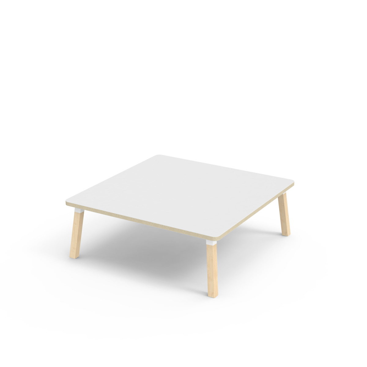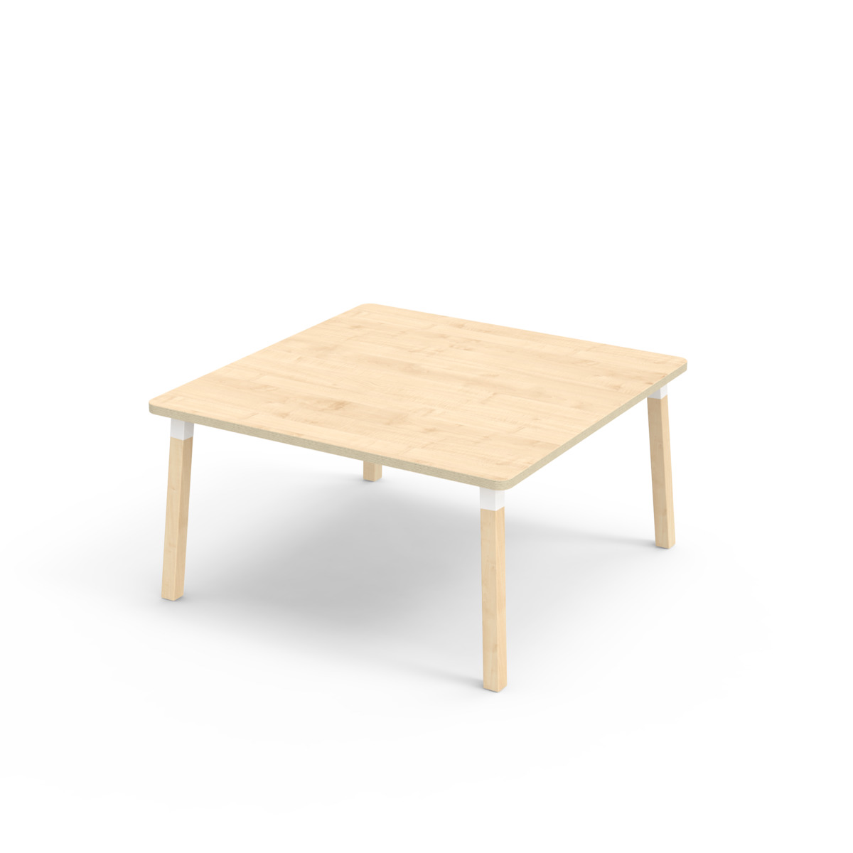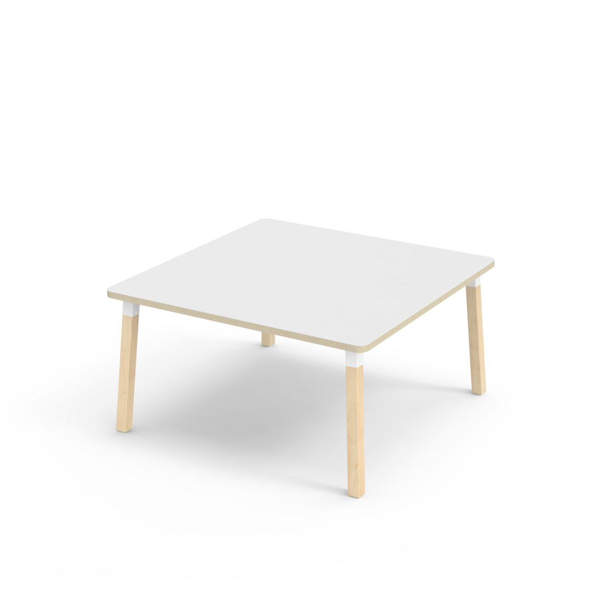 Ljuddämpande bordsskiva belagd med högtryckslaminat, vilket ger en tålig yta. Med en hörnradie på 40 mm får bordet en modern och stilren design. Benen är tillverkade av klarlackad massiv björk och monterade i en robust vit metallhylsa. Denna konstruktion garanterar både stabilitet och hållbarhet. Benen är något snett vinklade ut mot bordsskivans hörn. Monteringen är enkel och smidig – du behöver bara fästa metallhylsorna i de förberedda fästpunkterna i bordsskivan.