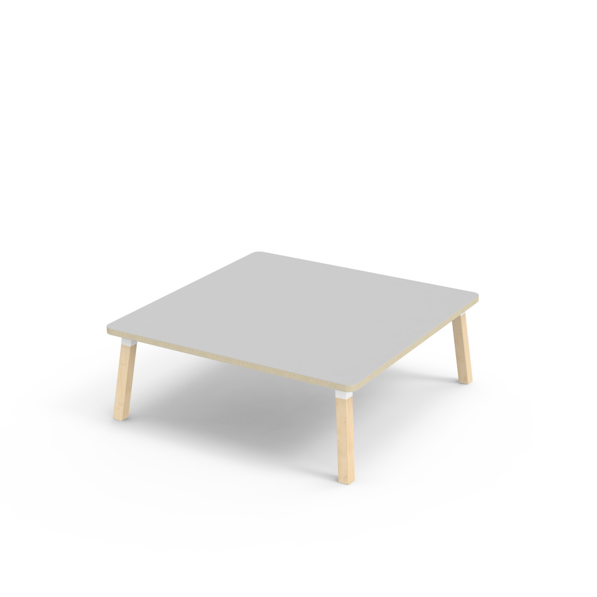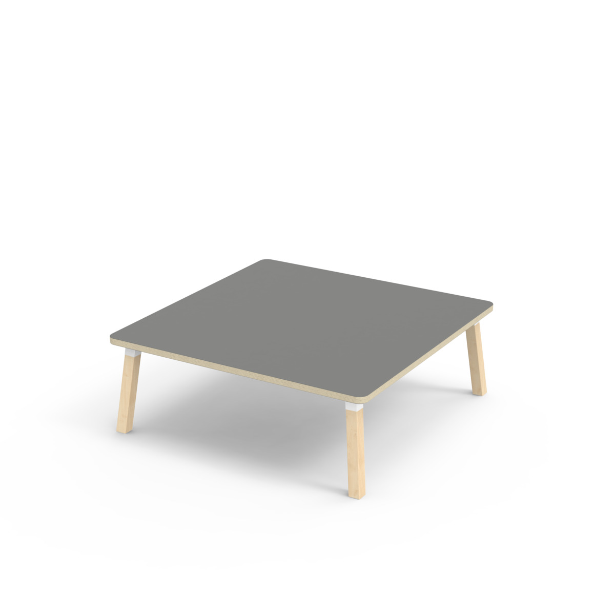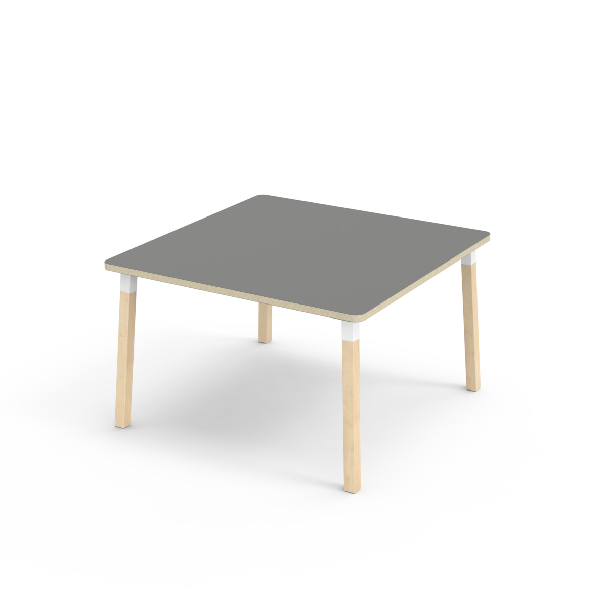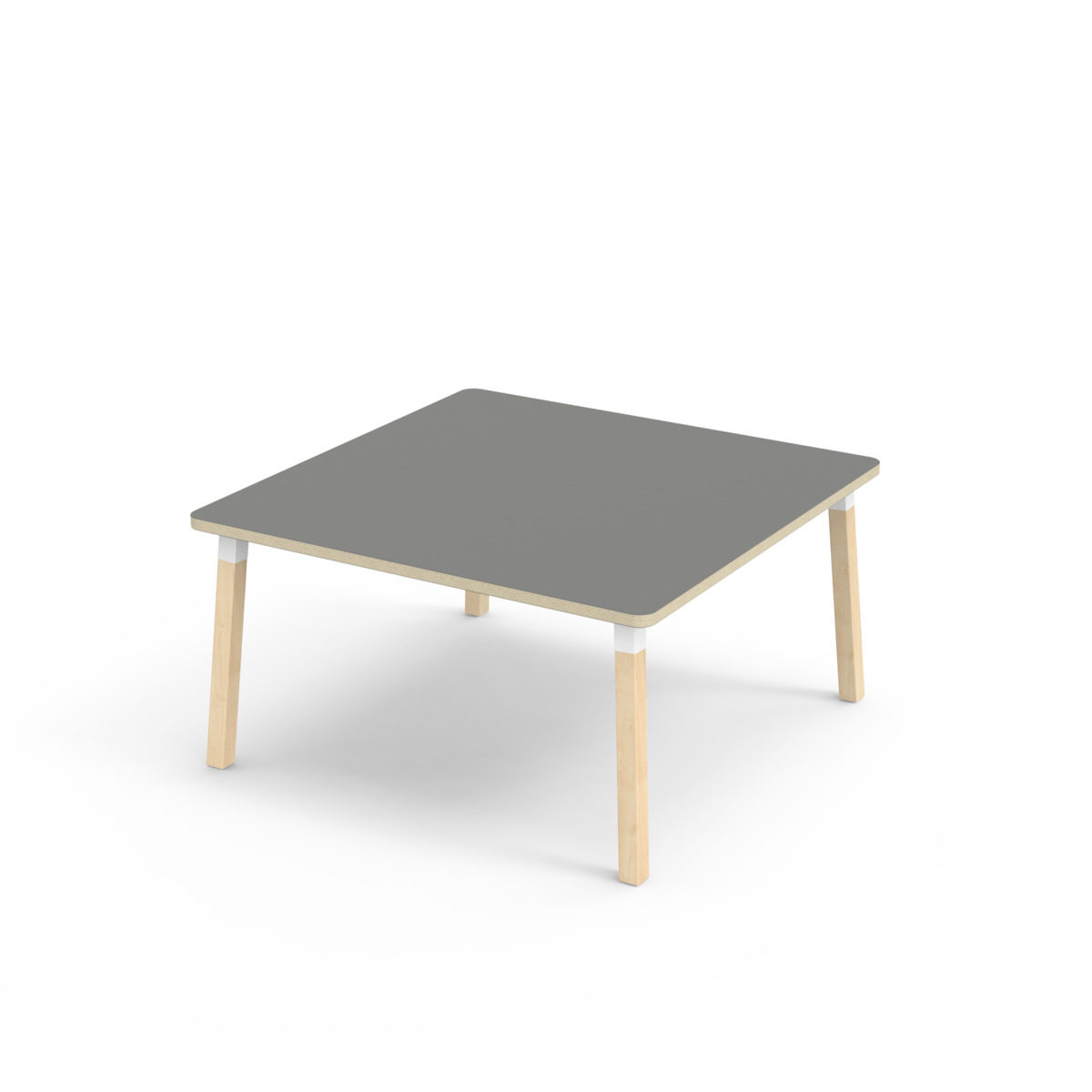 Bordsskiva belagd med akustik linoleum, vilket ger en mjuk och behaglig yta samtidigt som det bidrar till en bättre ljudmiljö. Med en hörnradie på 40 mm får bordet en modern och stilren design. Benen är tillverkade av klarlackad massiv björk och monterade i en robust vit metallhylsa. Denna konstruktion garanterar både stabilitet och hållbarhet. Benen är något snett vinklade ut mot bordsskivans hörn. Monteringen är enkel och smidig – du behöver bara fästa metallhylsorna i de förberedda fästpunkterna i bordsskivan.