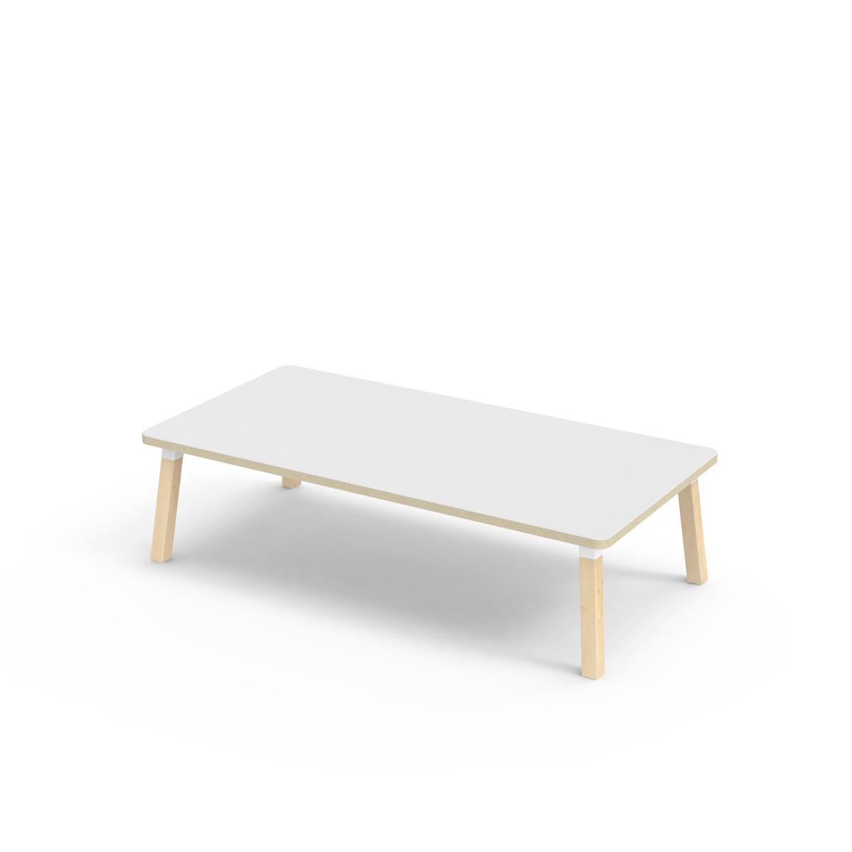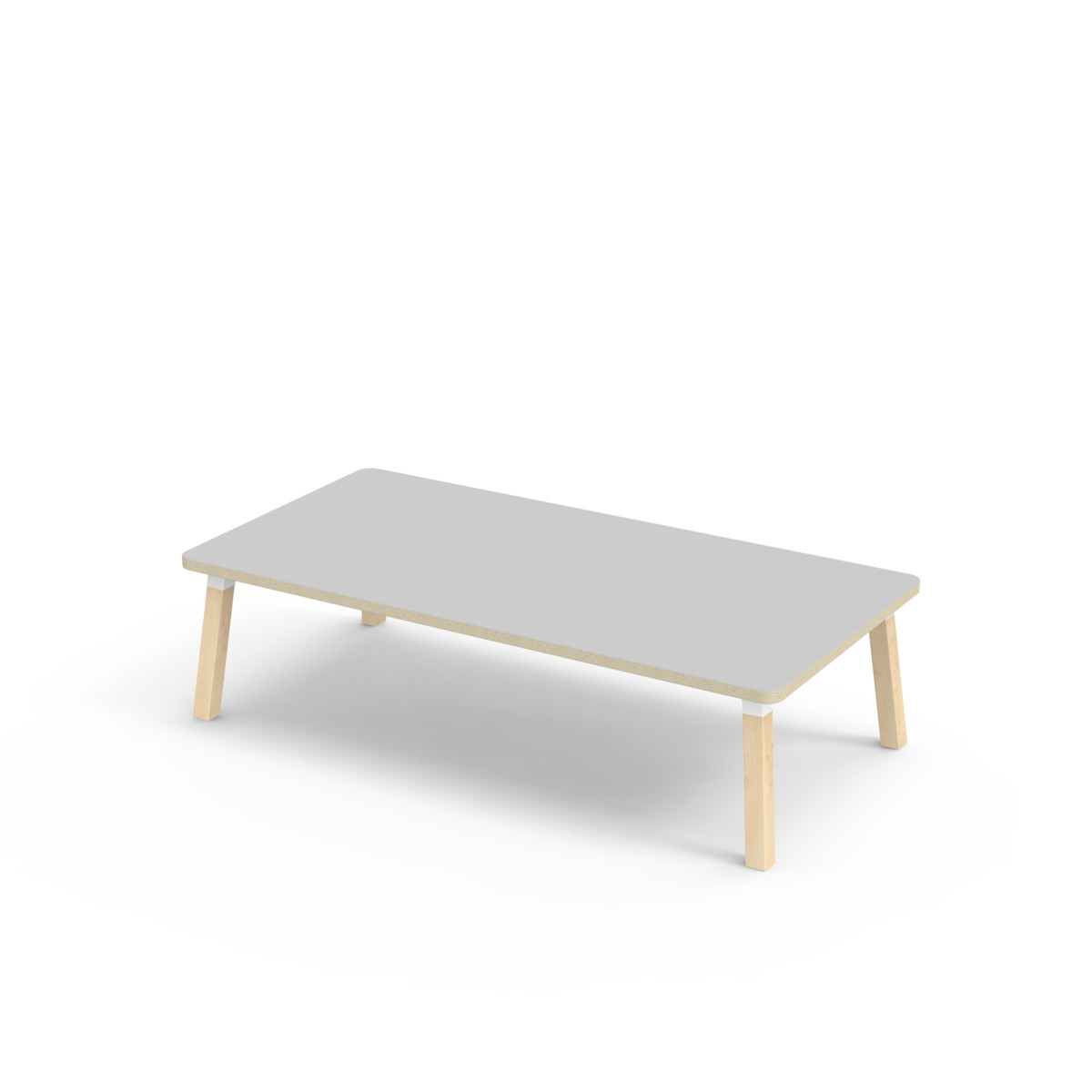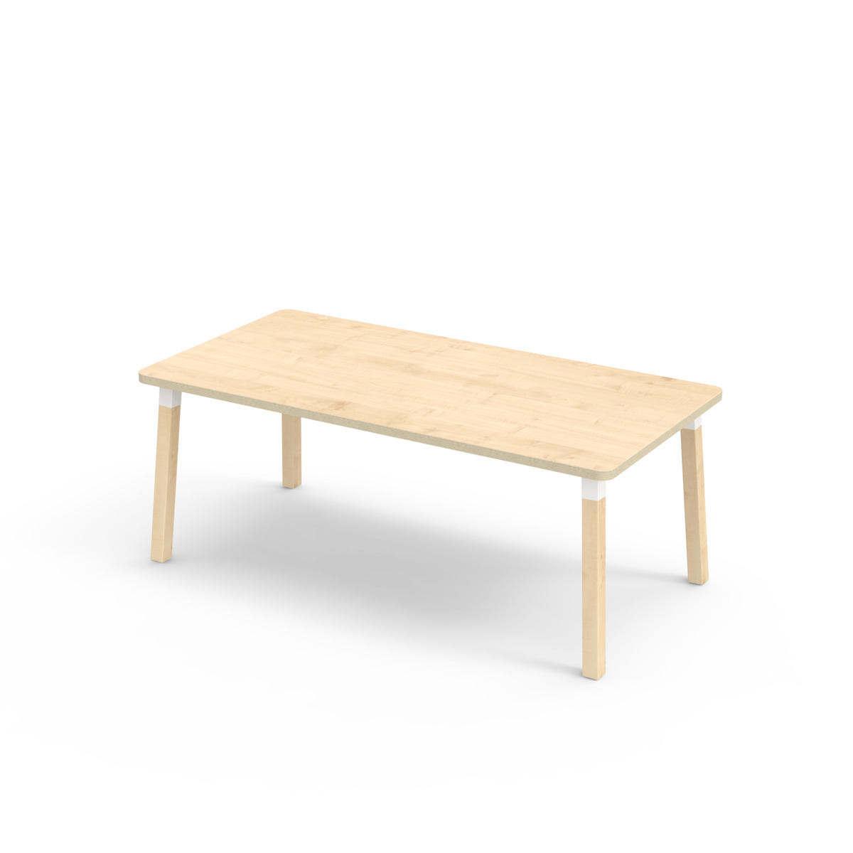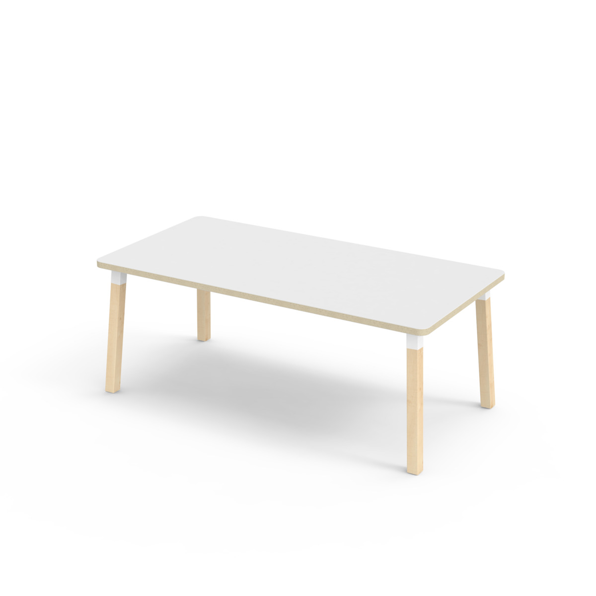 Ljuddämpande bordsskiva belagd med högtryckslaminat, vilket ger en tålig yta. Med en hörnradie på 40 mm får bordet en modern och stilren design. Benen är tillverkade av klarlackad massiv björk och monterade i en robust vit metallhylsa. Denna konstruktion garanterar både stabilitet och hållbarhet. Benen är något snett vinklade ut mot bordsskivans hörn. Monteringen är enkel och smidig – du behöver bara fästa metallhylsorna i de förberedda fästpunkterna i bordsskivan.