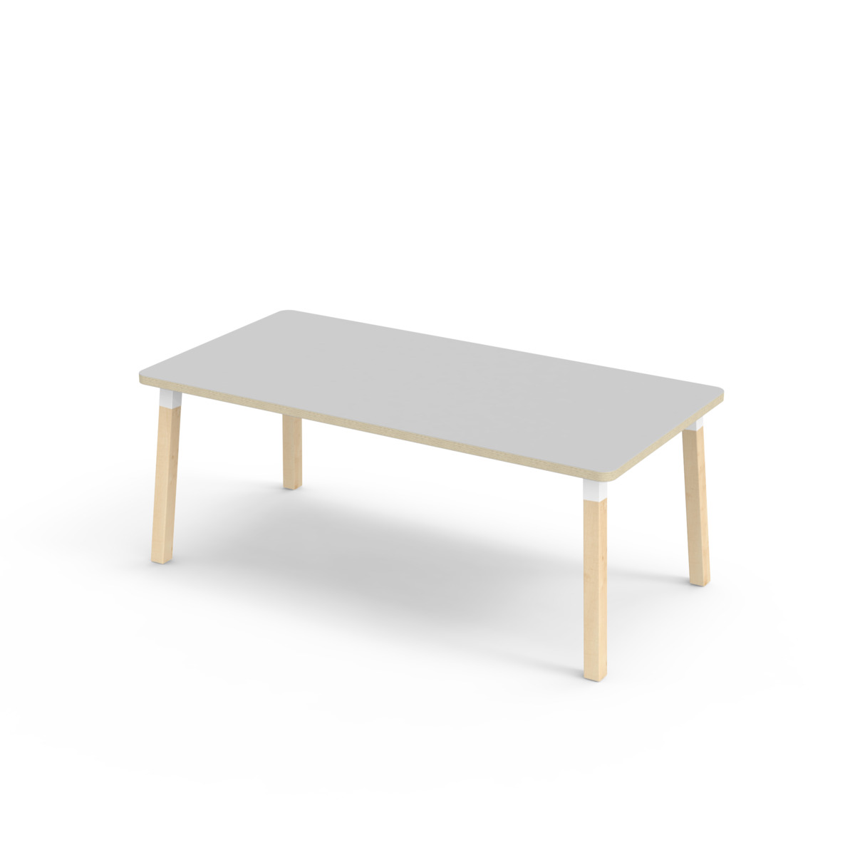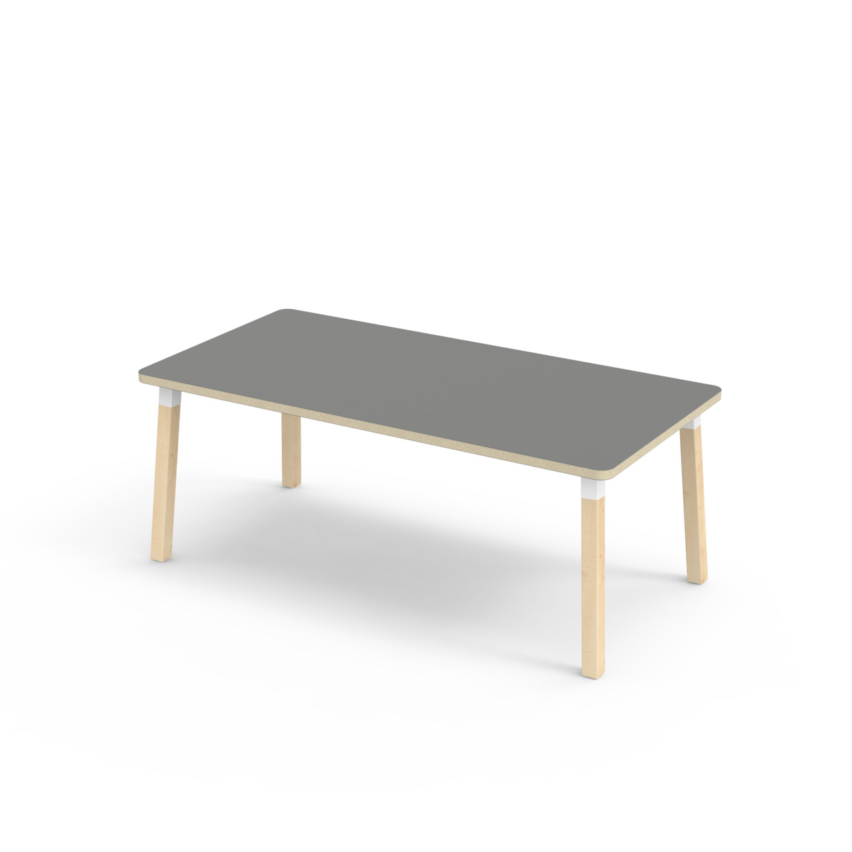 Bordsskiva belagd med akustik linoleum, vilket ger en mjuk och behaglig yta samtidigt som det bidrar till en bättre ljudmiljö. Med en hörnradie på 40 mm får bordet en modern och stilren design. Benen är tillverkade av klarlackad massiv björk och monterade i en robust vit metallhylsa. Denna konstruktion garanterar både stabilitet och hållbarhet. Benen är något snett vinklade ut mot bordsskivans hörn. Monteringen är enkel och smidig – du behöver bara fästa metallhylsorna i de förberedda fästpunkterna i bordsskivan.