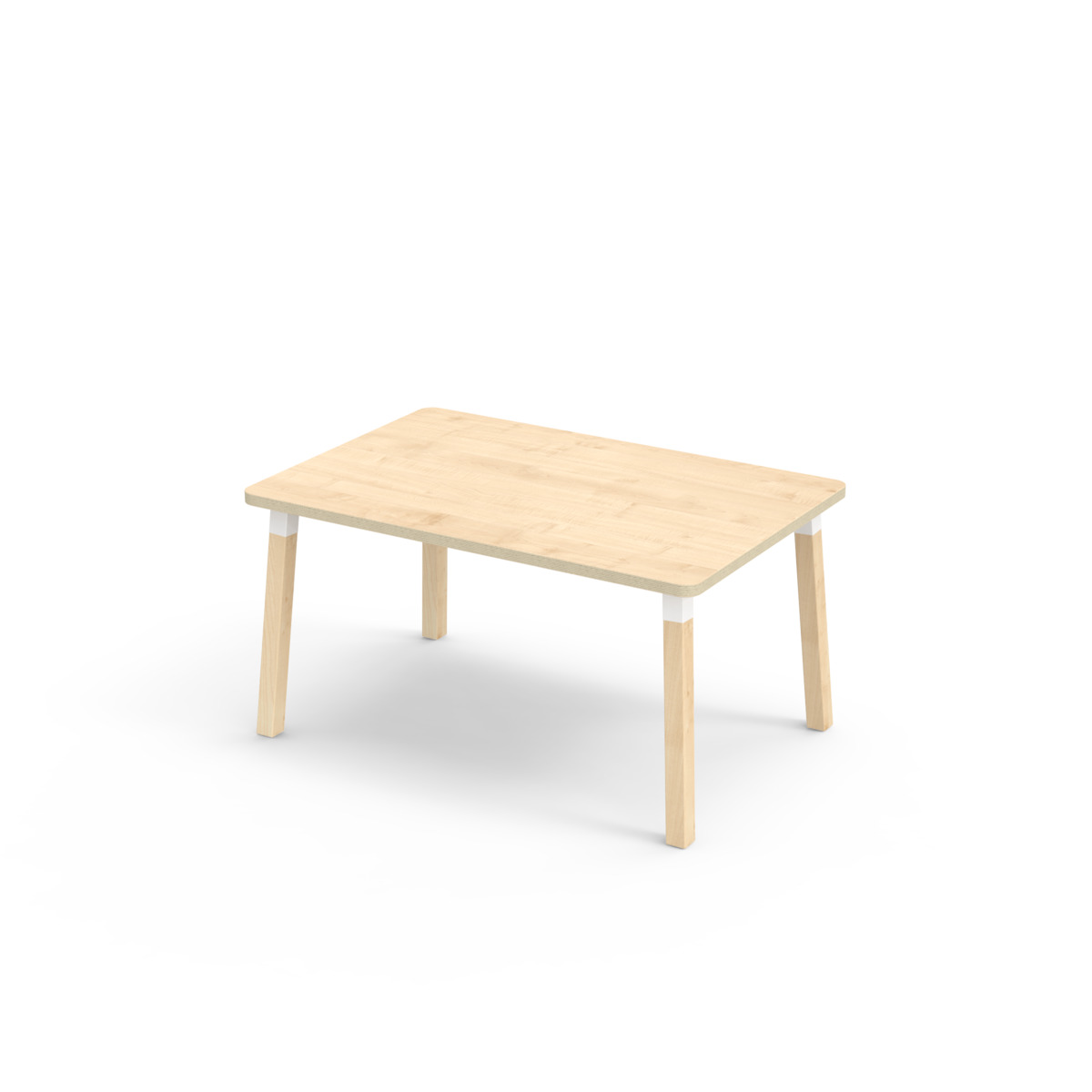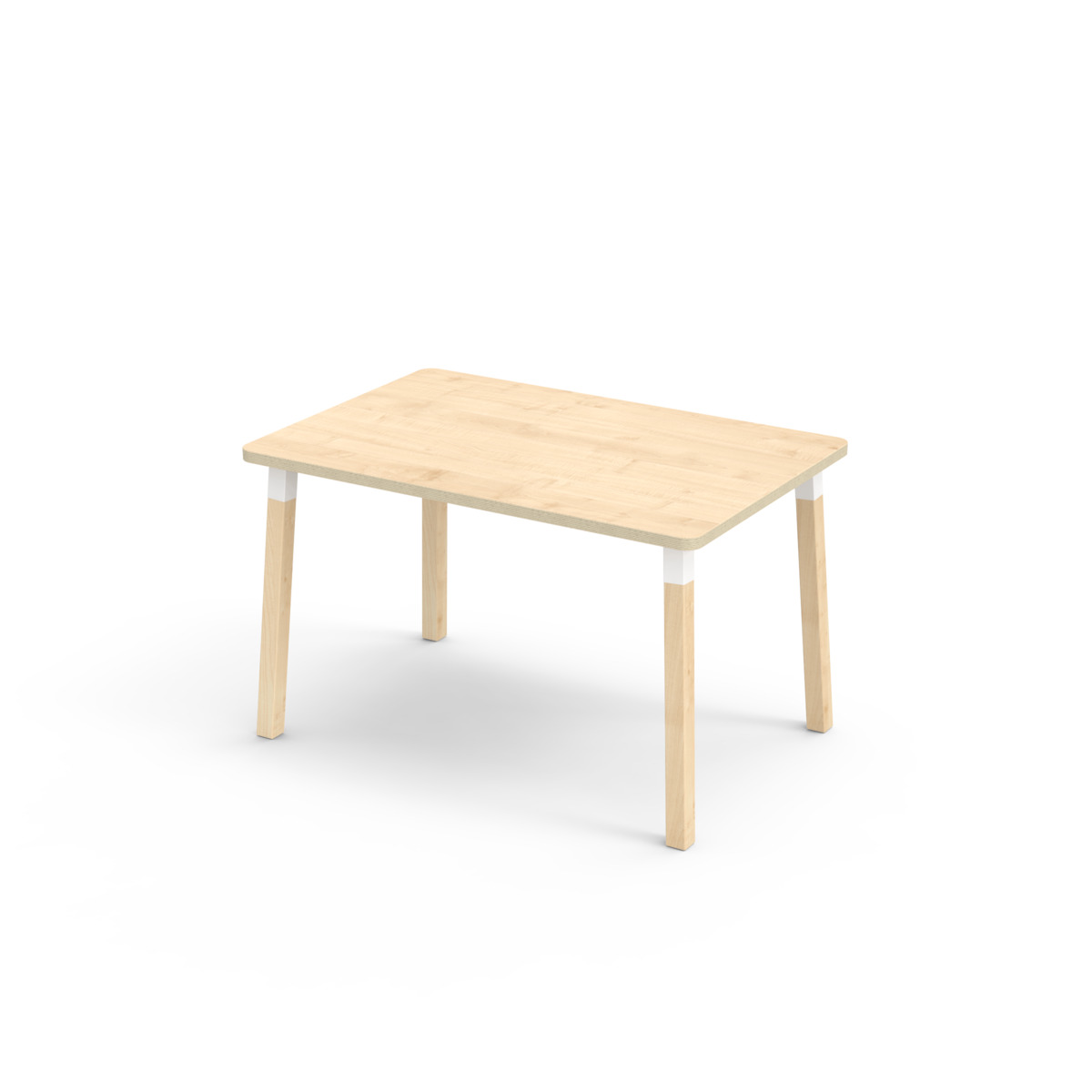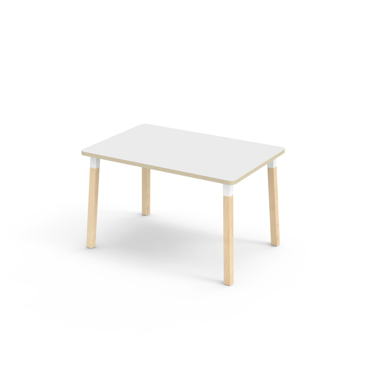 Ljuddämpande bordsskiva belagd med högtryckslaminat, vilket ger en tålig yta. Med en hörnradie på 40 mm får bordet en modern och stilren design. Benen är tillverkade av klarlackad massiv björk och monterade i en robust vit metallhylsa. Denna konstruktion garanterar både stabilitet och hållbarhet. Benen är något snett vinklade ut mot bordsskivans hörn. Monteringen är enkel och smidig – du behöver bara fästa metallhylsorna i de förberedda fästpunkterna i bordsskivan.
