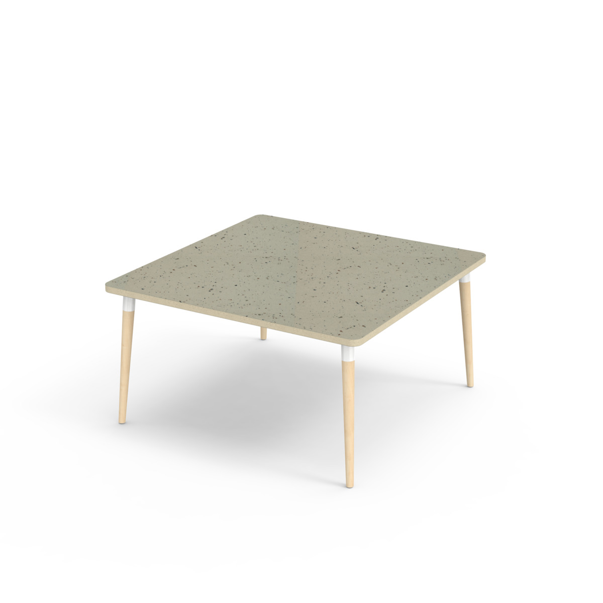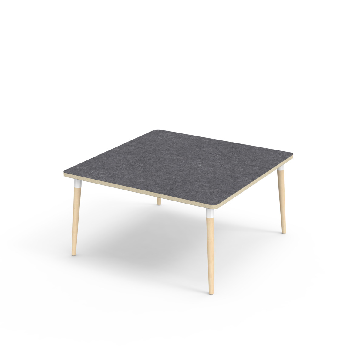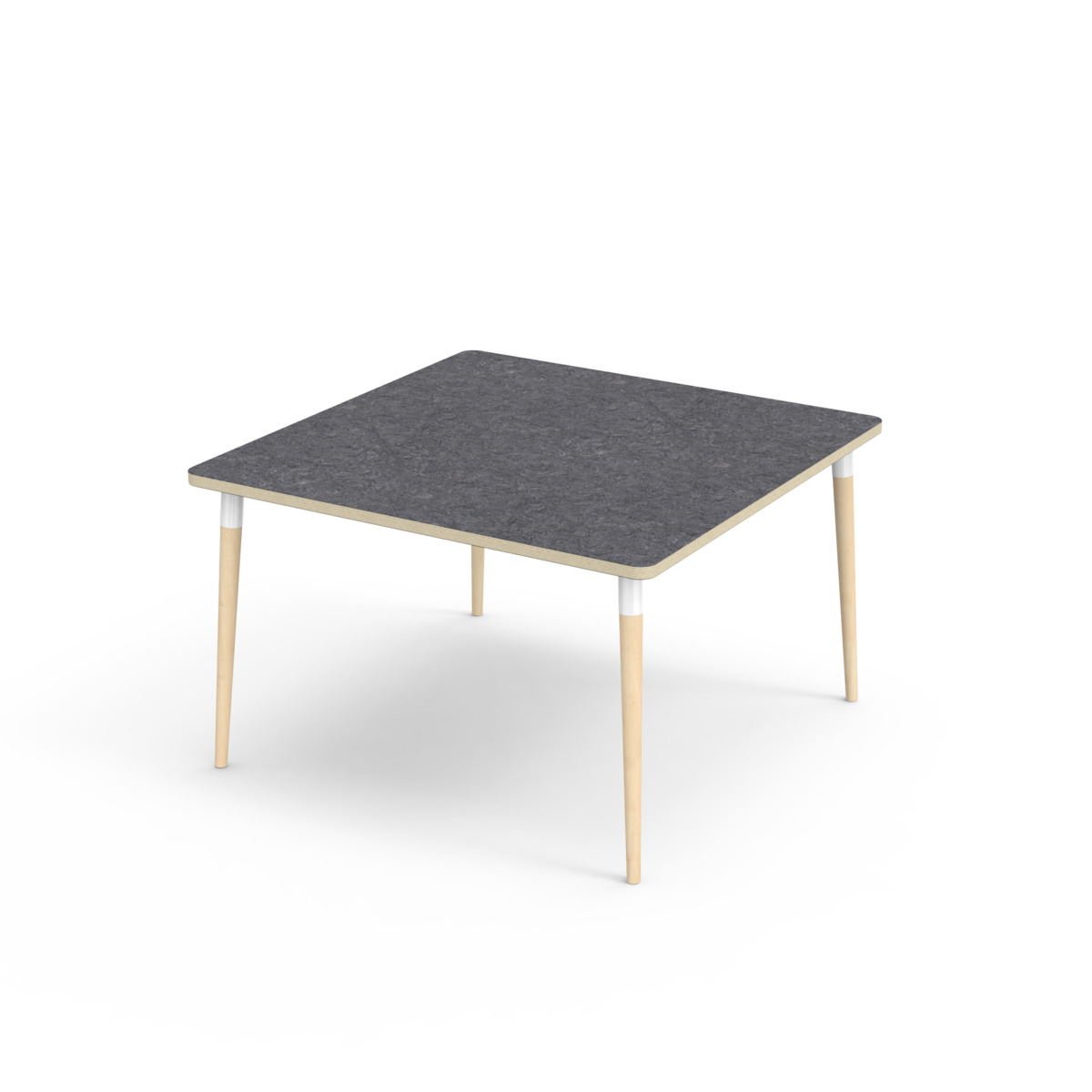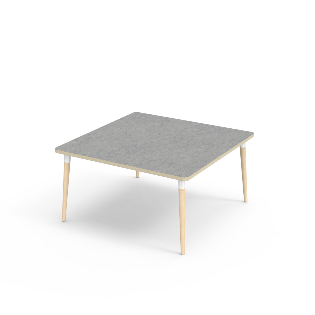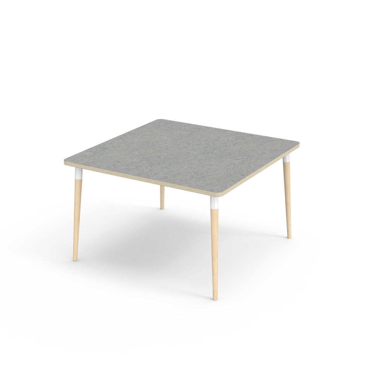 Bordsskiva belagd med akustik linoleum, vilket ger en mjuk och behaglig yta samtidigt som det bidrar till en bättre ljudmiljö. Med en hörnradie på 40 mm får bordet en modern och stilren design. Benen är konade och tillverkade av klarlackad massiv björk och monterade i en robust vit metallhylsa. Denna konstruktion garanterar både stabilitet och hållbarhet. Benen är något snett vinklade ut mot bordsskivans hörn. Monteringen är enkel och smidig – du behöver bara fästa metallhylsorna i de förberedda fästpunkterna i bordsskivan.