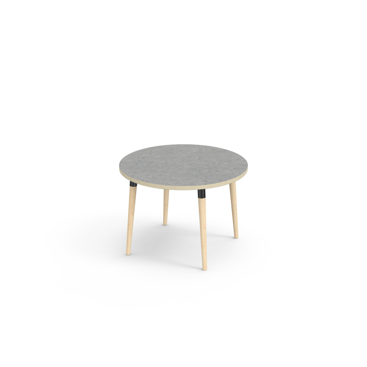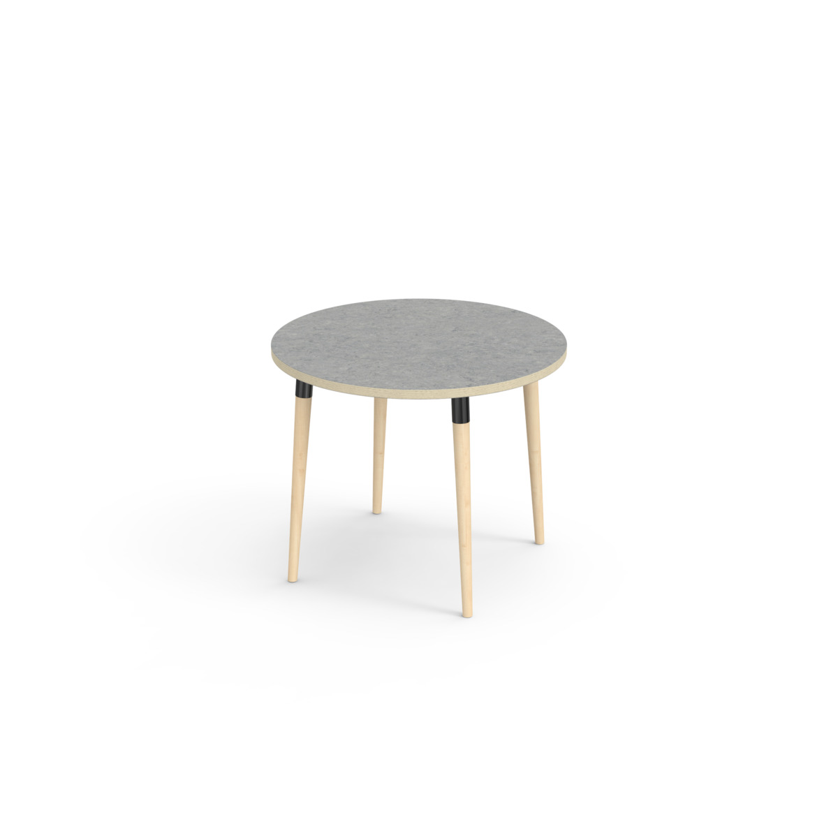 Bordsskiva belagd med akustik linoleum, vilket ger en mjuk och behaglig yta samtidigt som det bidrar till en bättre ljudmiljö. Med en hörnradie på 40 mm får bordet en modern och stilren design. Benen är konade och tillverkade av klarlackad massiv björk och monterade i en robust svart metallhylsa. Denna konstruktion garanterar både stabilitet och hållbarhet. Benen är något snett vinklade ut mot bordsskivans hörn. Monteringen är enkel och smidig – du behöver bara fästa metallhylsorna i de förberedda fästpunkterna i bordsskivan.