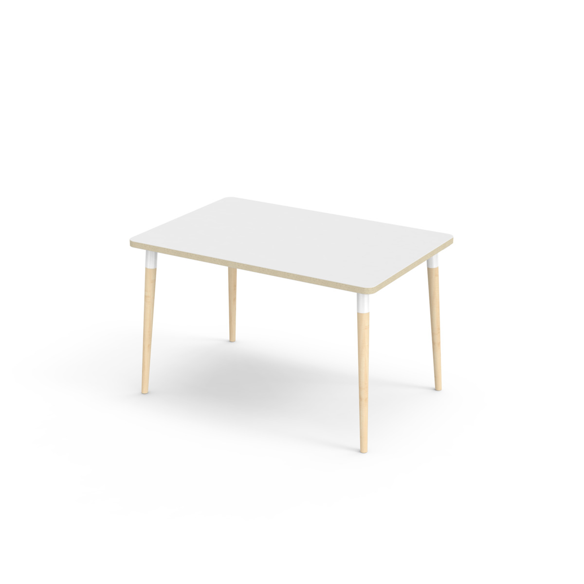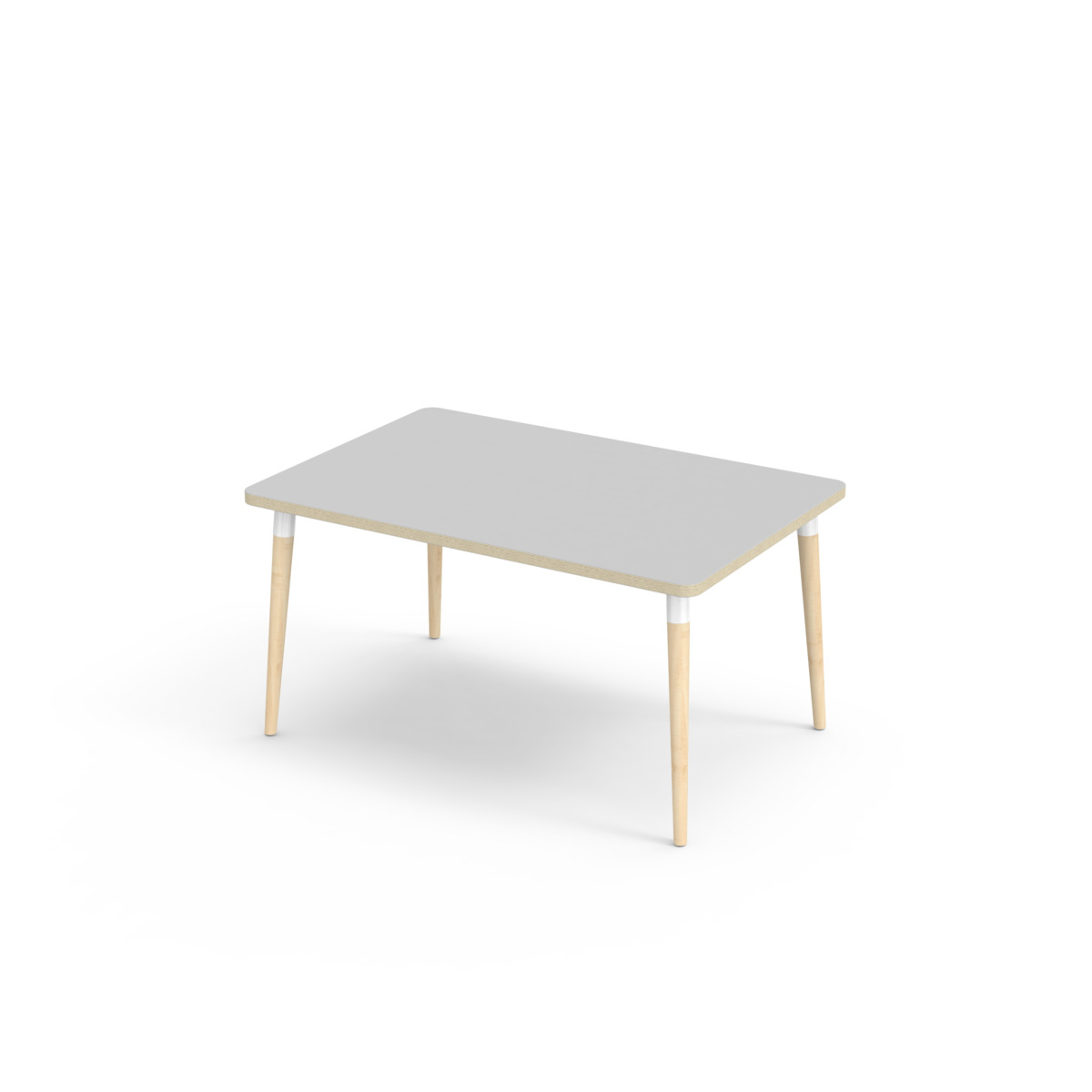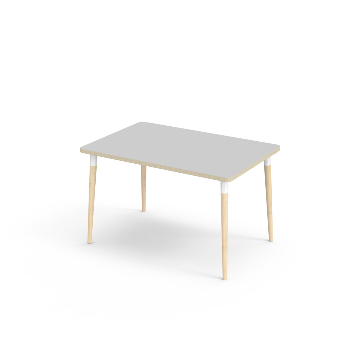Ljuddämpande bordsskiva belagd med högtryckslaminat, vilket ger en tålig yta. Med en hörnradie på 40 mm får bordet en modern och stilren design. Benen är konade och tillverkade av klarlackad massiv björk och monterade i en robust vit metallhylsa. Denna konstruktion garanterar både stabilitet och hållbarhet. Benen är något snett vinklade ut mot bordsskivans hörn. Monteringen är enkel och smidig – du behöver bara fästa metallhylsorna i de förberedda fästpunkterna i bordsskivan.