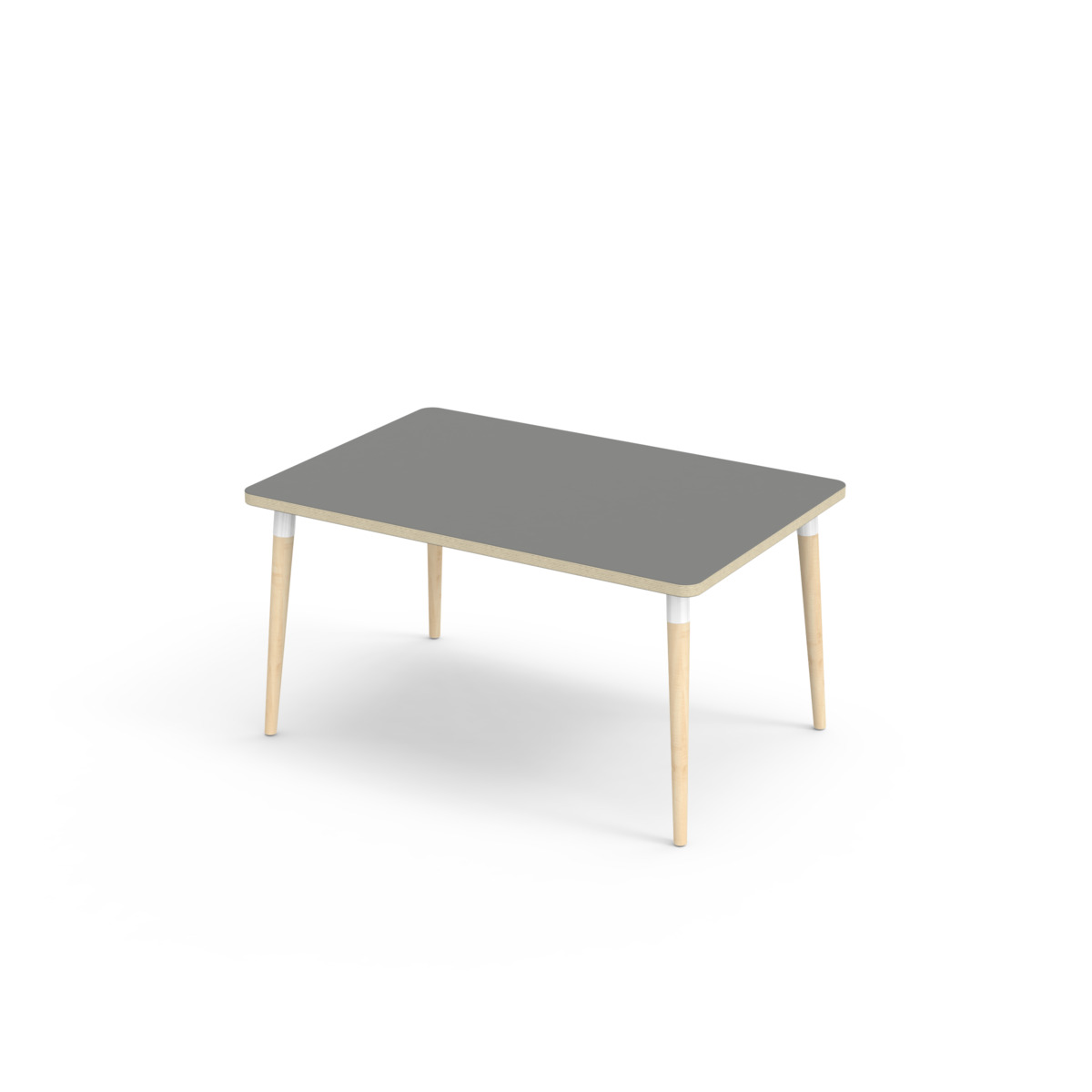 Bordsskiva belagd med akustik linoleum, vilket ger en mjuk och behaglig yta samtidigt som det bidrar till en bättre ljudmiljö. Med en hörnradie på 40 mm får bordet en modern och stilren design. Benen är konade och tillverkade av klarlackad massiv björk och monterade i en robust svart metallhylsa. Denna konstruktion garanterar både stabilitet och hållbarhet. Benen är något snett vinklade ut mot bordsskivans hörn. Monteringen är enkel och smidig – du behöver bara fästa metallhylsorna i de förberedda fästpunkterna i bordsskivan.