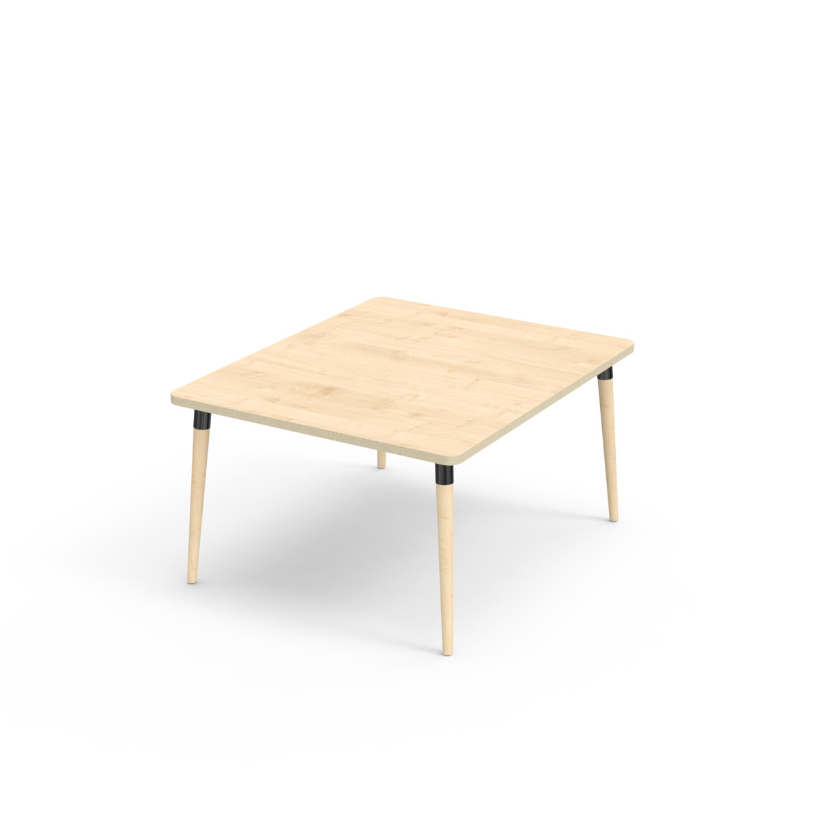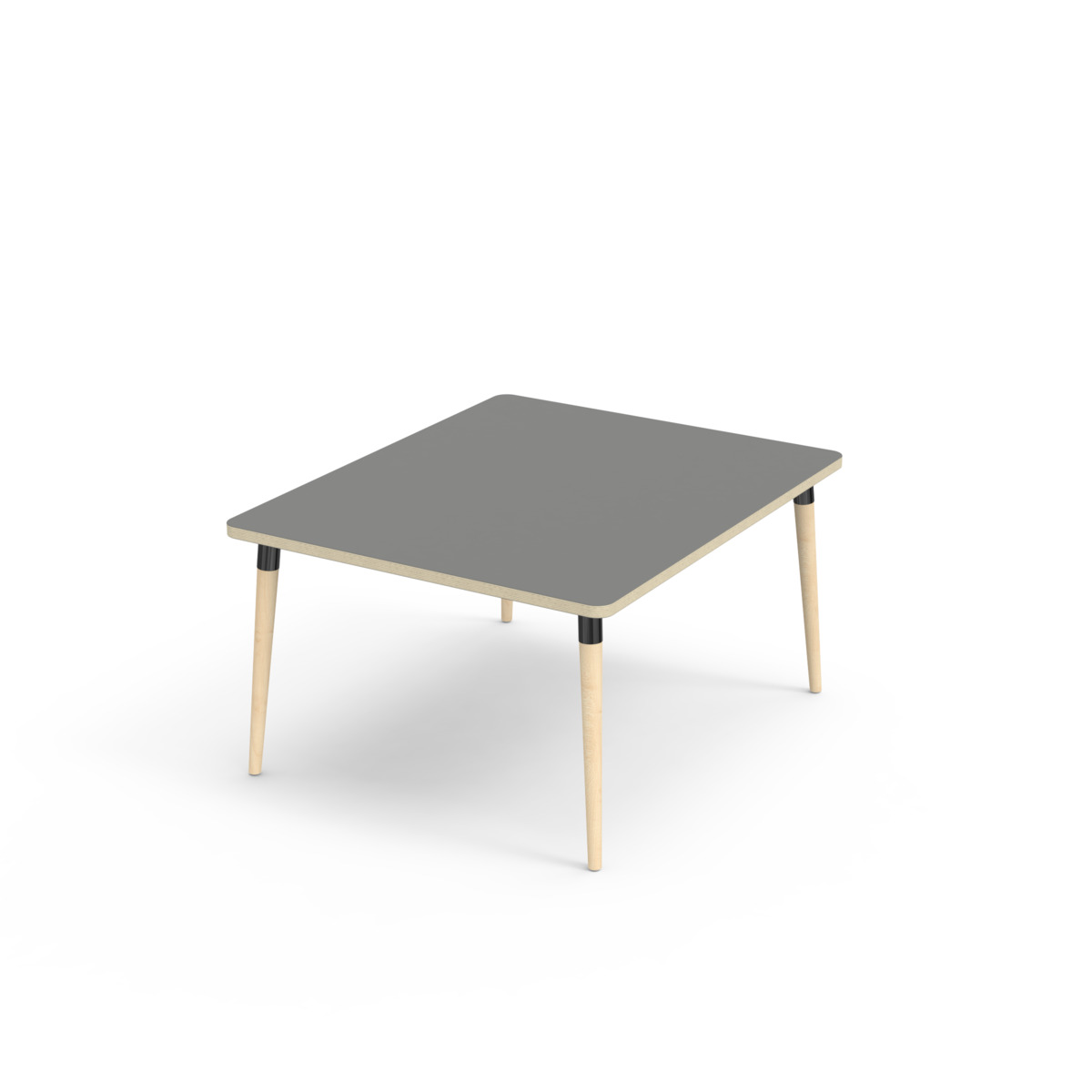 Bordsskiva belagd med akustik linoleum, vilket ger en mjuk och behaglig yta samtidigt som det bidrar till en bättre ljudmiljö. Med en hörnradie på 40 mm får bordet en modern och stilren design. Benen är konade och tillverkade av klarlackad massiv björk och monterade i en robust svart metallhylsa. Denna konstruktion garanterar både stabilitet och hållbarhet. Benen är något snett vinklade ut mot bordsskivans hörn. Monteringen är enkel och smidig – du behöver bara fästa metallhylsorna i de förberedda fästpunkterna i bordsskivan.