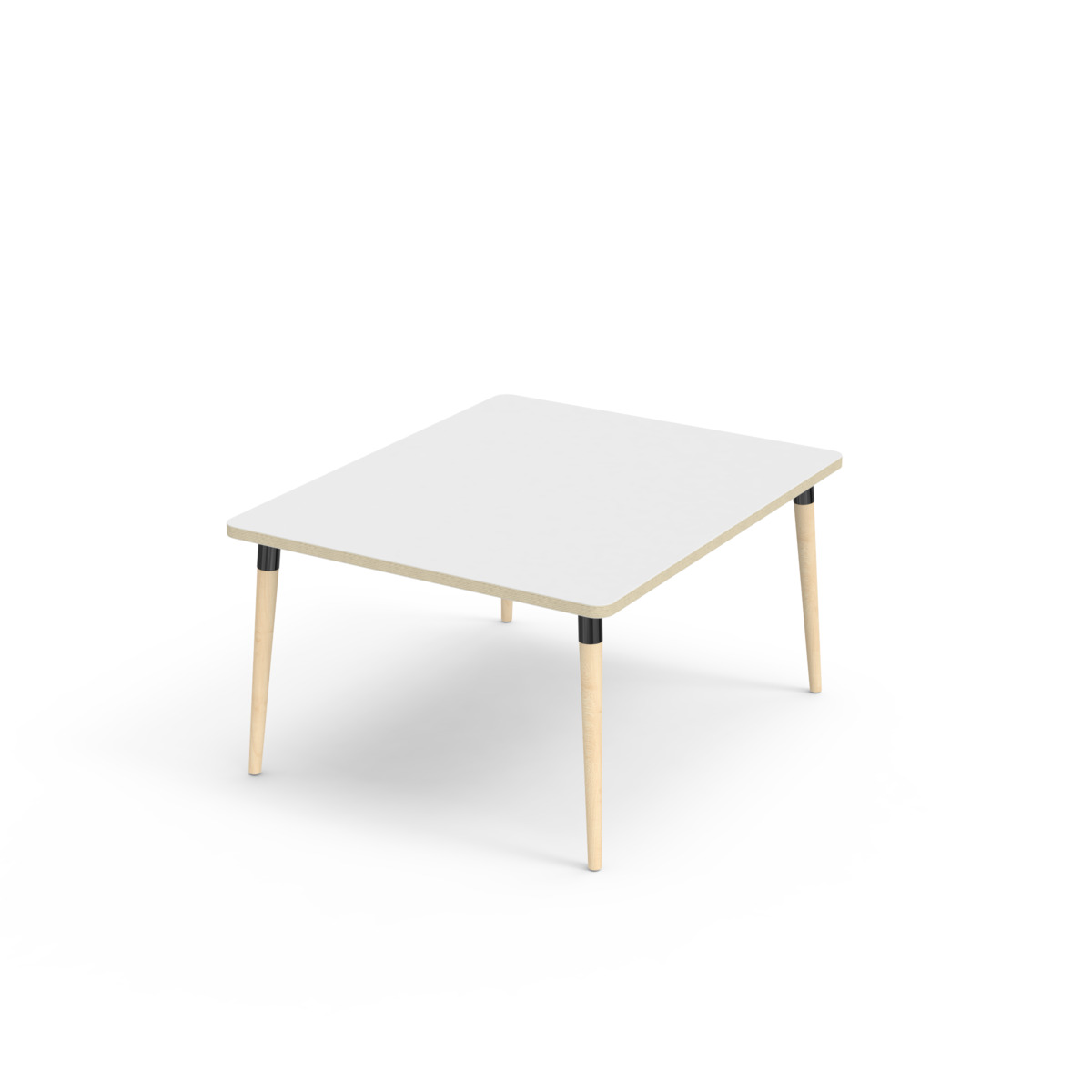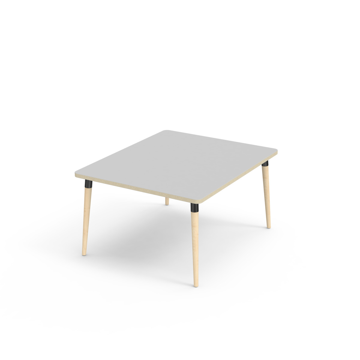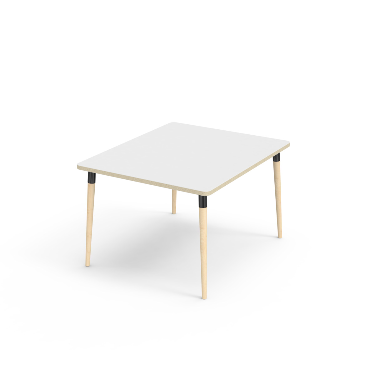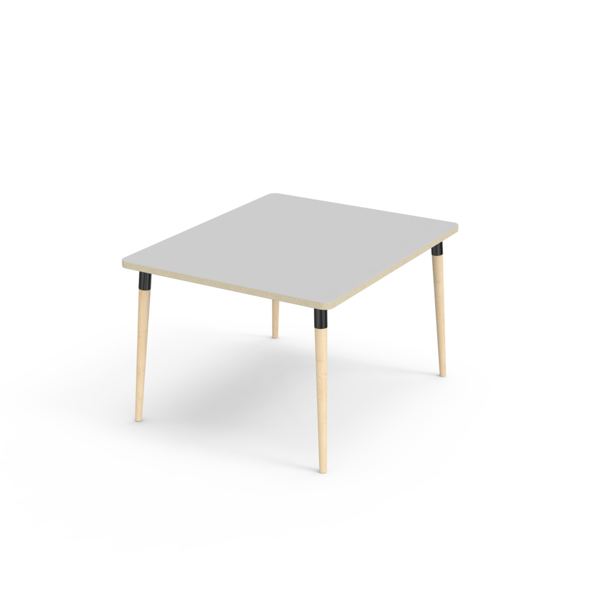 Ljuddämpande bordsskiva belagd med högtryckslaminat, vilket ger en tålig yta. Med en hörnradie på 40 mm får bordet en modern och stilren design. Benen är konade och tillverkade av klarlackad massiv björk och monterade i en robust vit metallhylsa. Denna konstruktion garanterar både stabilitet och hållbarhet. Benen är något snett vinklade ut mot bordsskivans hörn. Monteringen är enkel och smidig – du behöver bara fästa metallhylsorna i de förberedda fästpunkterna i bordsskivan.