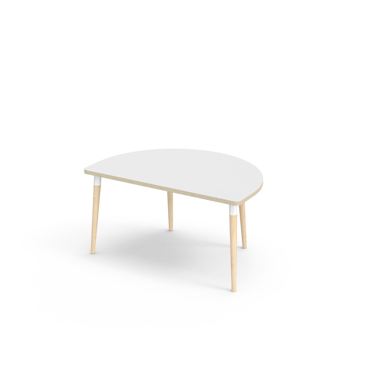 Ljuddämpande bordsskiva belagd med högtryckslaminat, vilket ger en tålig yta. Med en hörnradie på 40 mm får bordet en modern och stilren design. Benen är konade och tillverkade av klarlackad massiv björk och monterade i en robust vit metallhylsa. Denna konstruktion garanterar både stabilitet och hållbarhet. Benen är något snett vinklade ut mot bordsskivans hörn. Monteringen är enkel och smidig – du behöver bara fästa metallhylsorna i de förberedda fästpunkterna i bordsskivan.