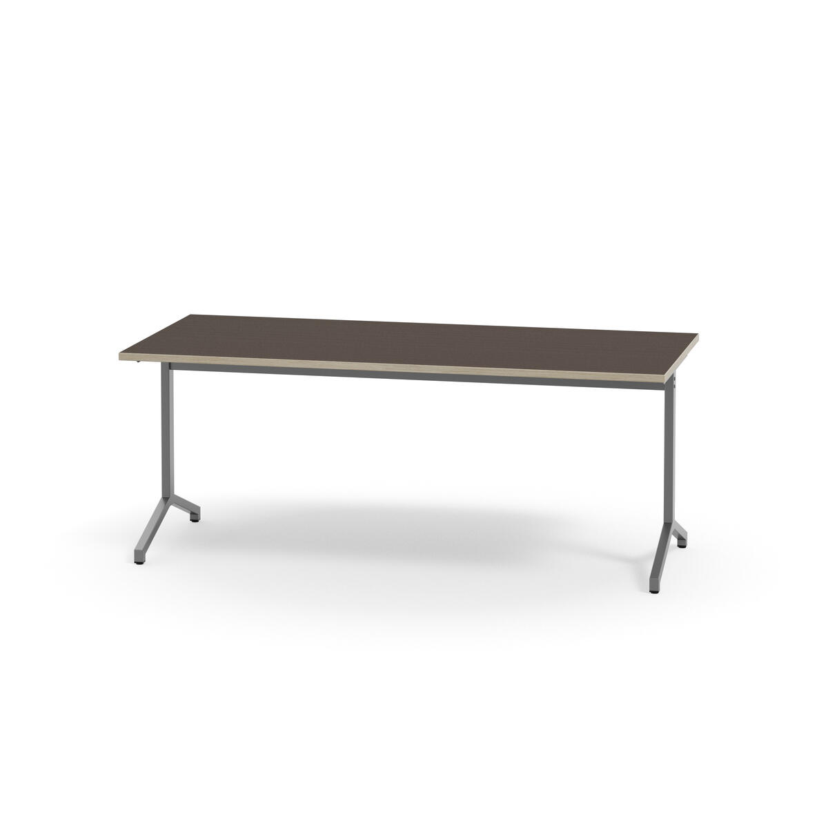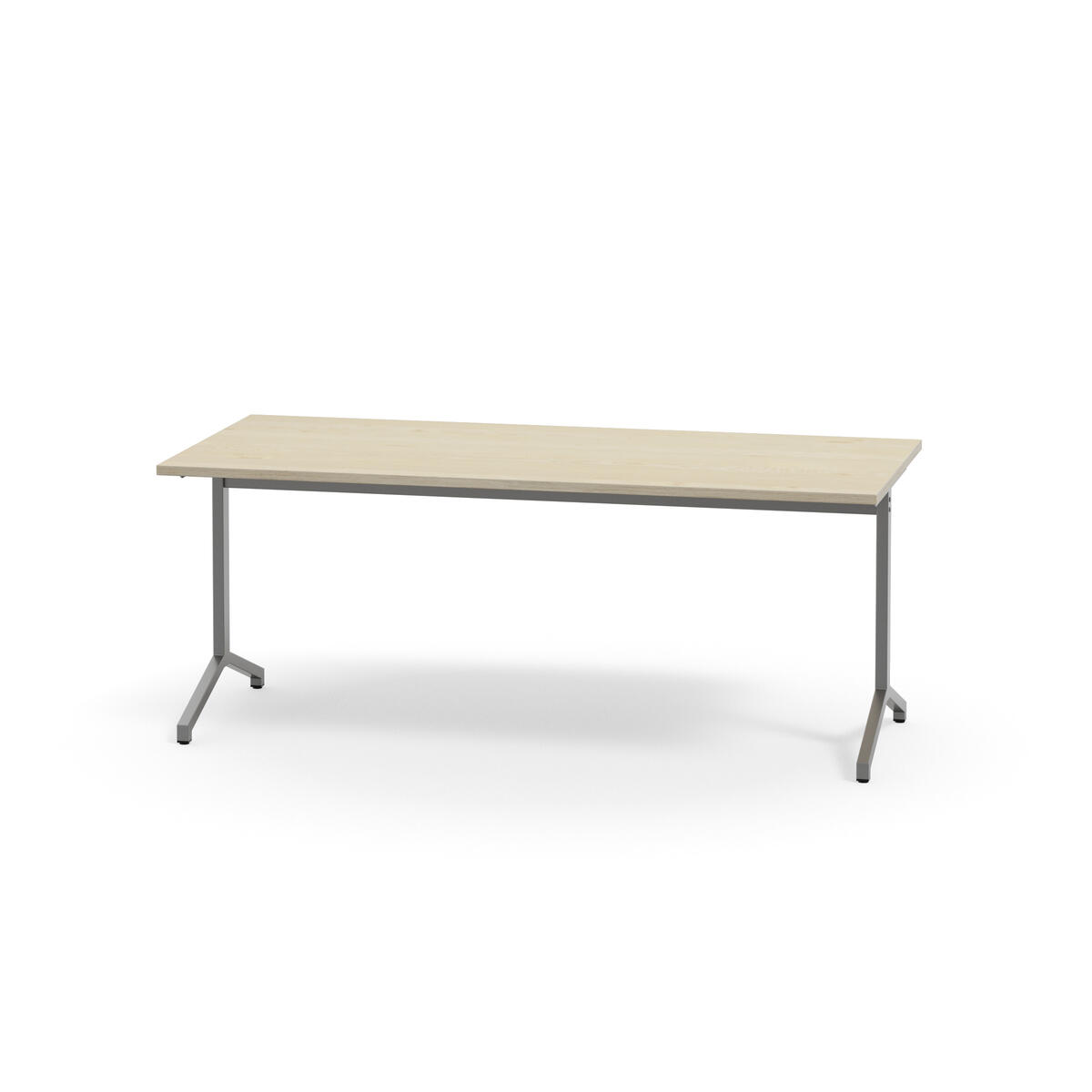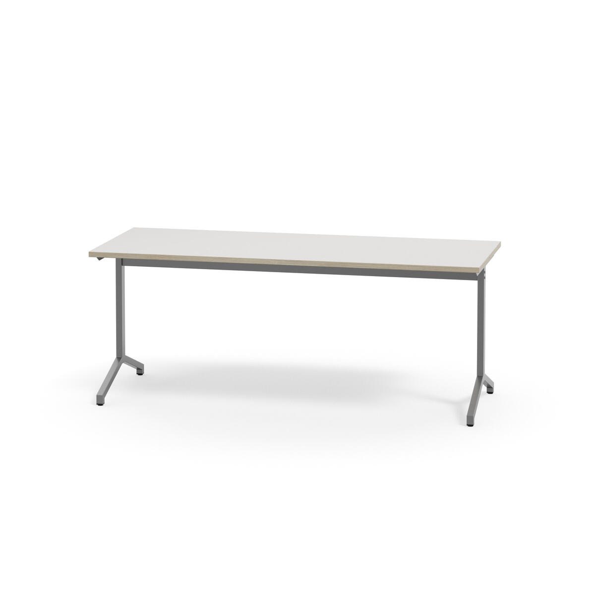 Bordsskiva i akustiklaminat. Ställbara tassar för anpassning till ojämna golv. Silverlackerat stativ, RAL 9006.