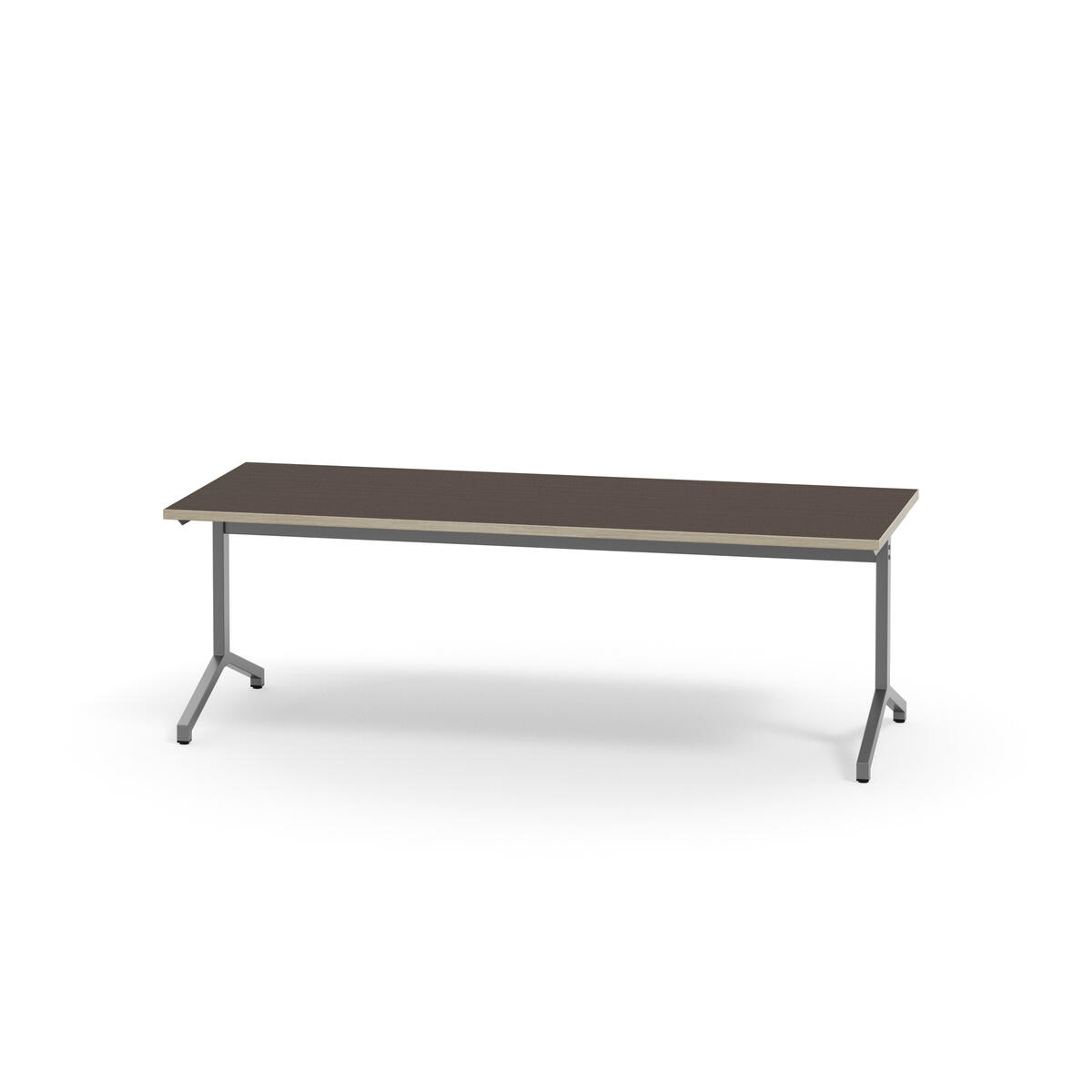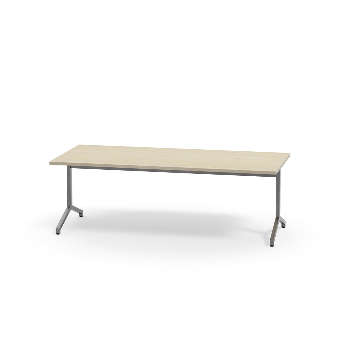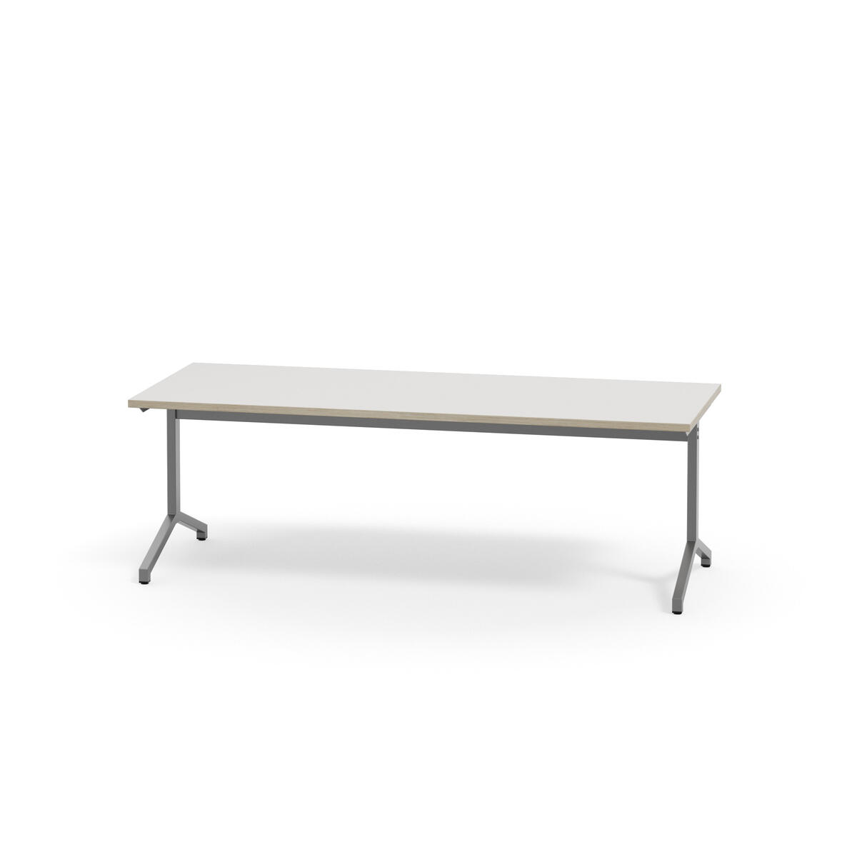 Bordsskiva i akustiklaminat. Ställbara tassar för anpassning till ojämna golv. Silverlackerat stativ, RAL 9006.