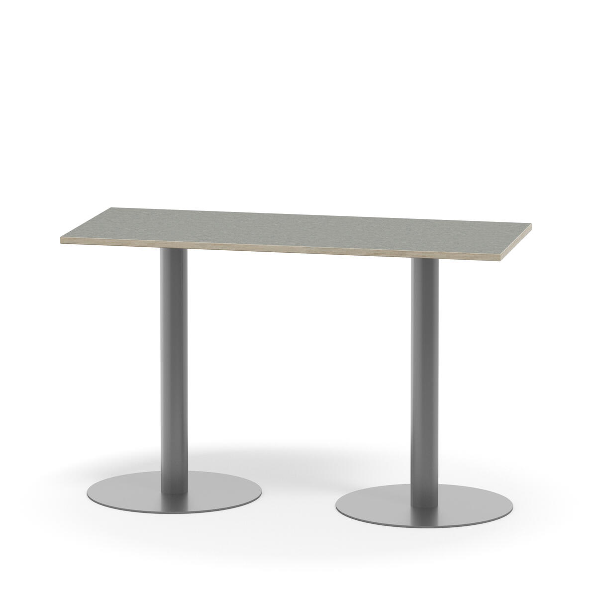 Pelarbord med lackat stativ i RAL 9006. Bordsskiva med ljuddämpande yta i tåligt linoleum. Testat och godkänt enligt EN 15372:2016 som uppfyller krav för stabiltet, hållbarhet och säkerhet.