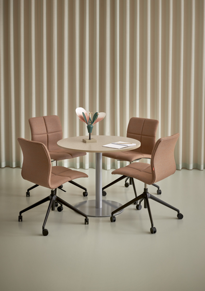 Pelarbord med lackat stativ i RAL 9005. Bordsskiva med ljuddämpande yta i tåligt linoleum. Testat och godkänt enligt EN 15372:2016 som uppfyller krav för stabiltet, hållbarhet och säkerhet.