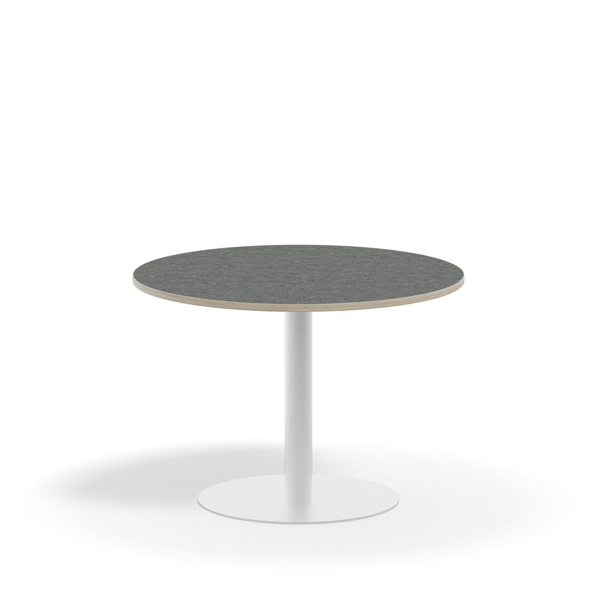 Pelarbord med lackat stativ i RAL 9003. Bordsskiva med ljuddämpande yta i tåligt linoleum. Testat och godkänt enligt EN 15372:2016 som uppfyller krav för stabiltet, hållbarhet och säkerhet.