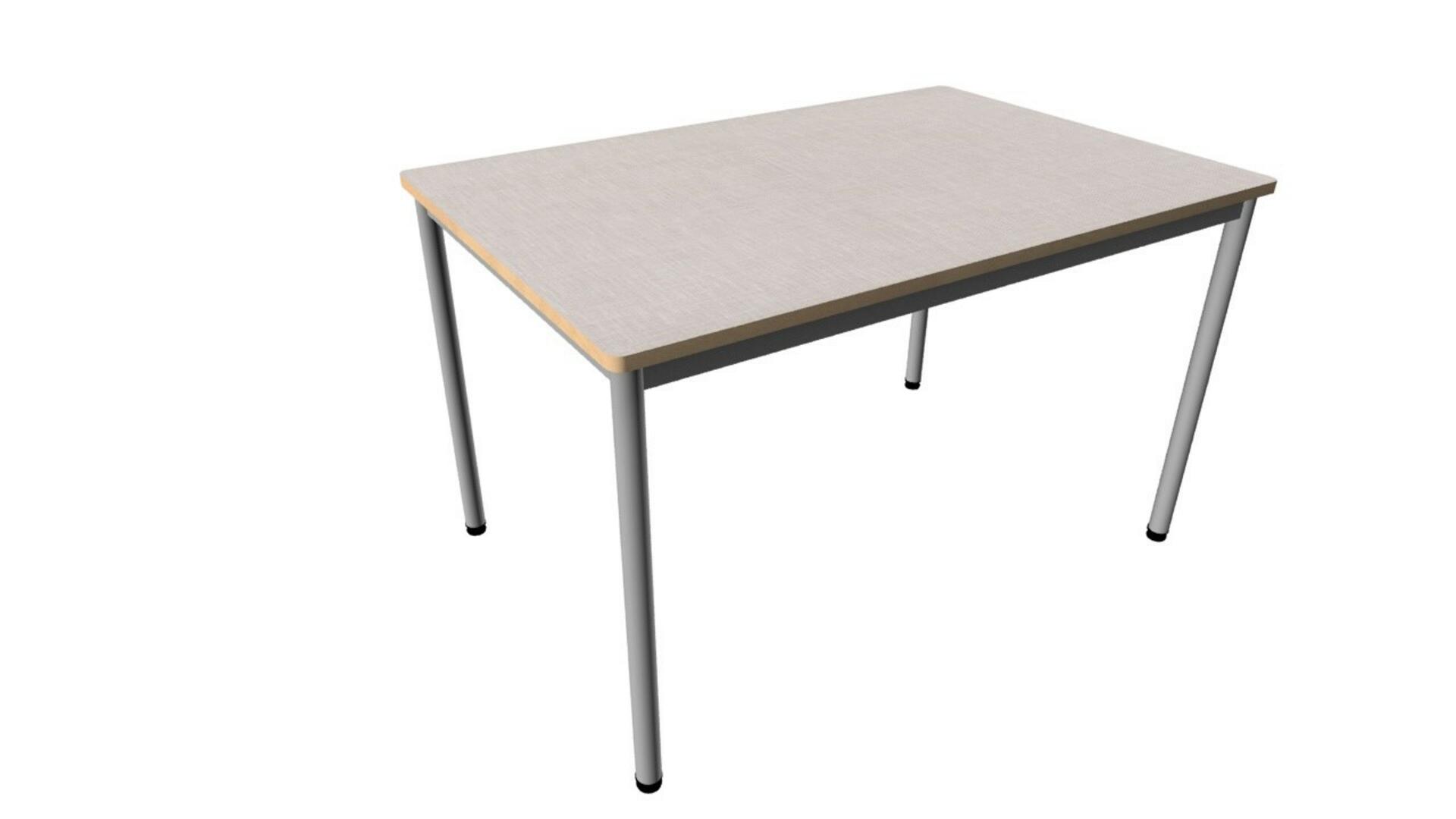 Skiva i akustiklaminat. Rundade hörn på skivan, 5 cm radie. Björkmönstrad ABS-kantlist. 4 cm hög sarg. Silverlackerat stålstativ med avtagbara runda ben i ø 4 cm. Ställbara tassar och förstärkt gods i infästningen.