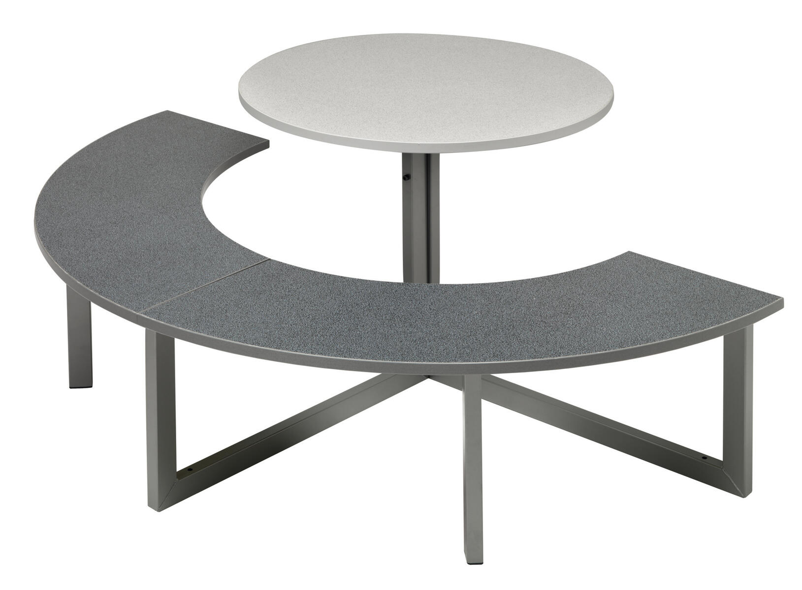 Halvrund sittbänk och bordsskiva inkl. stativ. Sitt- och bordsyta belagd med högtryckslaminat.Svart på sittbänk och grå på bord. Stativ grafitgrå, RAL 9007. Levereras omonterad. Sitthöjd 47 cm, bordshöjd 74 cm. Vikt 40 kg.