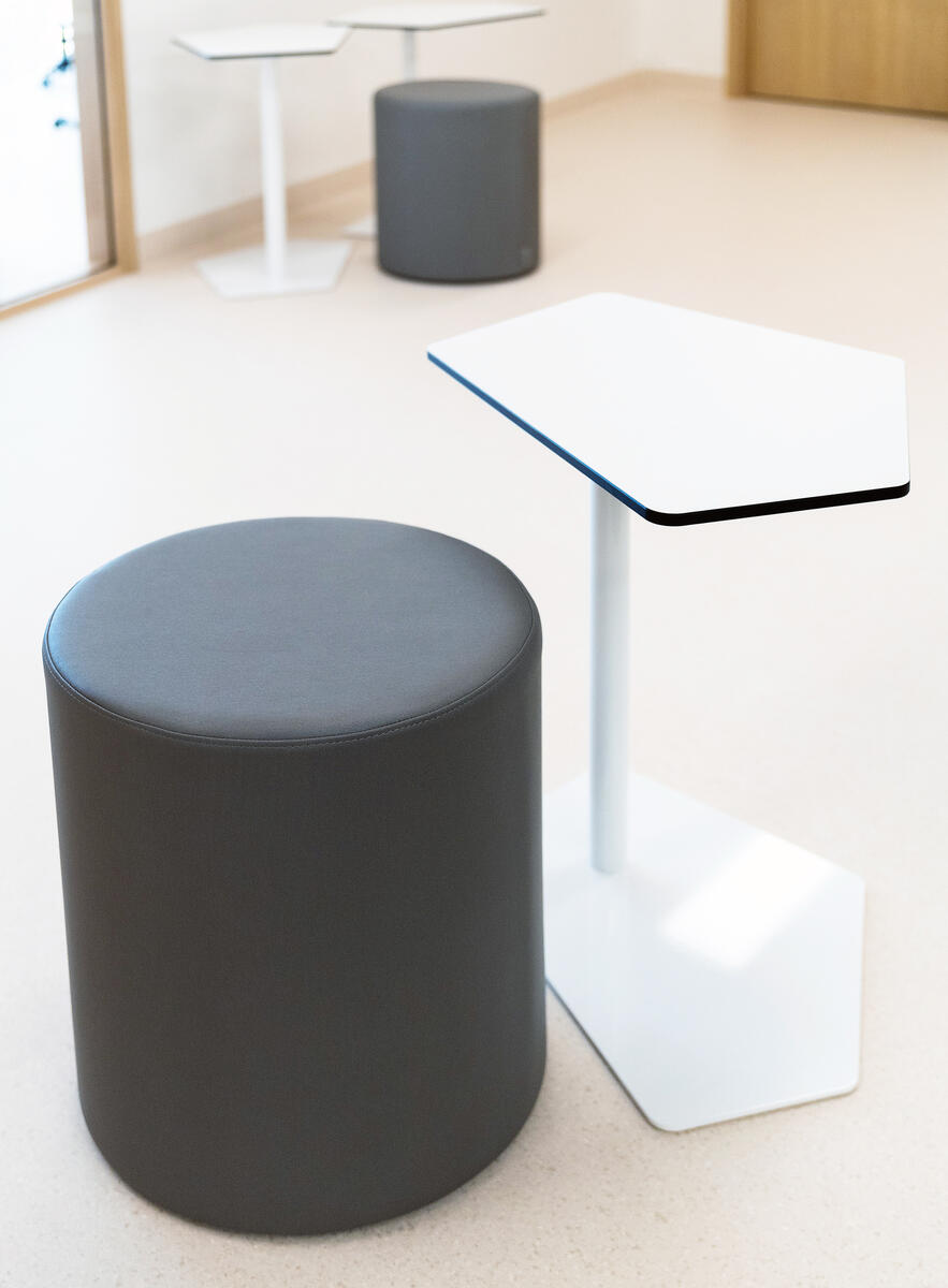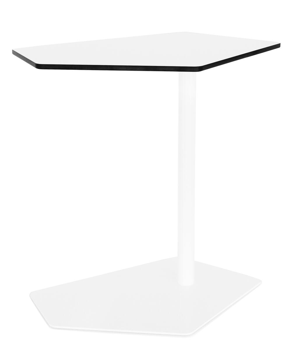 Datorbord för lärmiljöer. Flera bord kan ställas tillsammans i olika kombinationer. Mått: L64xB43xH65 cm. Radie på bordsskiva: 40 mm. Spånskiva belagd med högtryckslaminat. Vitt stålstativ.